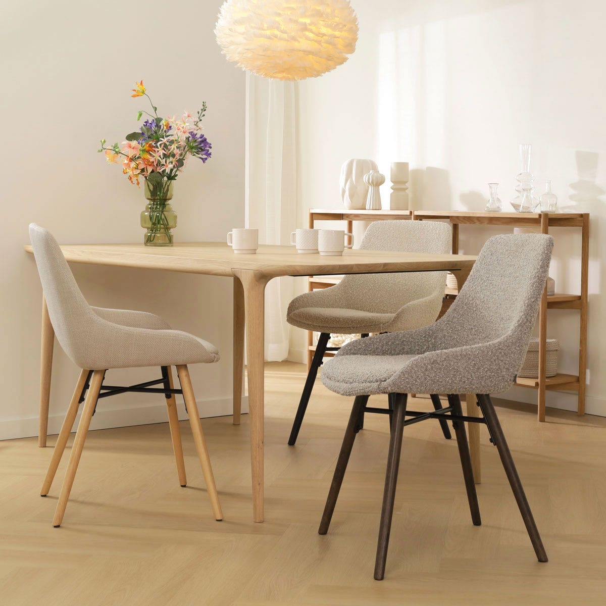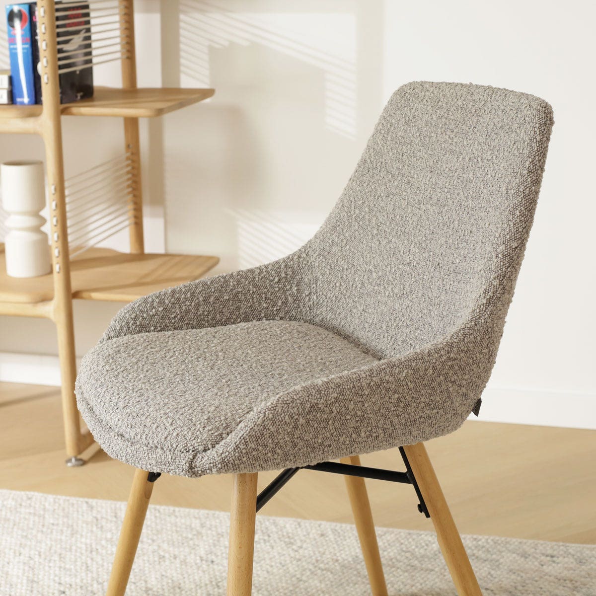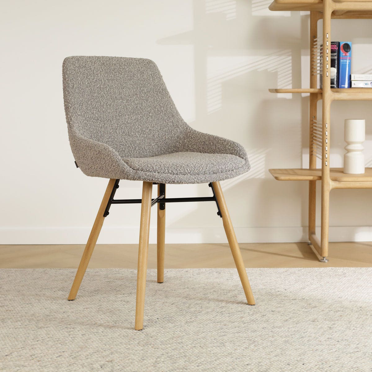 De Nena-Isa eetkamerstoel bouclé taupe met houten onderstel, van het merk Nolon, biedt een perfecte balans tussen stijl en comfort, ideaal voor elke moderne eetkamer.