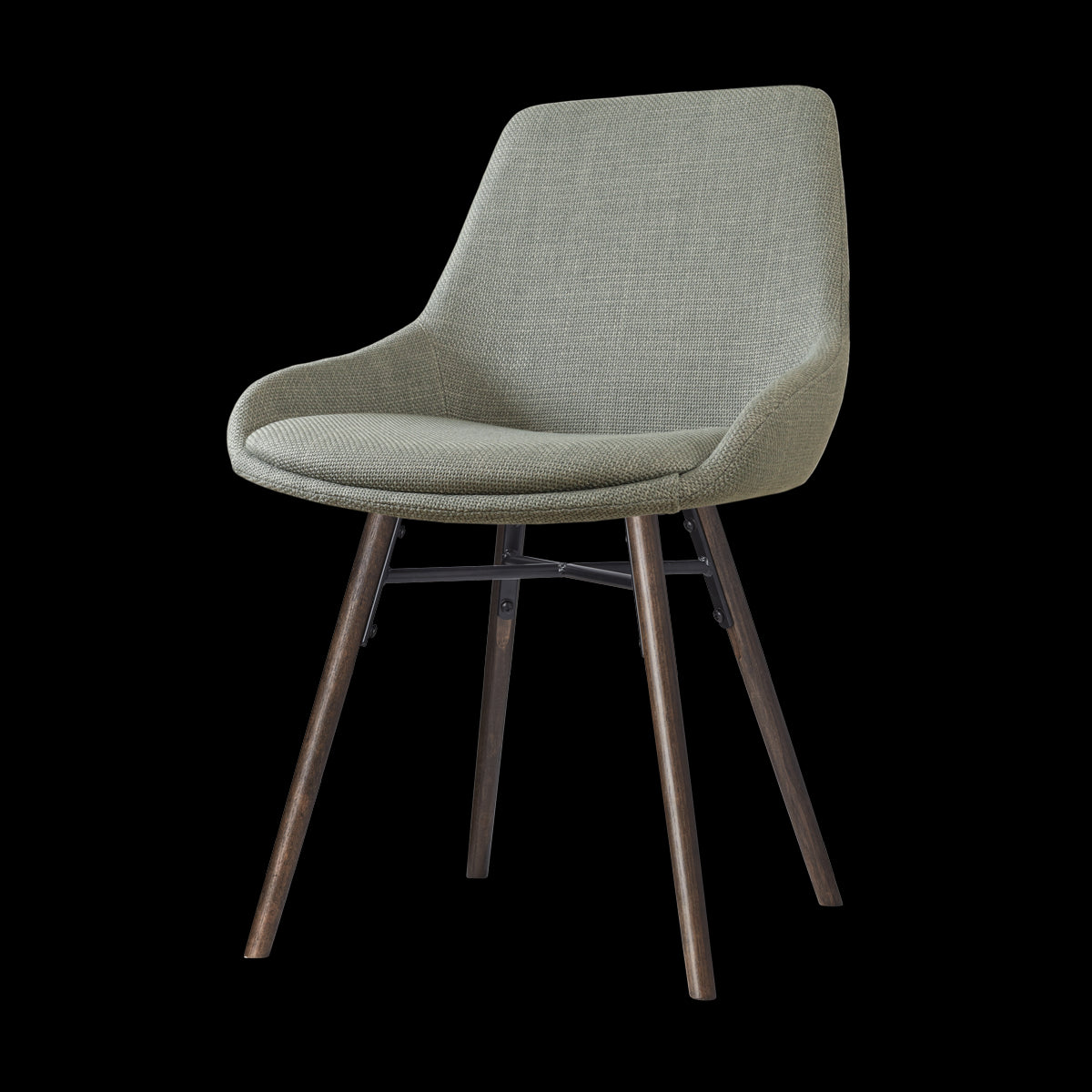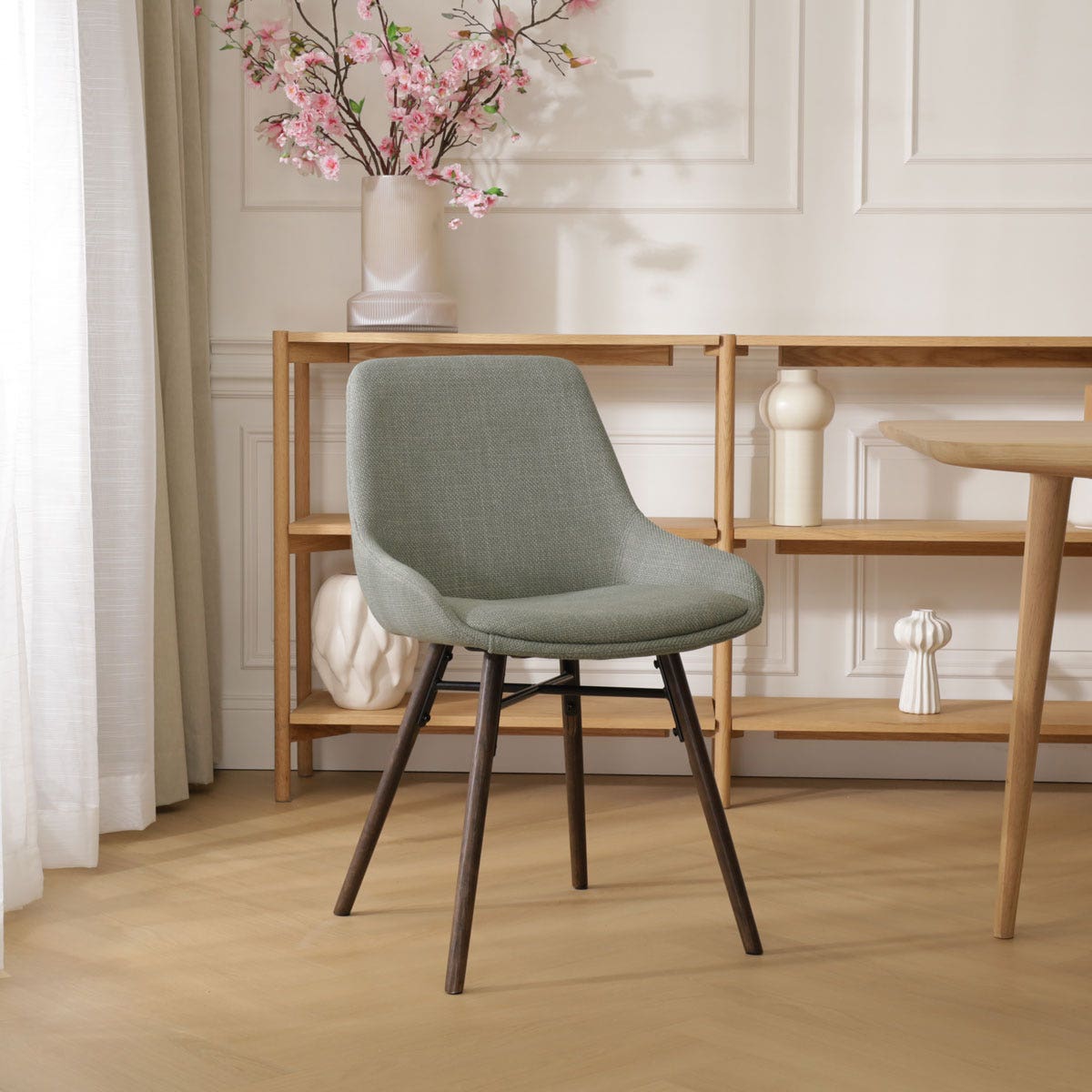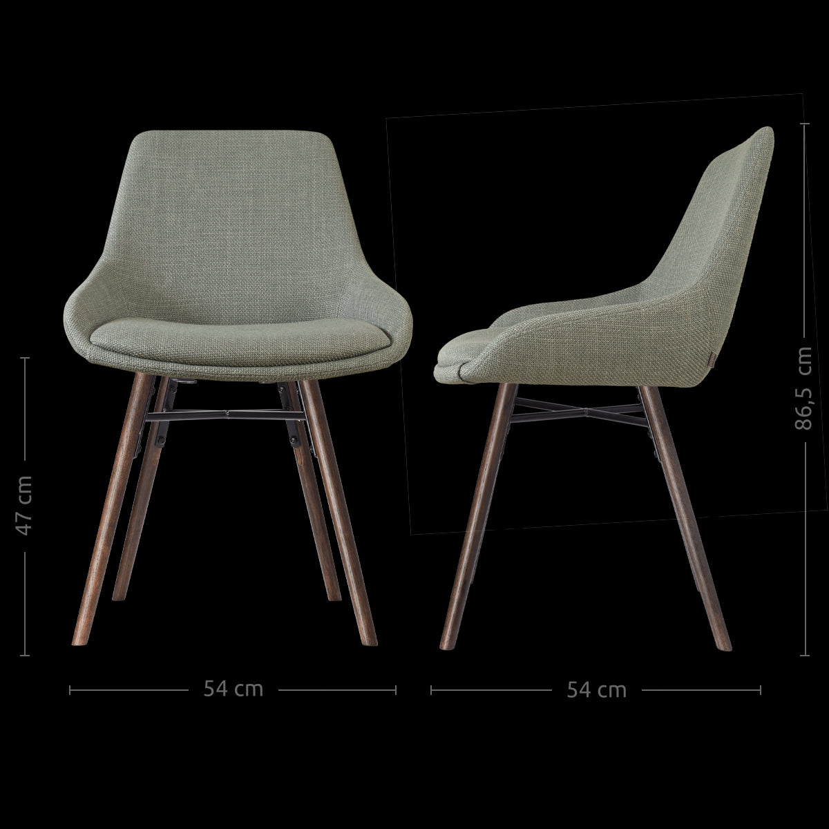 Breng een warme sfeer en functioneel design naar je eetkamer met de Nena-Isa eetkamerstoel in groen met een walnoot houten onderstel van Nolon.