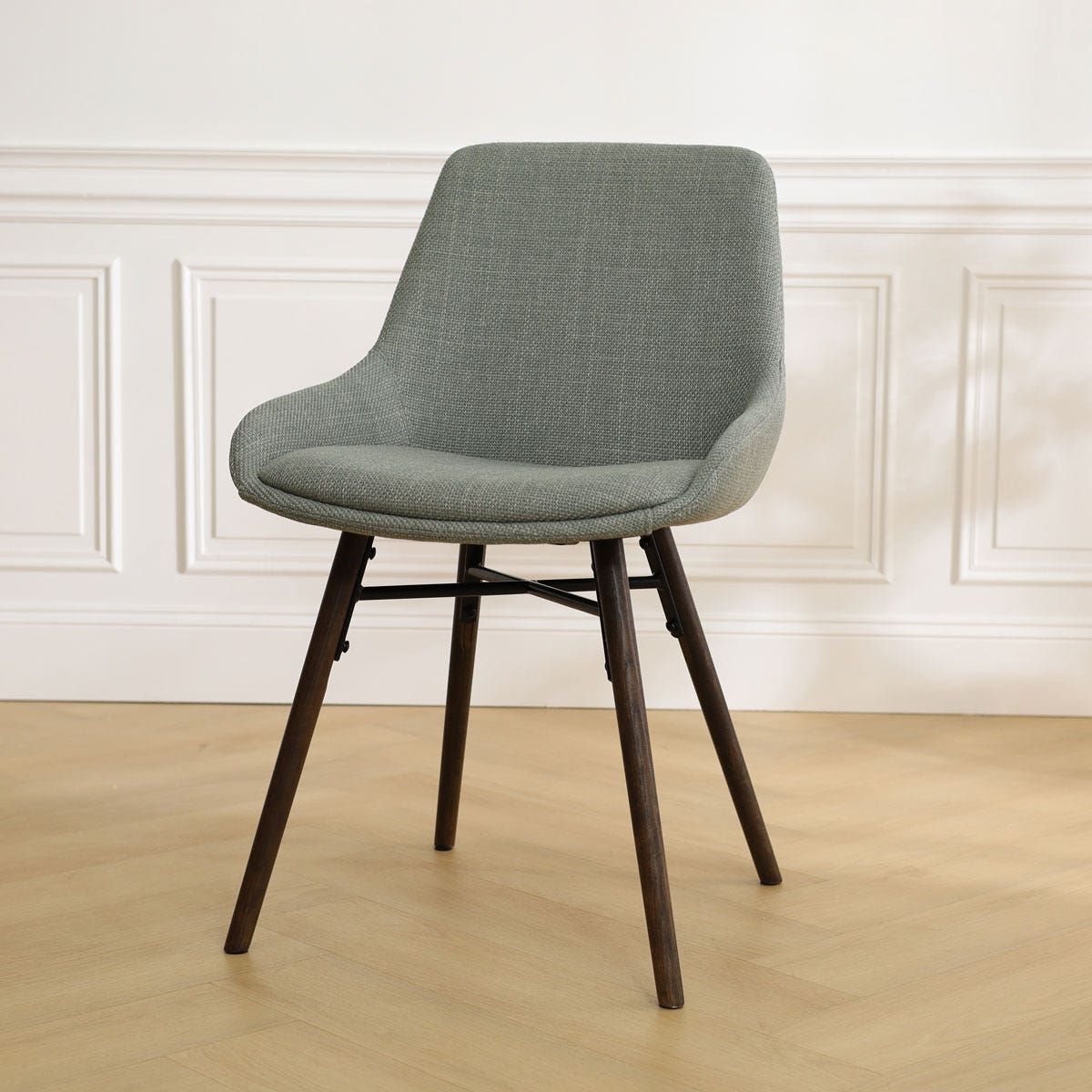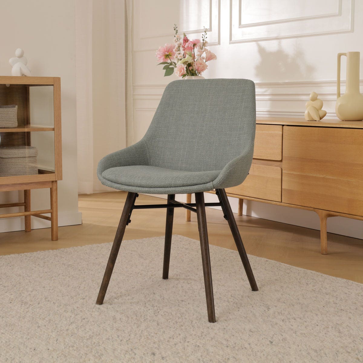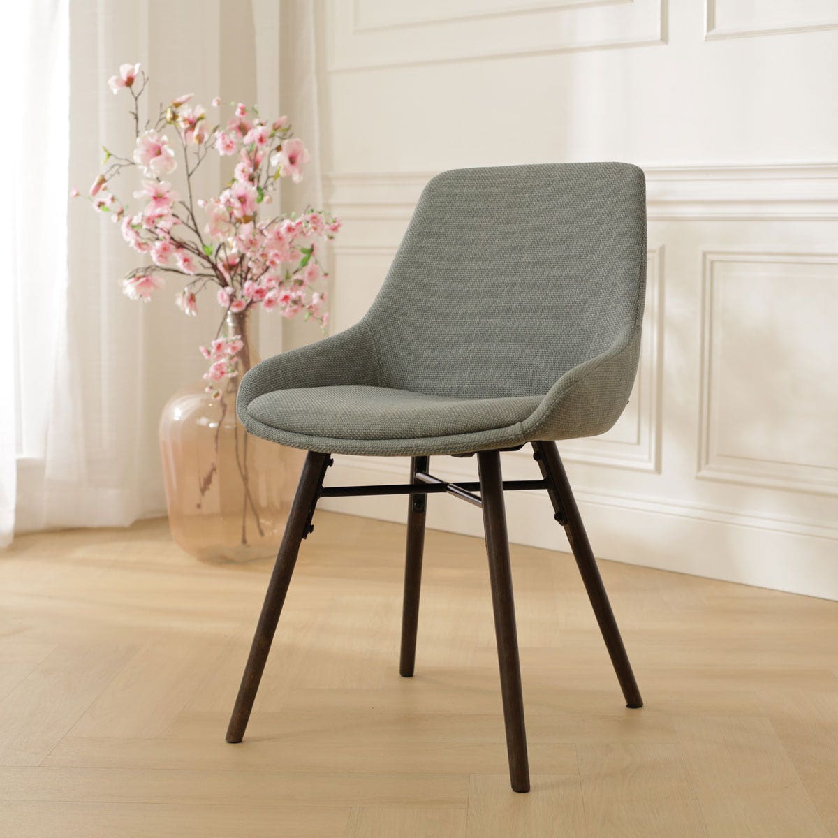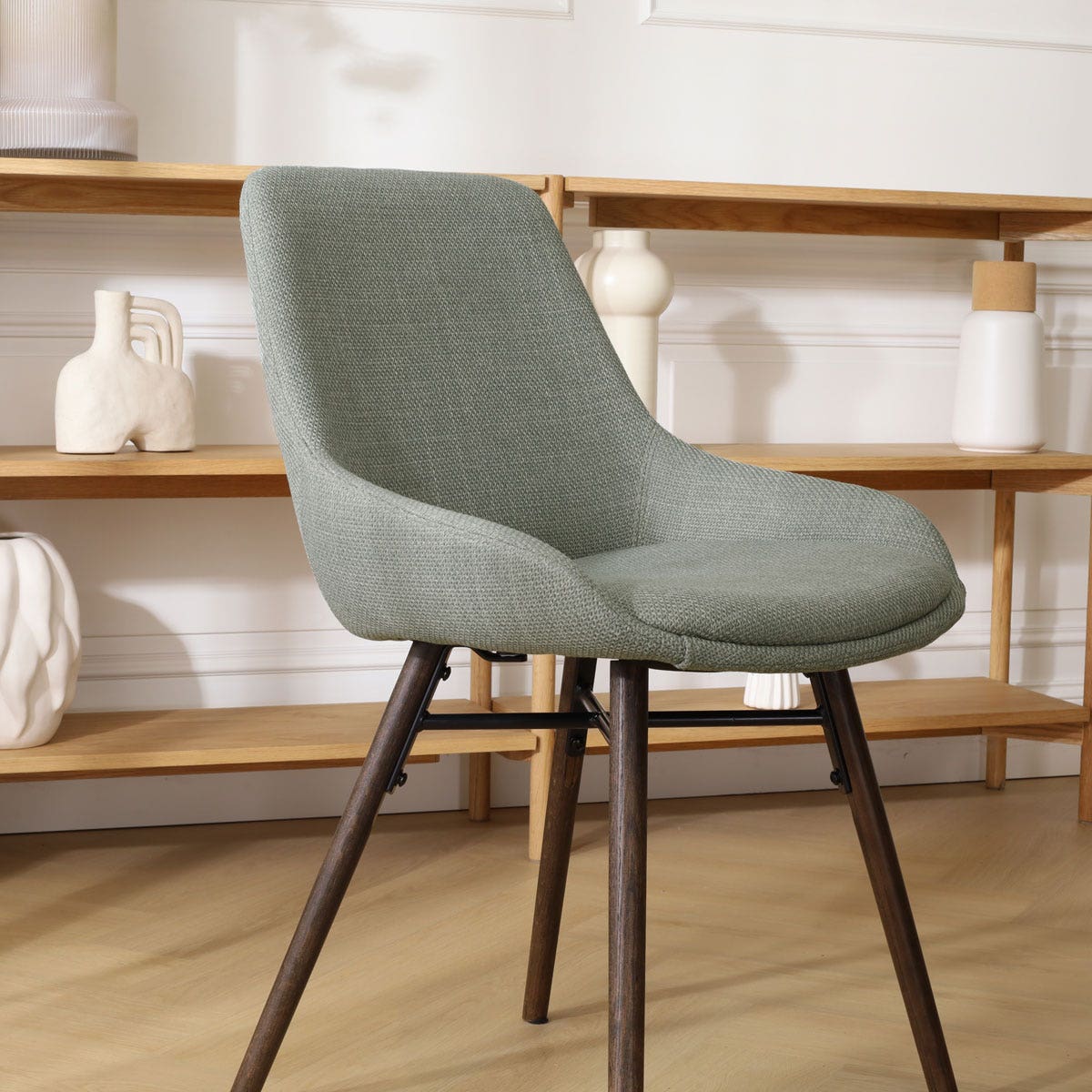 Breng een warme sfeer en functioneel design naar je eetkamer met de Nena-Isa eetkamerstoel in groen met een walnoot houten onderstel van Nolon.