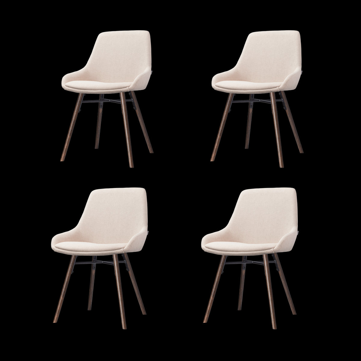 De set van vier Nena-Isa beige eetkamerstoelen met walnoot houten poten van Nolon is een ware blikvanger in elke eethoek.