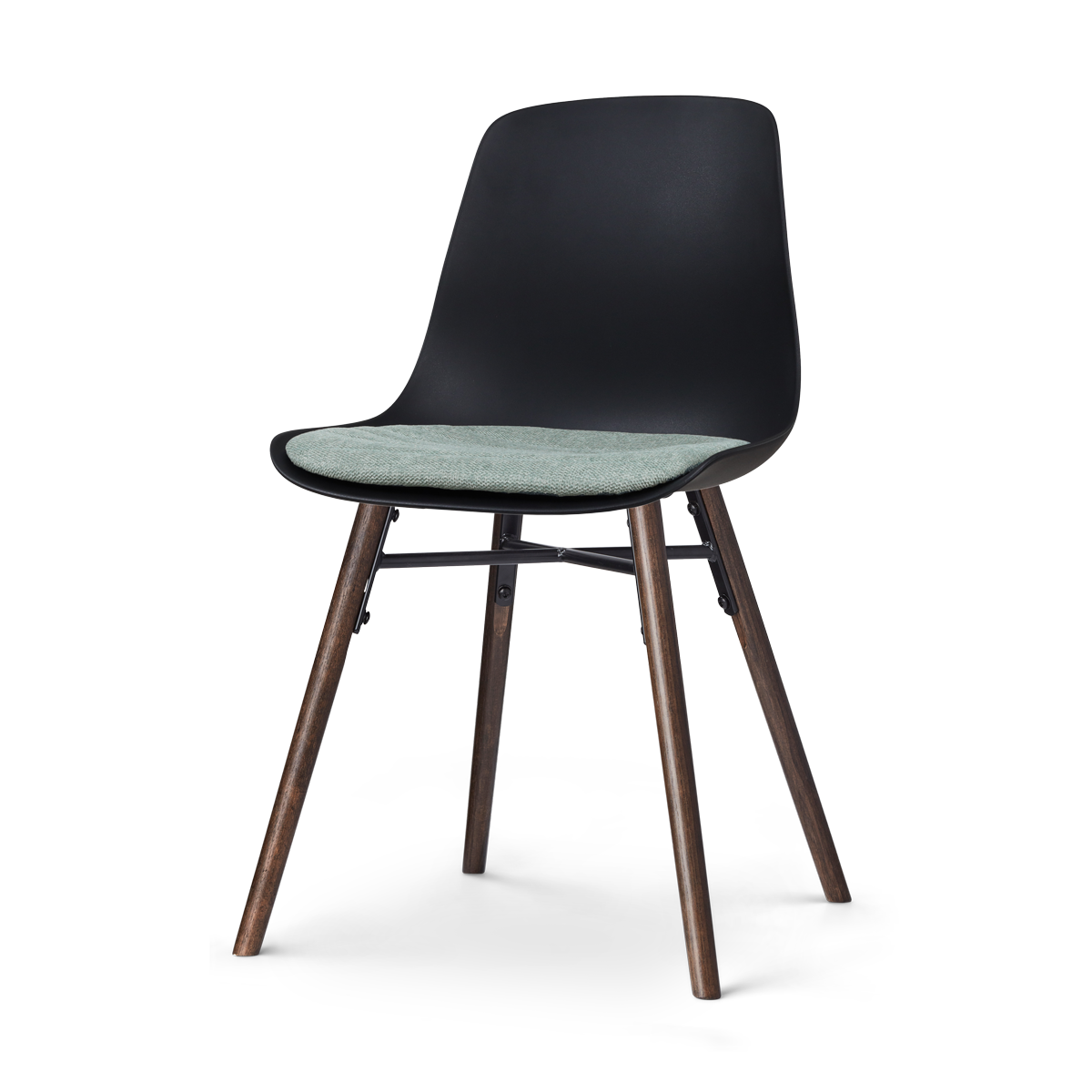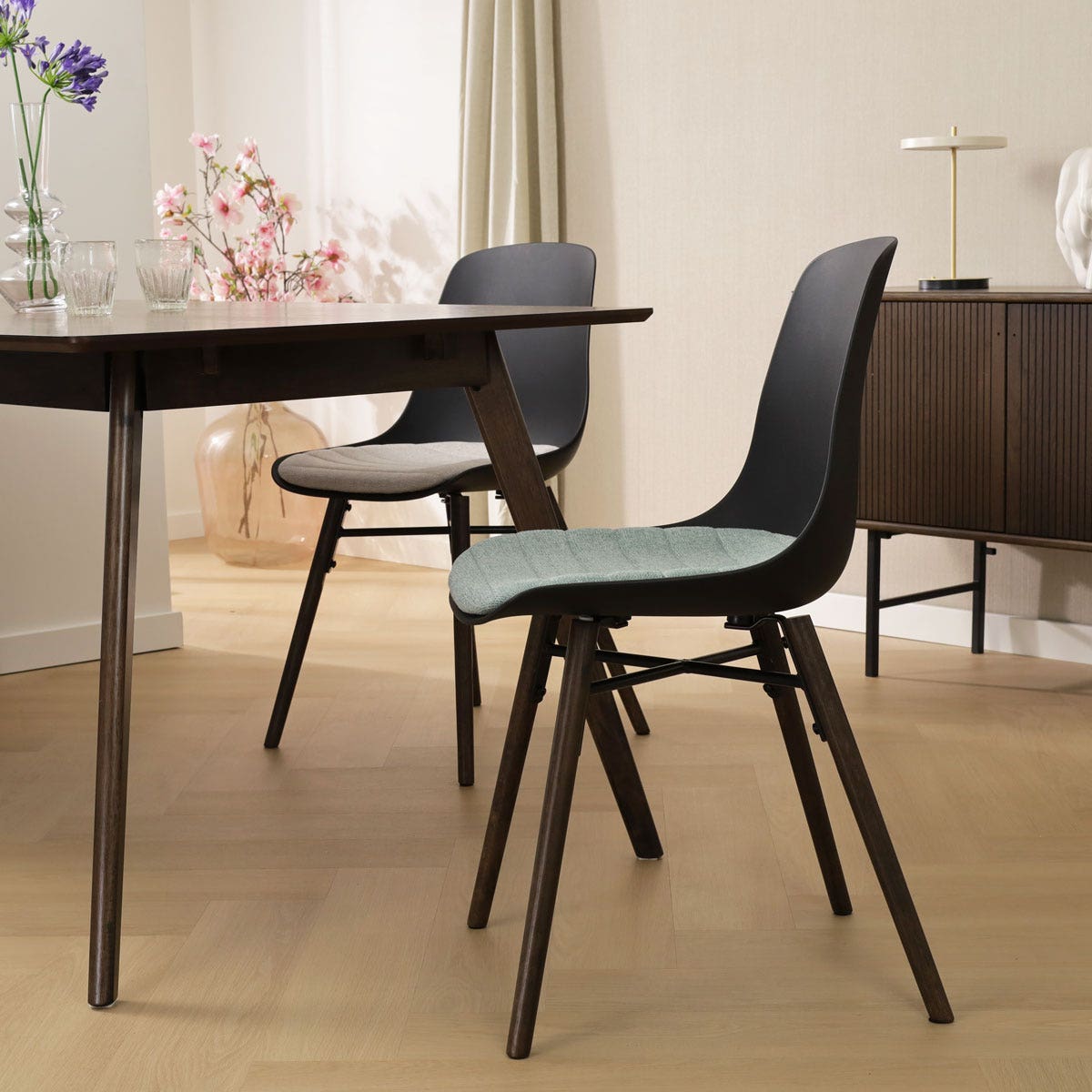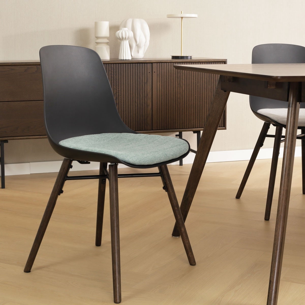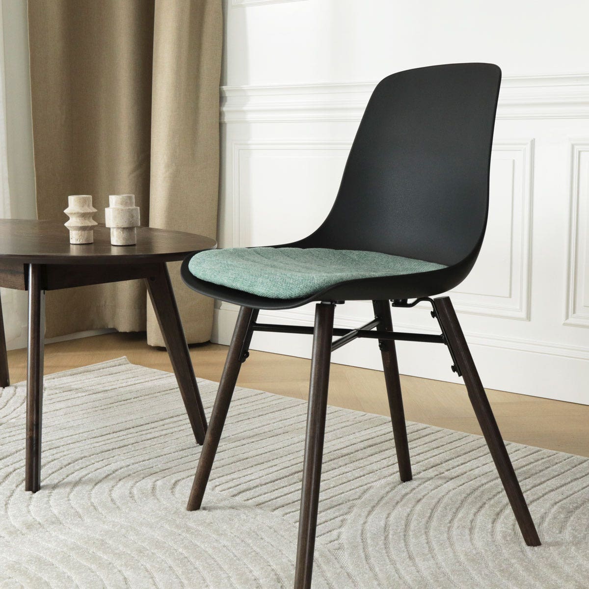 Met een gestroomlijnd ontwerp en houten poten straalt deze kunststof eetkamerstoel tijdloze elegantie uit. De duurzame kunststof zitting is niet alleen gemakkelijk schoon te maken, maar biedt ook een stevige en comfortabele basis. Dankzij de eikenhouten poten in walnoot kleur staat de stoel stabiel op de vloer en straalt hij warmte uit in de eethoek. Het vaste zitkussen van hoogwaardige stof zorgt voor extra zitcomfort, waardoor deze eetkamerstoel de ideale keuze is voor langdurige gesprekken en ontspannen dineren. Met twee kleuren kunststof zitting en vijf verschillende kleuren zitkussen zit er vast een geschikte eetkamerstoel voor jouw interieur bij.