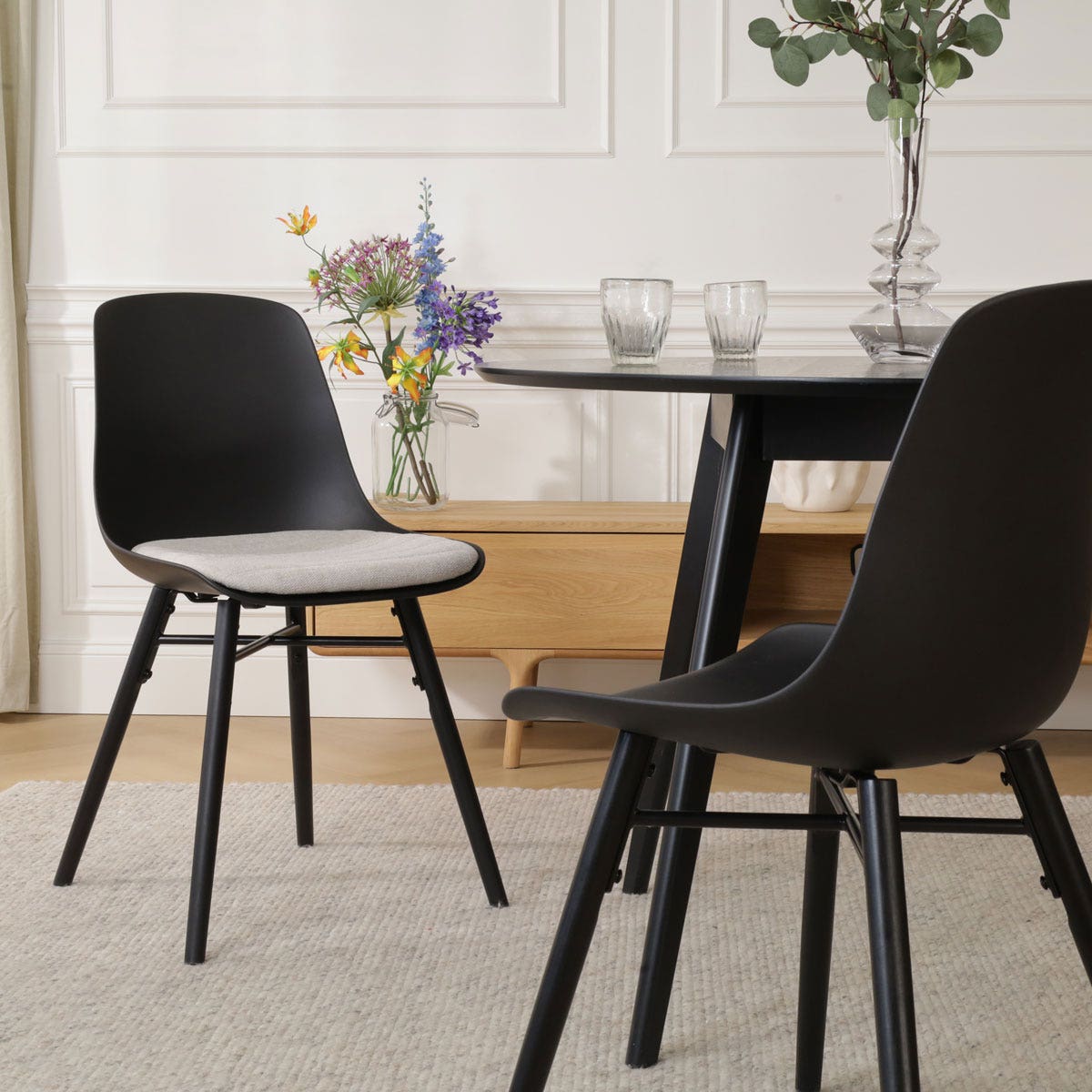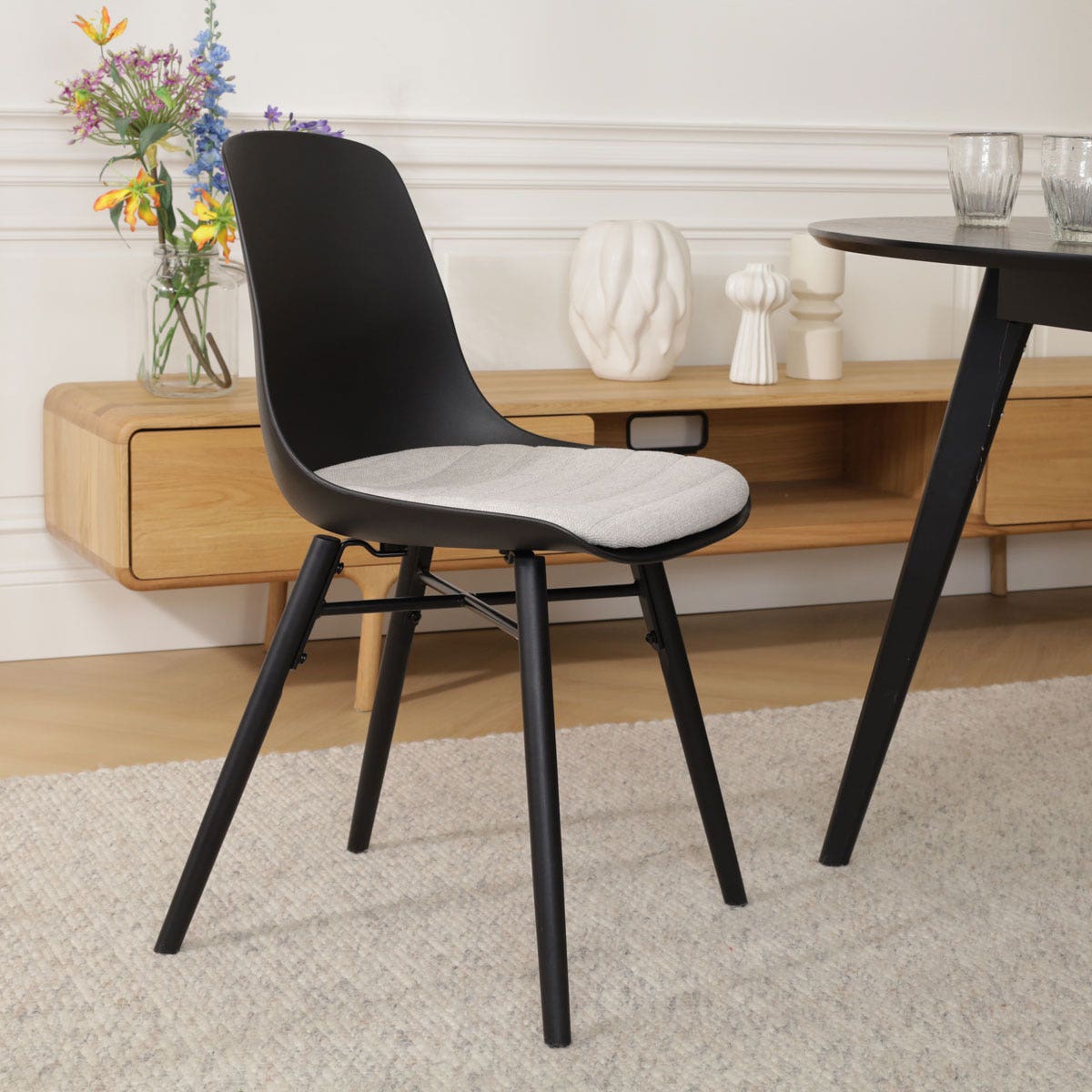 Deze eetkamerstoel combineert hout en kunststof op stijlvolle wijze in het tijdloze design. Het zwarte houten onderstel is voorzien van een metalen kruisverbinding tussen de poten en straalt moderniteit uit. De kunststof zitting geeft deze stoel een duurzaam en onderhoudsvriendelijk karakter, en is stijlvol vormgegeven met ronde vormen. Het vaste zitkussen is bekleed met zachte stof en voegt extra comfort toe aan je zitervaring tijdens lange maaltijden of gezellige avonden. De Nena-Liv eetkamerstoel maakt deel uit van de uitgebreide collectie Nolon eetkamerstoelen, waarbij zowel het onderstel als de zitting beschikbaar zijn in diverse combinaties. Voor extra zitcomfort kun je deze eetkamerstoel combineren met het Fem zitkussen van Nolon.