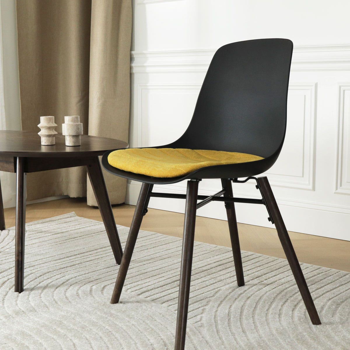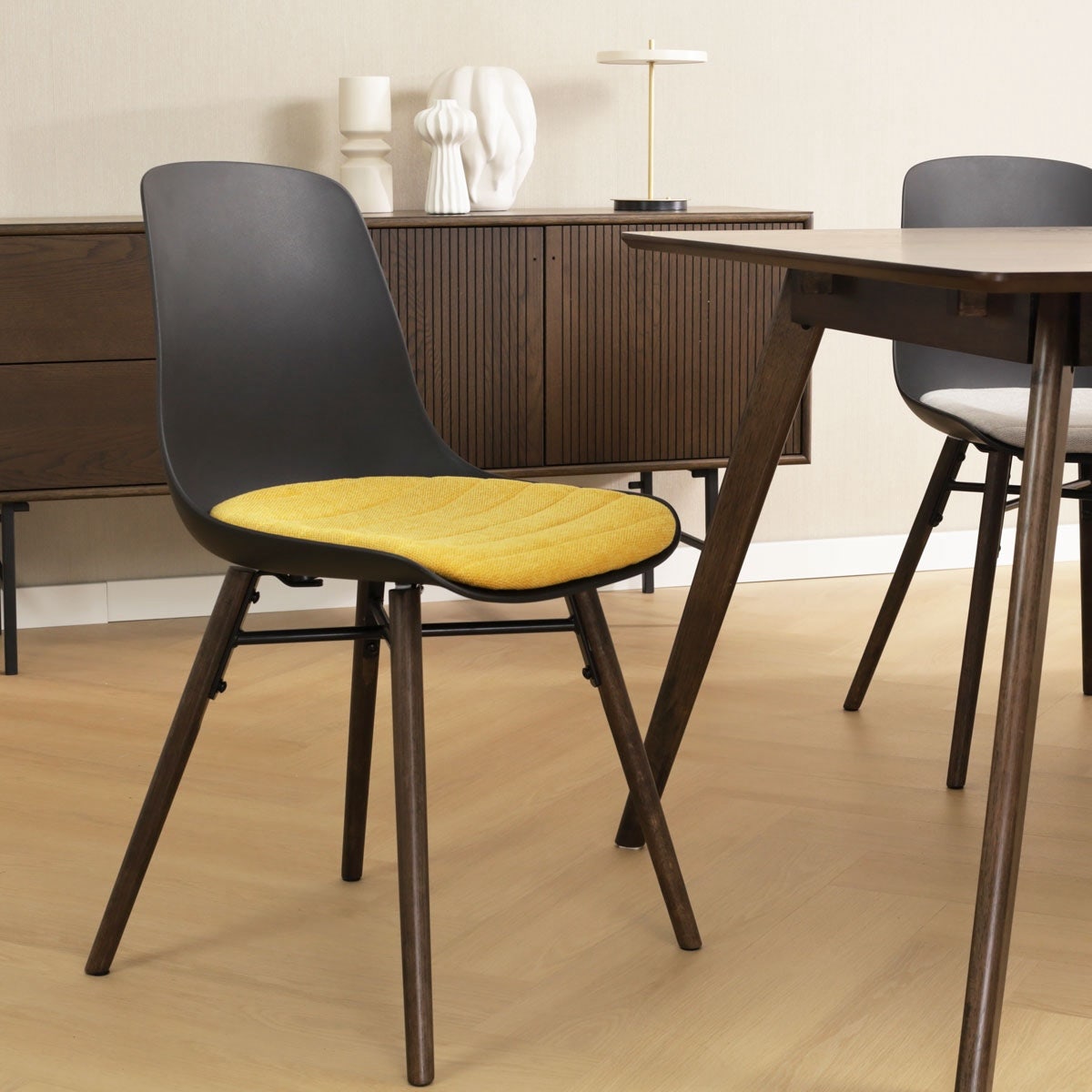 Met een gestroomlijnd ontwerp en houten poten straalt deze kunststof eetkamerstoel tijdloze elegantie uit. De duurzame kunststof zitting is niet alleen gemakkelijk schoon te maken, maar biedt ook een stevige en comfortabele basis. Dankzij de eikenhouten poten in walnoot kleur staat de stoel stabiel op de vloer en straalt hij warmte uit in de eethoek. Het vaste zitkussen van hoogwaardige stof zorgt voor extra zitcomfort, waardoor deze eetkamerstoel de ideale keuze is voor langdurige gesprekken en ontspannen dineren. Met twee kleuren kunststof zitting en vijf verschillende kleuren zitkussen zit er vast een geschikte eetkamerstoel voor jouw interieur bij.
