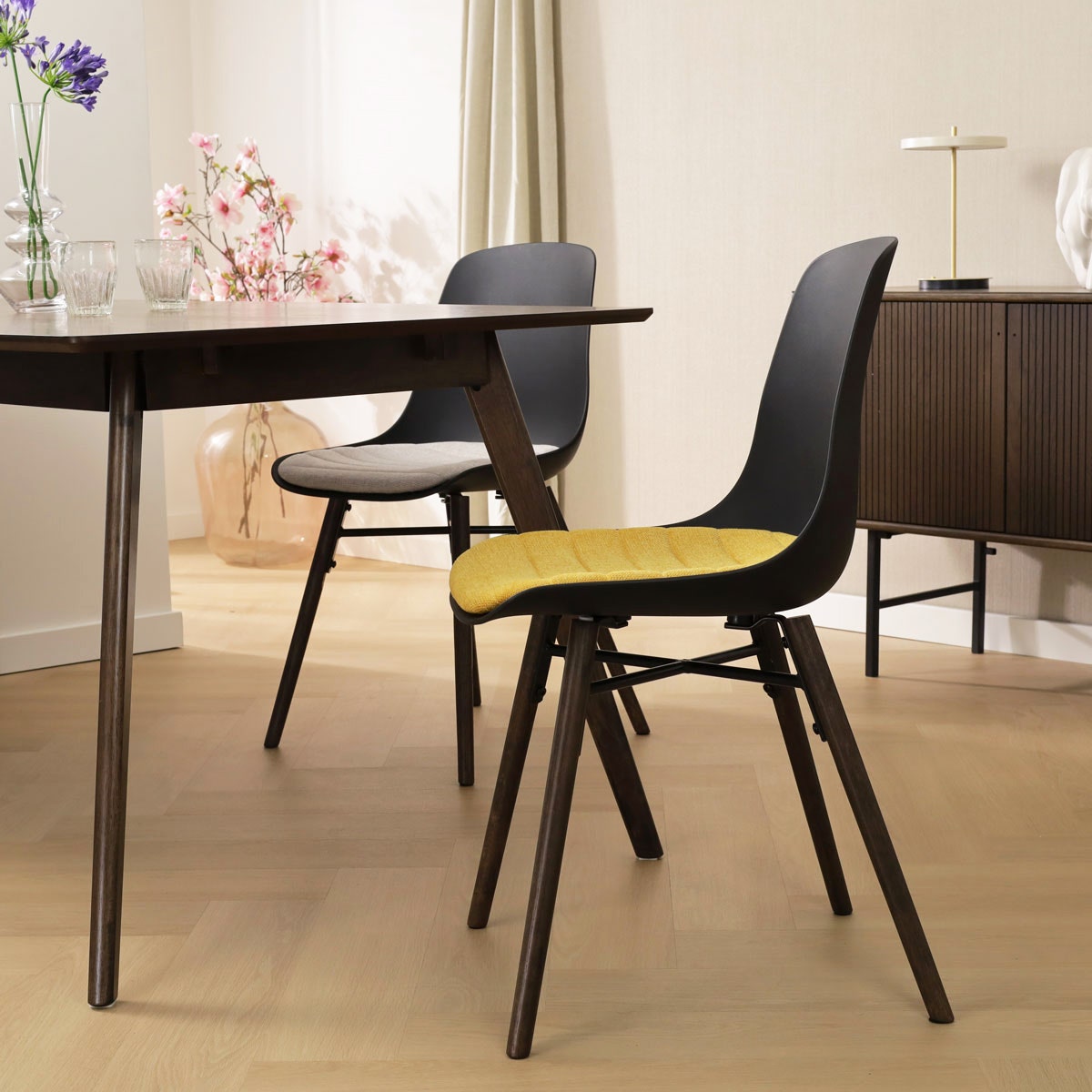 De Nena-Liv eetkamerstoel van Nolon is een eigentijdse stoel die verschillende materialen op stijlvolle wijze combineert.