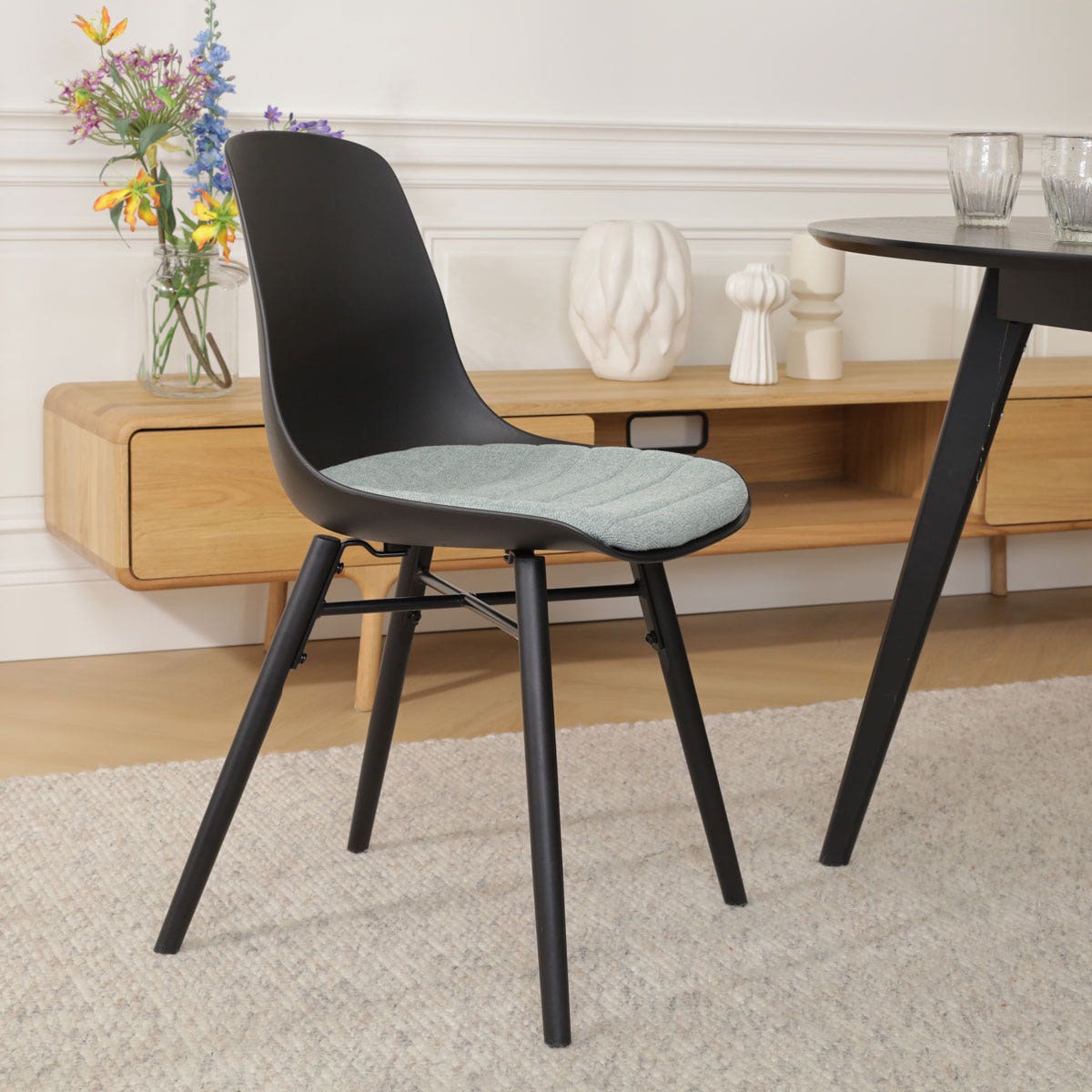 Deze eetkamerstoel combineert hout en kunststof op stijlvolle wijze in het tijdloze design. Het zwarte houten onderstel is voorzien van een metalen kruisverbinding tussen de poten en straalt moderniteit uit. De kunststof zitting geeft deze stoel een duurzaam en onderhoudsvriendelijk karakter, en is stijlvol vormgegeven met ronde vormen. Het vaste zitkussen is bekleed met zachte stof en voegt extra comfort toe aan je zitervaring tijdens lange maaltijden of gezellige avonden. De Nena-Liv eetkamerstoel maakt deel uit van de uitgebreide collectie Nolon eetkamerstoelen, waarbij zowel het onderstel als de zitting beschikbaar zijn in diverse combinaties. Voor extra zitcomfort kun je deze eetkamerstoel combineren met het Fem zitkussen van Nolon.