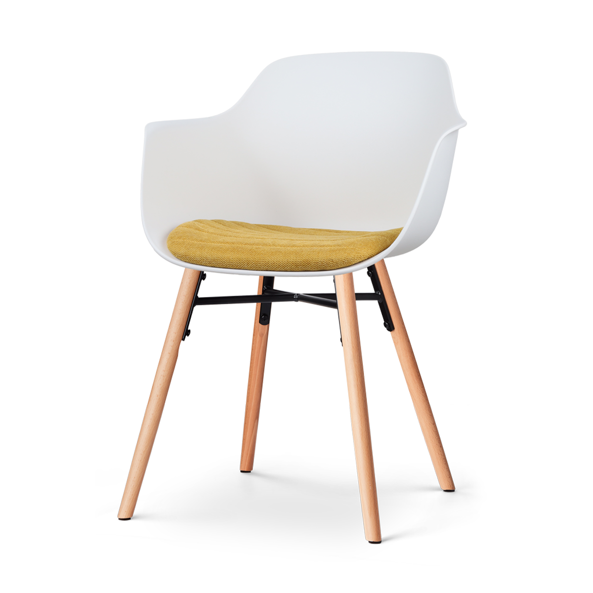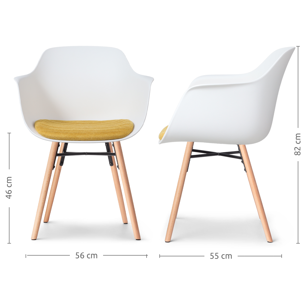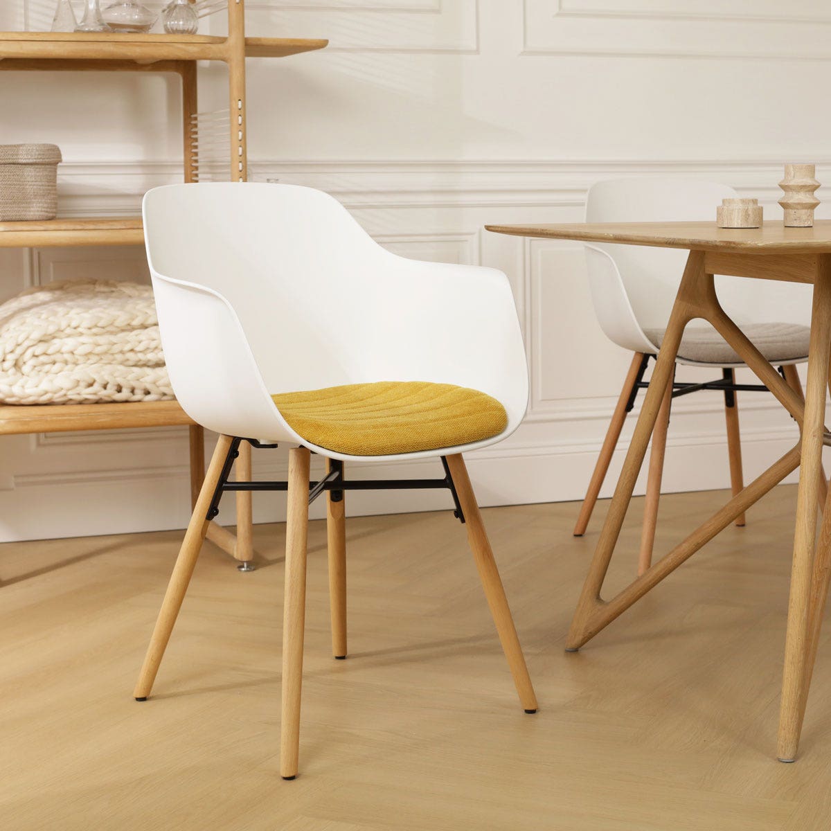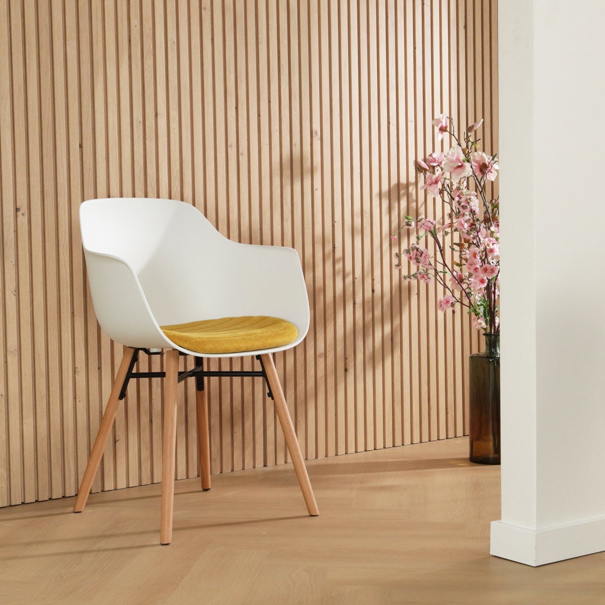 De ergonomische vorm en het doordachte design maken van de Nena-Liz de ideale keuze voor je eethoek. Deze eetkamerstoel combineert een functionele kunststof zitting met een sfeervol houten onderstel. De beukenhouten poten hebben een naturel houtkleur en worden verstevigd door een zwarte metalen kruisverbinding bovenin. De zitting is gemaakt van door en door gekleurd kunststof, waardoor de stoel bestand is tegen krassen en beschadigingen. Dankzij de flexibele kunststof kuip en de armleuningen kan je een ontspannen zithouding aannemen, terwijl het vaste zitkussen bekleed met hoogwaardige stof ervoor zorgt dat je lekker zacht zit. Het leuke aan de Nena-Liz eetkamerstoel is dat je zelf kan bepalen hoe hij eruitziet. Maak een keuze uit de witte of zwarte zitting en kies uit vijf verschillende kleuren stof voor het vaste zitkussen om deze stoel helemaal aan jouw wensen te laten voldoen.