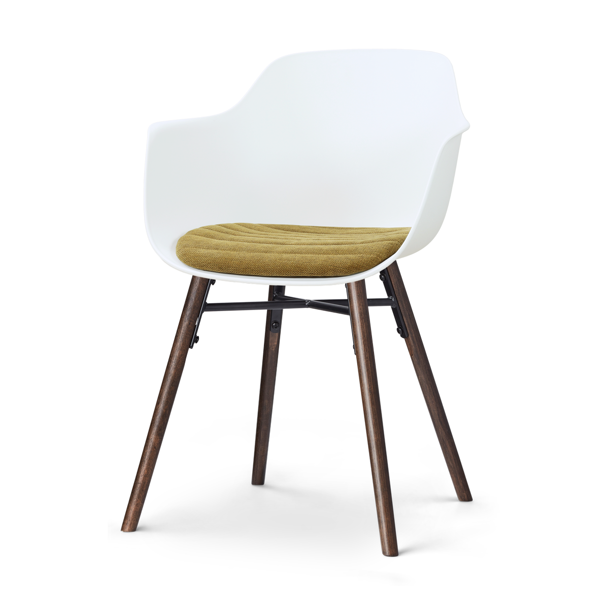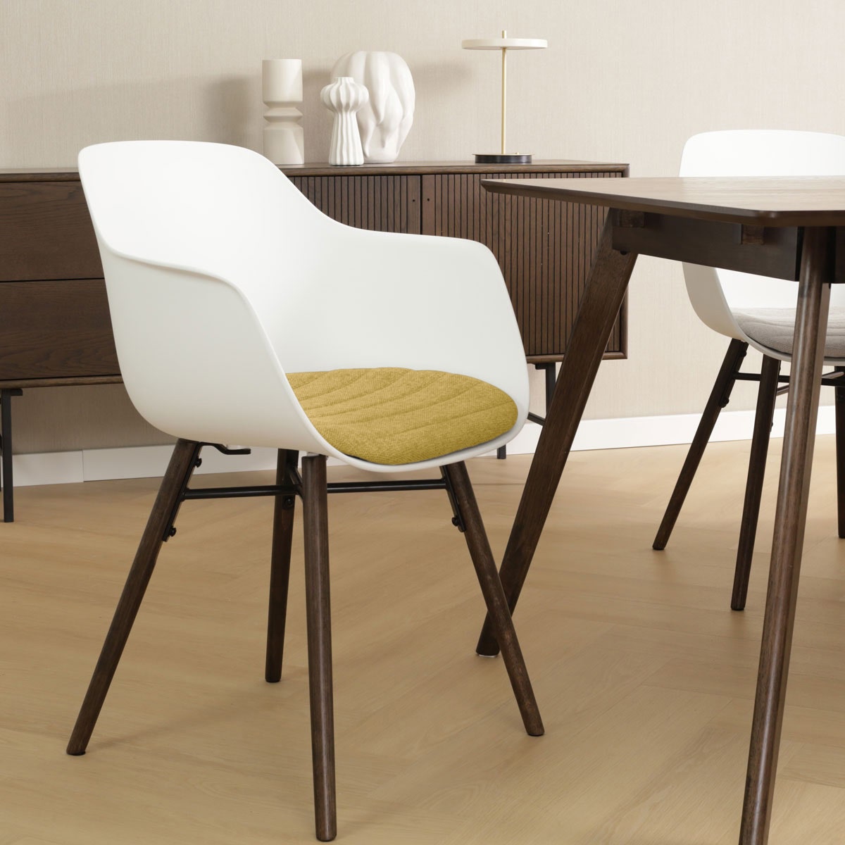De combinatie van het strakke, eigentijdse ontwerp en de warme walnoot kleur van de houten poten voegt een vleugje elegantie toe aan elke eetkamer. De kunststof zitting van deze kuipstoel is niet alleen duurzaam, maar ook nog eens erg praktisch. Maak je geen zorgen over knoeien of morsen: het gladde oppervlak is gemakkelijk af te nemen met een vochtige doek. De houten poten zijn gemaakt van eikenhout, wat bijdraagt aan de duurzaamheid en stabiliteit van de stoel. Naast de ergonomische vorm van de kunststof zitting is de eetkamerstoel ook ontworpen met armleuningen, zodat je urenlang ontspannen aan tafel kan zitten. Het vaste zitkussen gemaakt van zachte stof tilt het comfort naar een nog hoger niveau en voegt wat zachtheid toe aan het ontwerp. Deze comfortabele kuipstoel is verkrijgbaar in twee verschillende kleuren en met vier kleuren stoelkussens, waardoor je eenvoudig de perfecte combinatie kunt vinden die past bij jouw persoonlijke stijl.