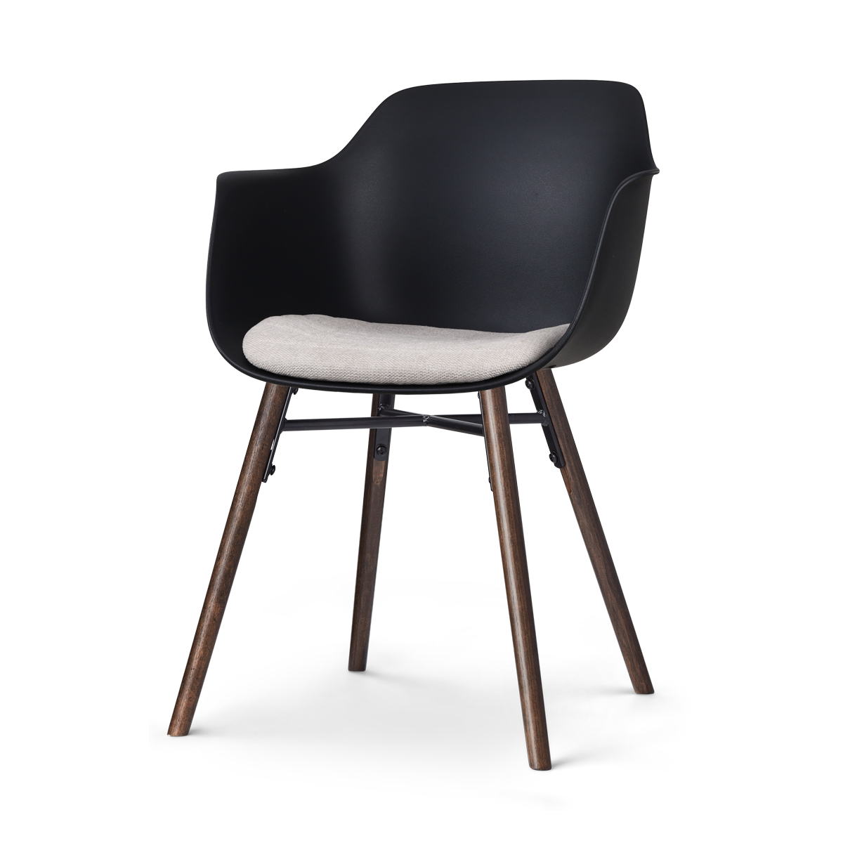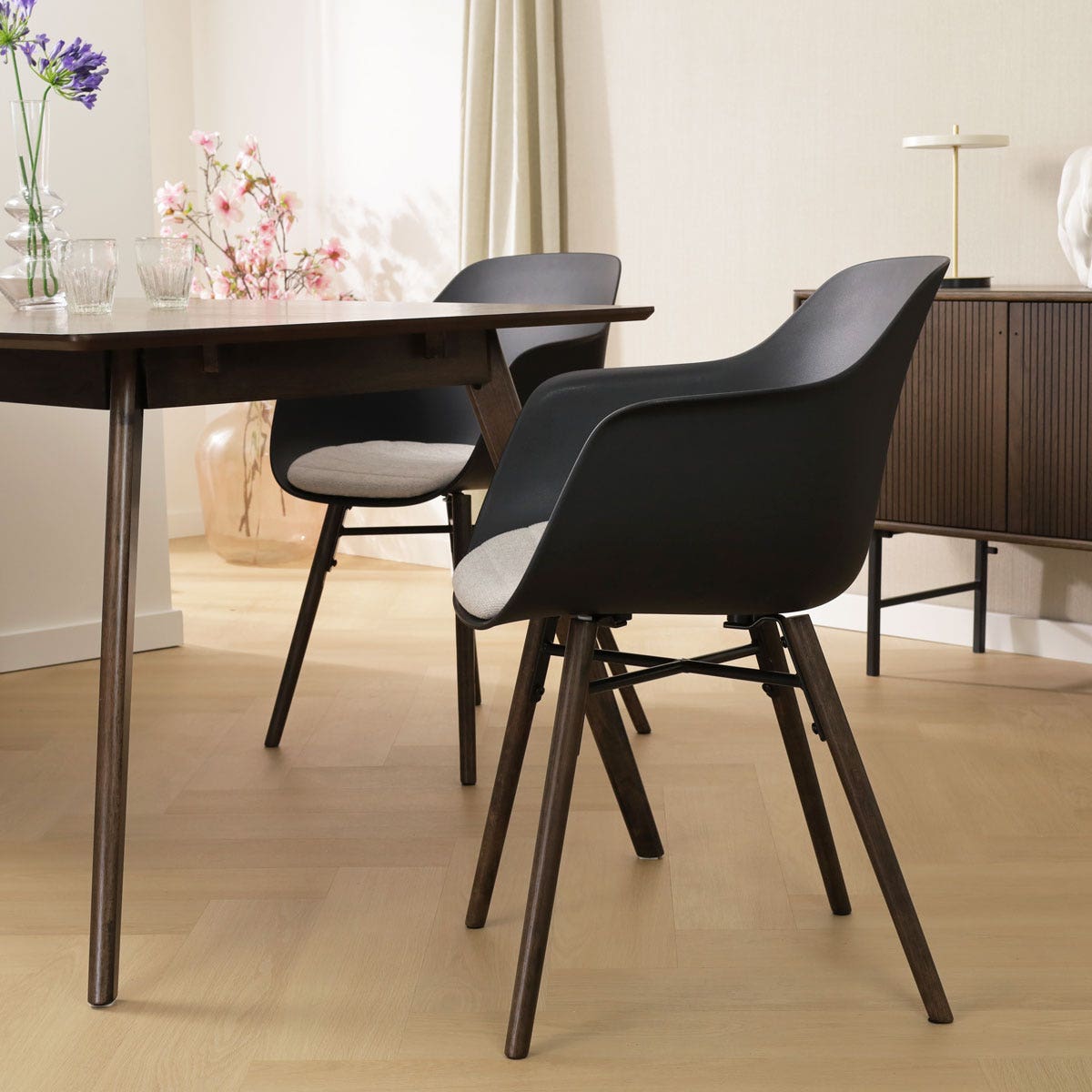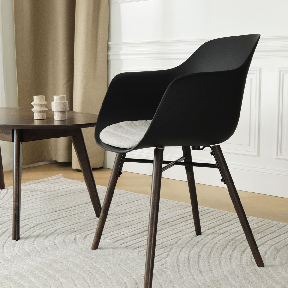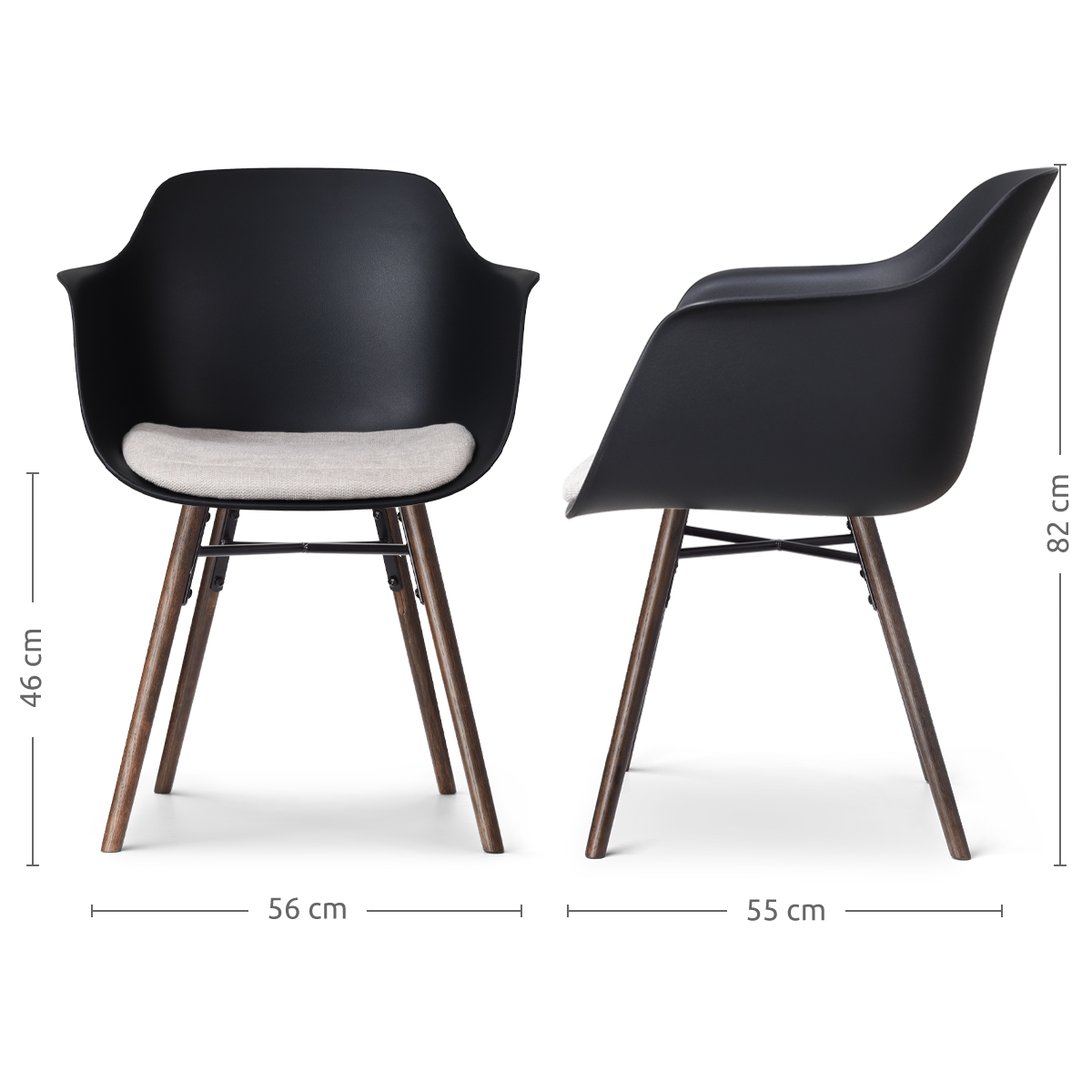 De combinatie van het strakke, eigentijdse ontwerp en de warme walnoot kleur van de houten poten voegt een vleugje elegantie toe aan elke eetkamer. De kunststof zitting van deze kuipstoel is niet alleen duurzaam, maar ook nog eens erg praktisch. Maak je geen zorgen over knoeien of morsen: het gladde oppervlak is gemakkelijk af te nemen met een vochtige doek. De houten poten zijn gemaakt van eikenhout, wat bijdraagt aan de duurzaamheid en stabiliteit van de stoel. Naast de ergonomische vorm van de kunststof zitting is de eetkamerstoel ook ontworpen met armleuningen, zodat je urenlang ontspannen aan tafel kan zitten. Het vaste zitkussen gemaakt van zachte stof tilt het comfort naar een nog hoger niveau en voegt wat zachtheid toe aan het ontwerp. Deze comfortabele kuipstoel is verkrijgbaar in twee verschillende kleuren en met vier kleuren stoelkussens, waardoor je eenvoudig de perfecte combinatie kunt vinden die past bij jouw persoonlijke stijl.
