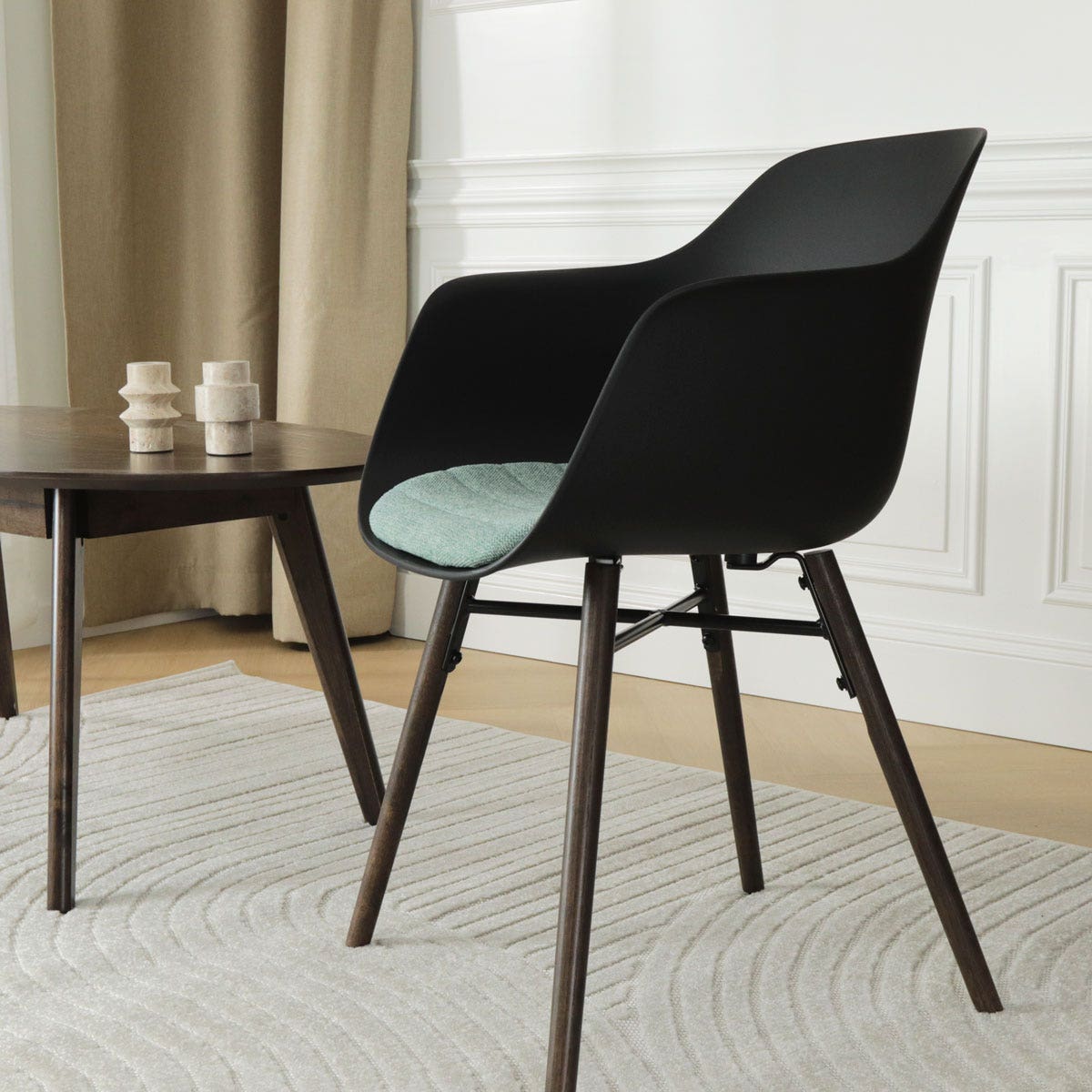 De combinatie van het strakke, eigentijdse ontwerp en de warme walnoot kleur van de houten poten voegt een vleugje elegantie toe aan elke eetkamer. De kunststof zitting van deze kuipstoel is niet alleen duurzaam, maar ook nog eens erg praktisch. Maak je geen zorgen over knoeien of morsen: het gladde oppervlak is gemakkelijk af te nemen met een vochtige doek. De houten poten zijn gemaakt van eikenhout, wat bijdraagt aan de duurzaamheid en stabiliteit van de stoel. Naast de ergonomische vorm van de kunststof zitting is de eetkamerstoel ook ontworpen met armleuningen, zodat je urenlang ontspannen aan tafel kan zitten. Het vaste zitkussen gemaakt van zachte stof tilt het comfort naar een nog hoger niveau en voegt wat zachtheid toe aan het ontwerp. Deze comfortabele kuipstoel is verkrijgbaar in twee verschillende kleuren en met vier kleuren stoelkussens, waardoor je eenvoudig de perfecte combinatie kunt vinden die past bij jouw persoonlijke stijl.