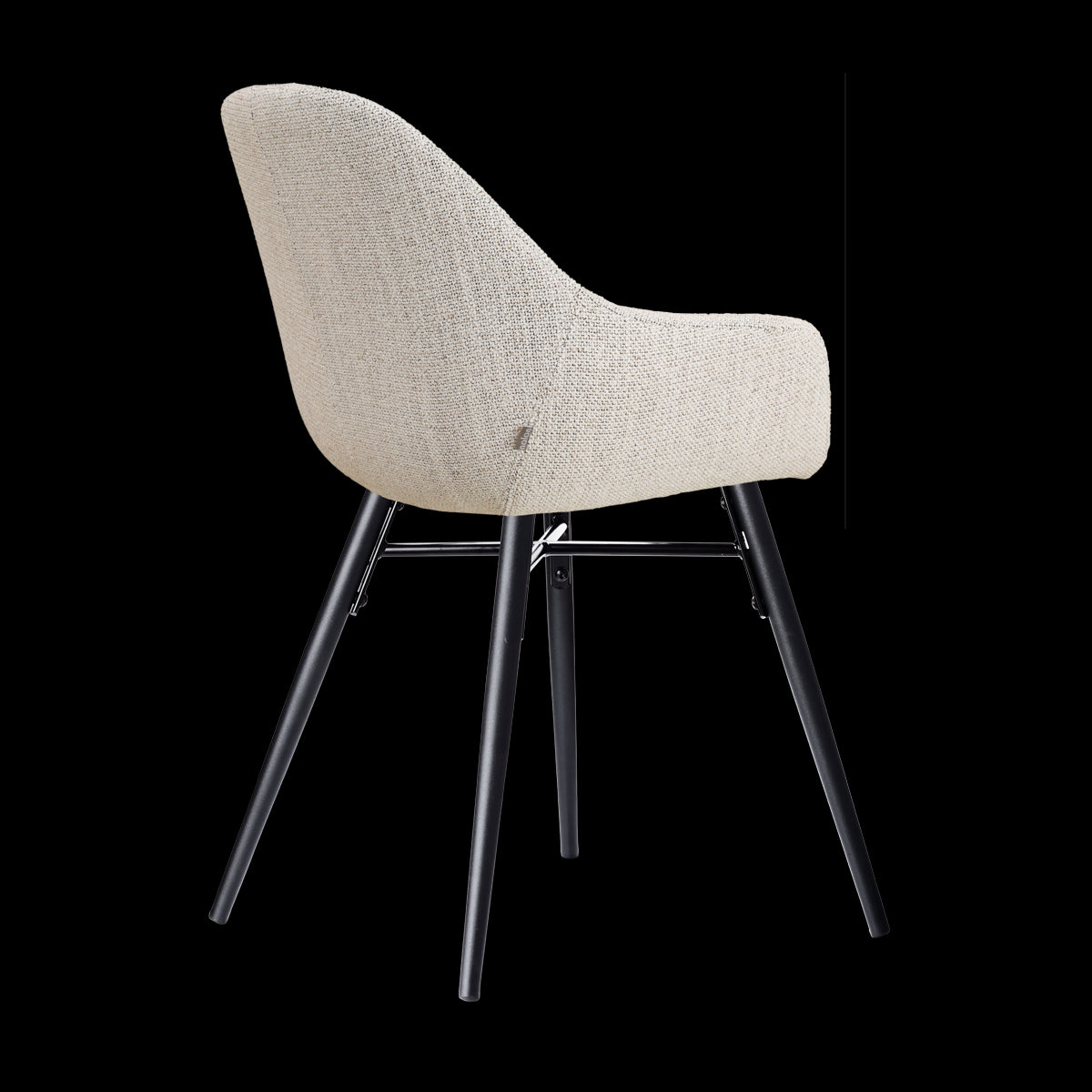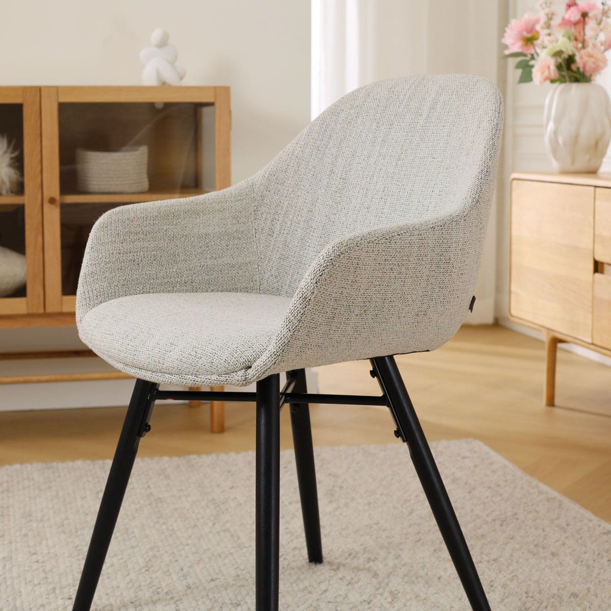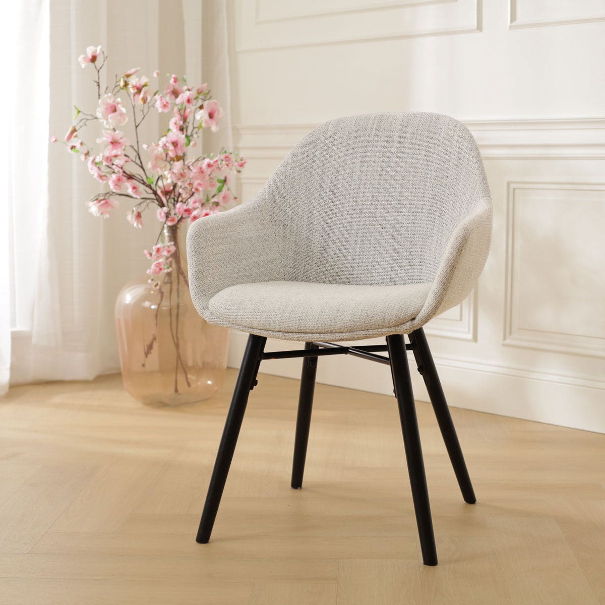 Deze prachtige eetkamerstoel heeft een beige gemêleerde zitting en zwarte poten, perfect voor een warme en moderne sfeer aan tafel. De luxe bekleding en afgeronde hoeken geven de stoel een zachte uitstraling, terwijl de armleuningen zorgen voor extra comfort tijdens het eten. Het stevige onderstel is gemaakt van beukenhout en is afgewerkt met een zwarte finish. De eveneens zwarte metalen kruisverbinding tussen de poten zorgt voor extra stabiliteit en is een stoer detail in het design. Deze ronde eetkamerstoel met armleuningen biedt dus zowel optimaal comfort in de eethoek als een upgrade in stijl. Of je nu houdt van een industriële, moderne of zelfs japandi woonstijl, de Nena-Mae eetkamerstoel met zwarte houten poten past perfect in ieder interieur.