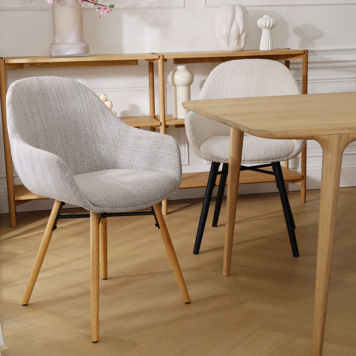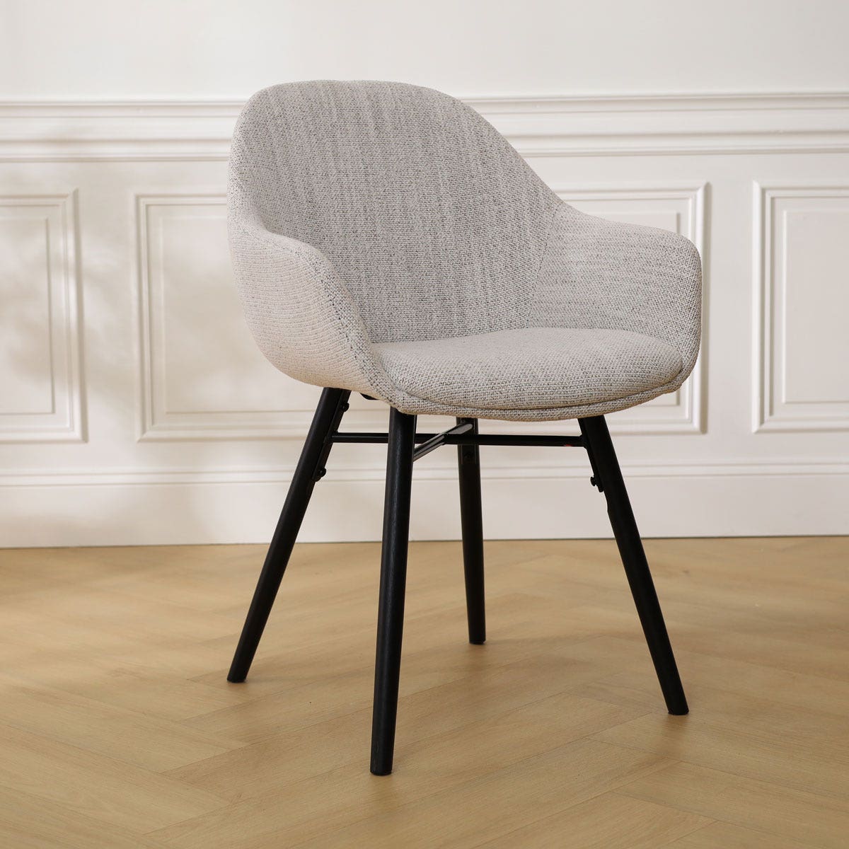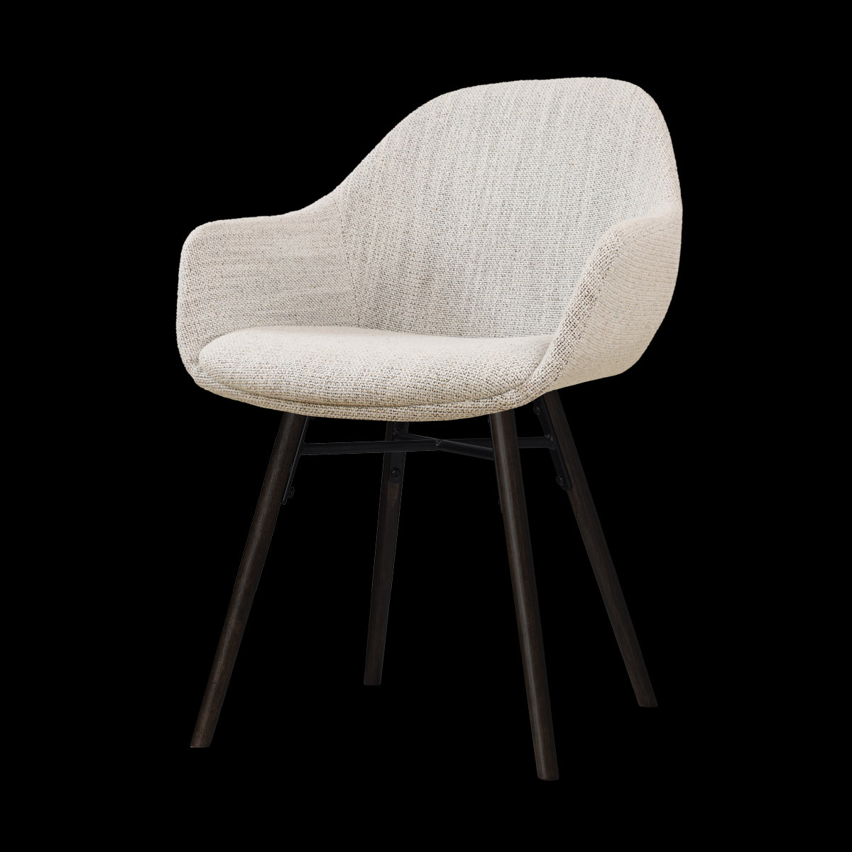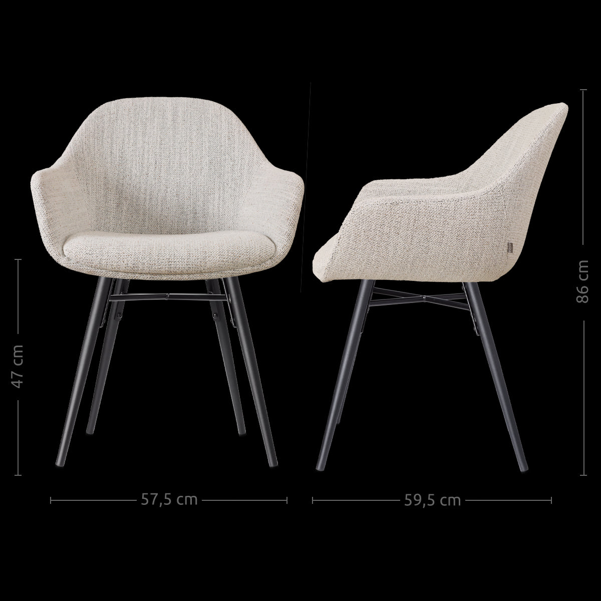 Deze prachtige eetkamerstoel heeft een beige gemêleerde zitting en zwarte poten, perfect voor een warme en moderne sfeer aan tafel. De luxe bekleding en afgeronde hoeken geven de stoel een zachte uitstraling, terwijl de armleuningen zorgen voor extra comfort tijdens het eten. Het stevige onderstel is gemaakt van beukenhout en is afgewerkt met een zwarte finish. De eveneens zwarte metalen kruisverbinding tussen de poten zorgt voor extra stabiliteit en is een stoer detail in het design. Deze ronde eetkamerstoel met armleuningen biedt dus zowel optimaal comfort in de eethoek als een upgrade in stijl. Of je nu houdt van een industriële, moderne of zelfs japandi woonstijl, de Nena-Mae eetkamerstoel met zwarte houten poten past perfect in ieder interieur.