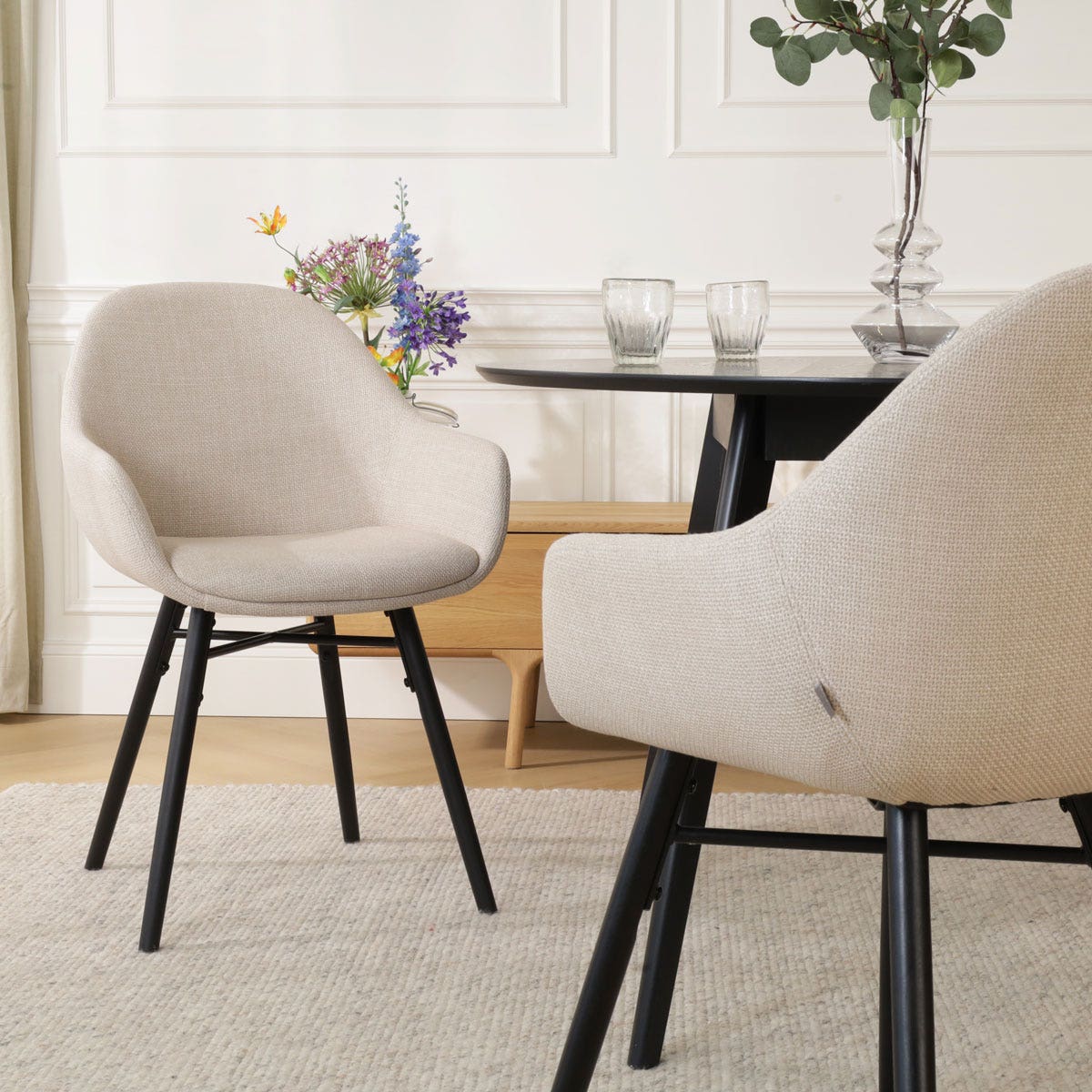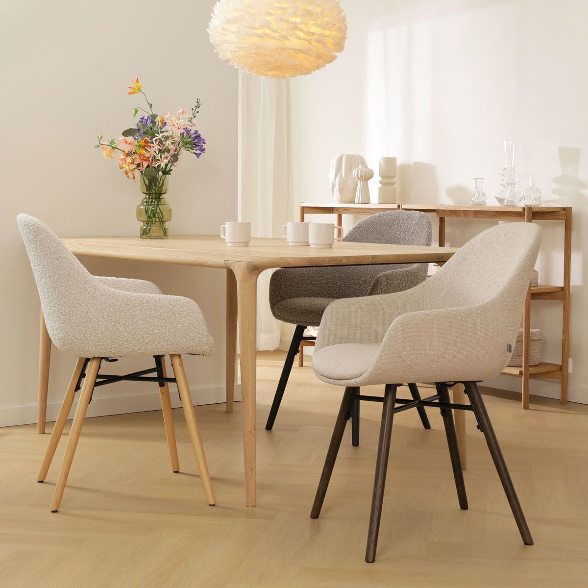 De ultieme combinatie van comfort en stijl komt tot leven in de elegante Nena-Mae eetkamerstoel met houten poten en armleuningen van Nolon.