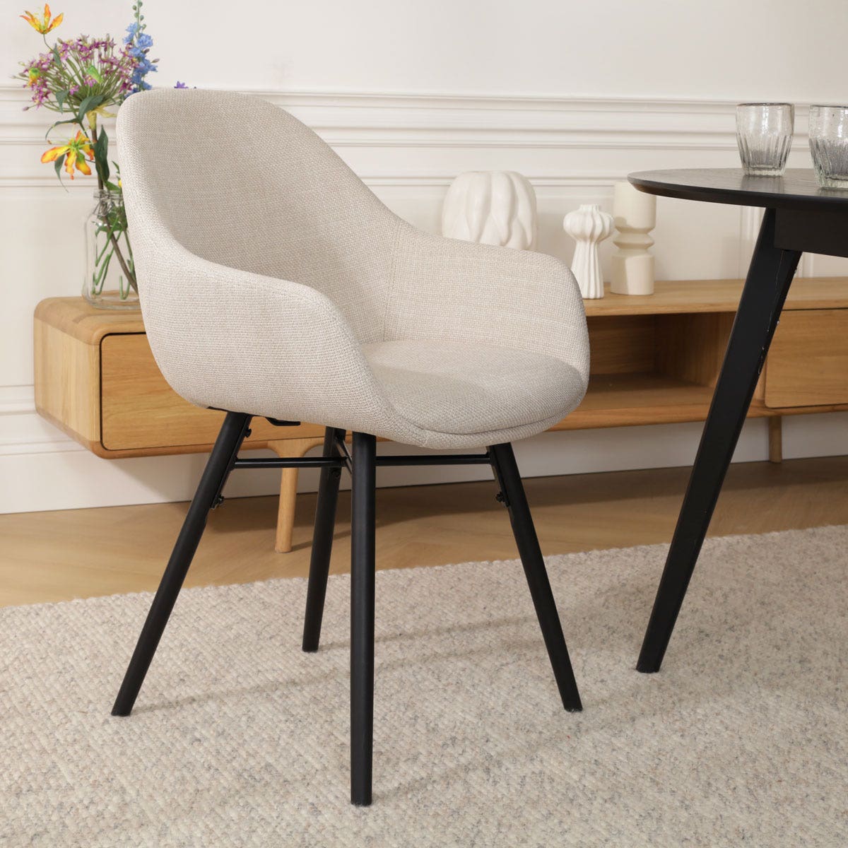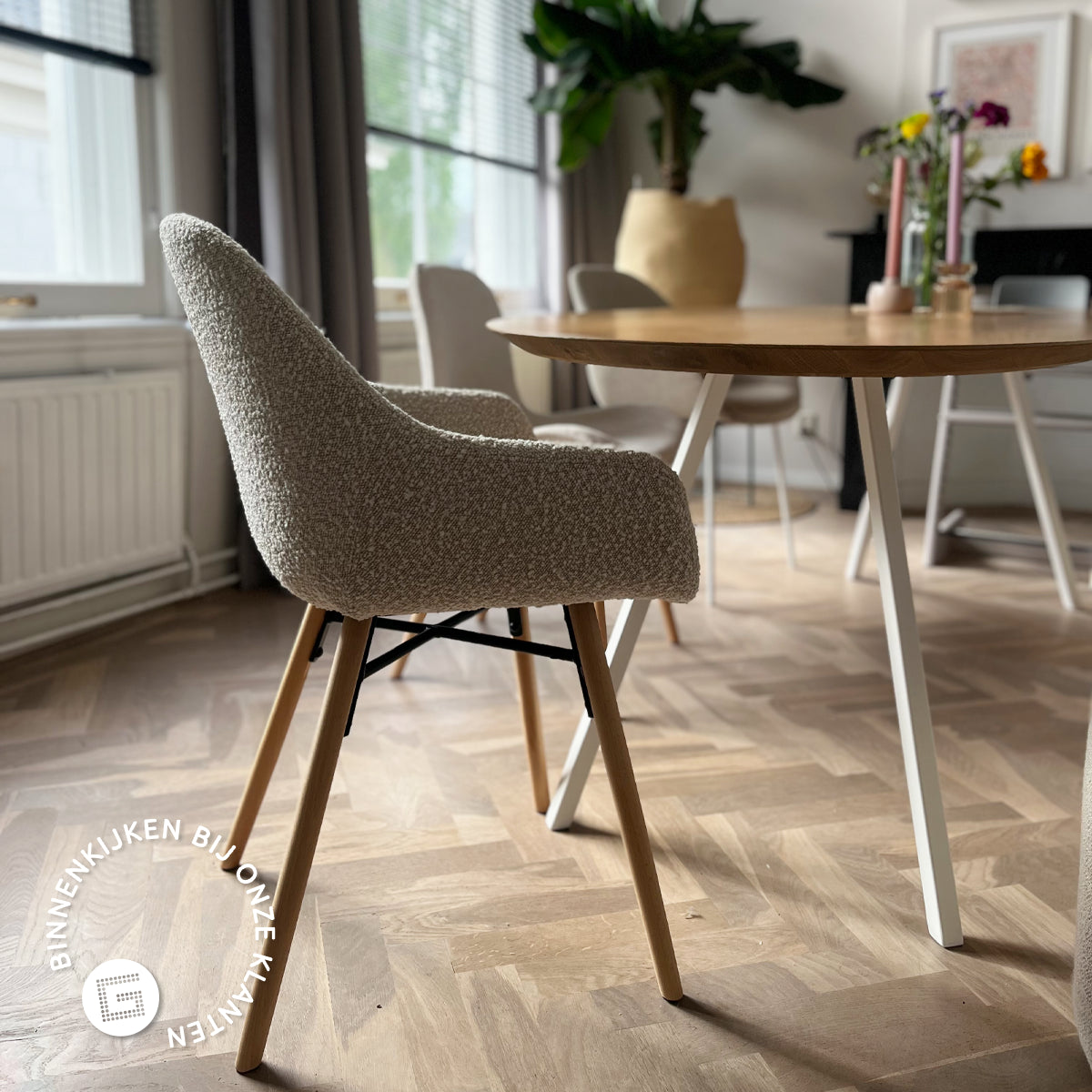 Deze eetkamerstoel is ontworpen met oog voor detail en biedt het perfecte zitcomfort voor lange maaltijden of gezellige borrels. De eetkamerstoel heeft zwarte houten poten gemaakt van massief eikenhout, wat duurzaamheid en stabiliteit garandeert. Naast de luxe stoffen bekleding in is de Nena-Mae eetkamerstoel ook verkrijgbaar in bouclé stof. Een bouclé eetkamerstoel geeft niet alleen een extra luxueus gevoel, maar is ook nog eens duurzaam en gemakkelijk te onderhouden. De armleuningen van deze eetkamerstoel zorgen ervoor dat je urenlang heerlijk aan tafel kan zitten en geven de stoel daarnaast net wat meer body. Maak een keuze uit één van de vier verschillende bekledingen en voeg een vleugje luxe toe aan je woning met deze armstoel.