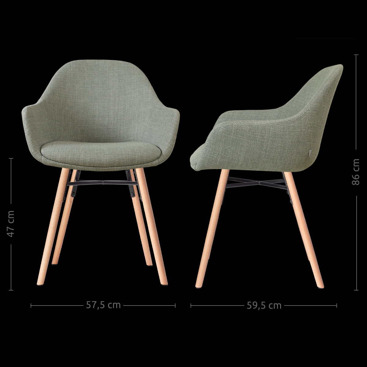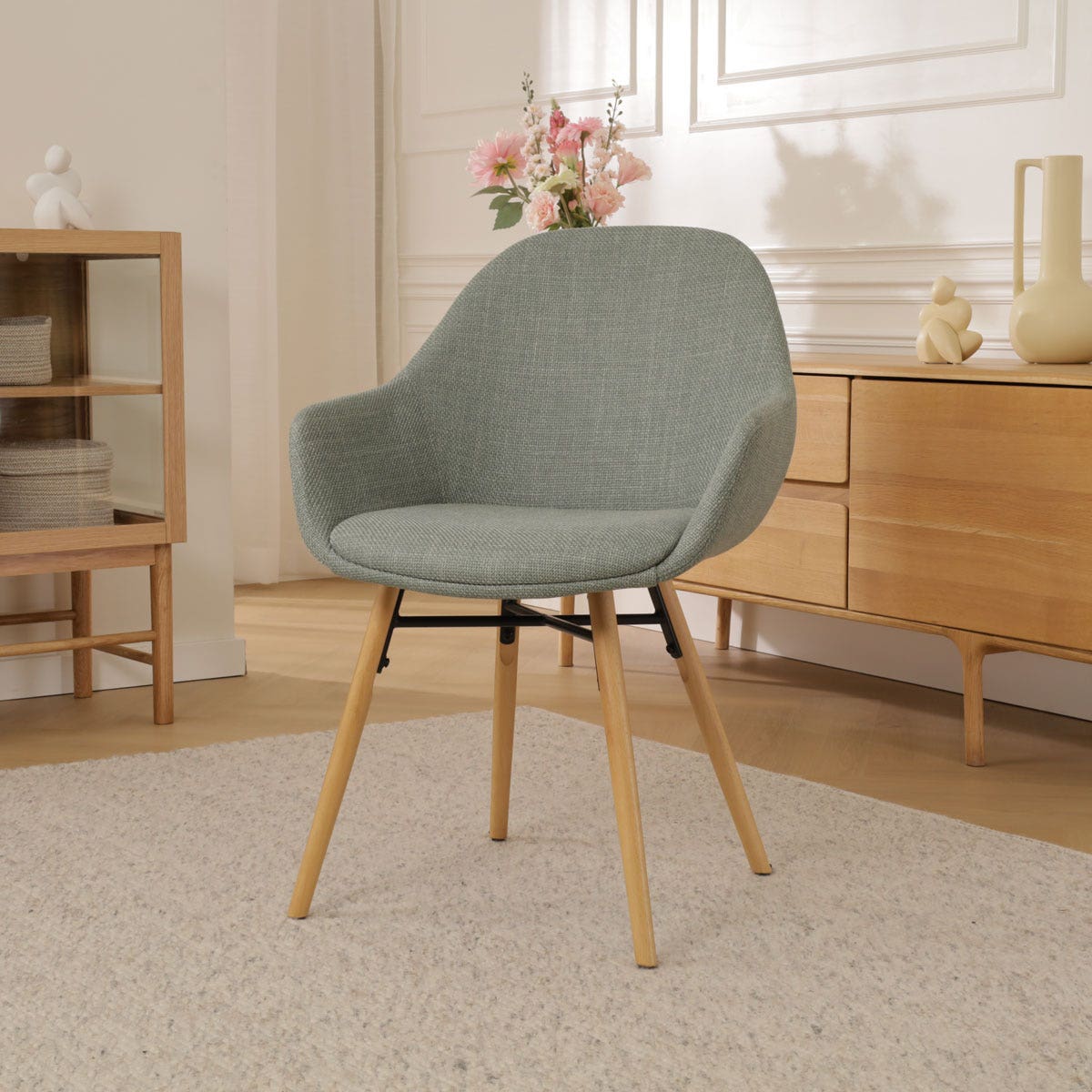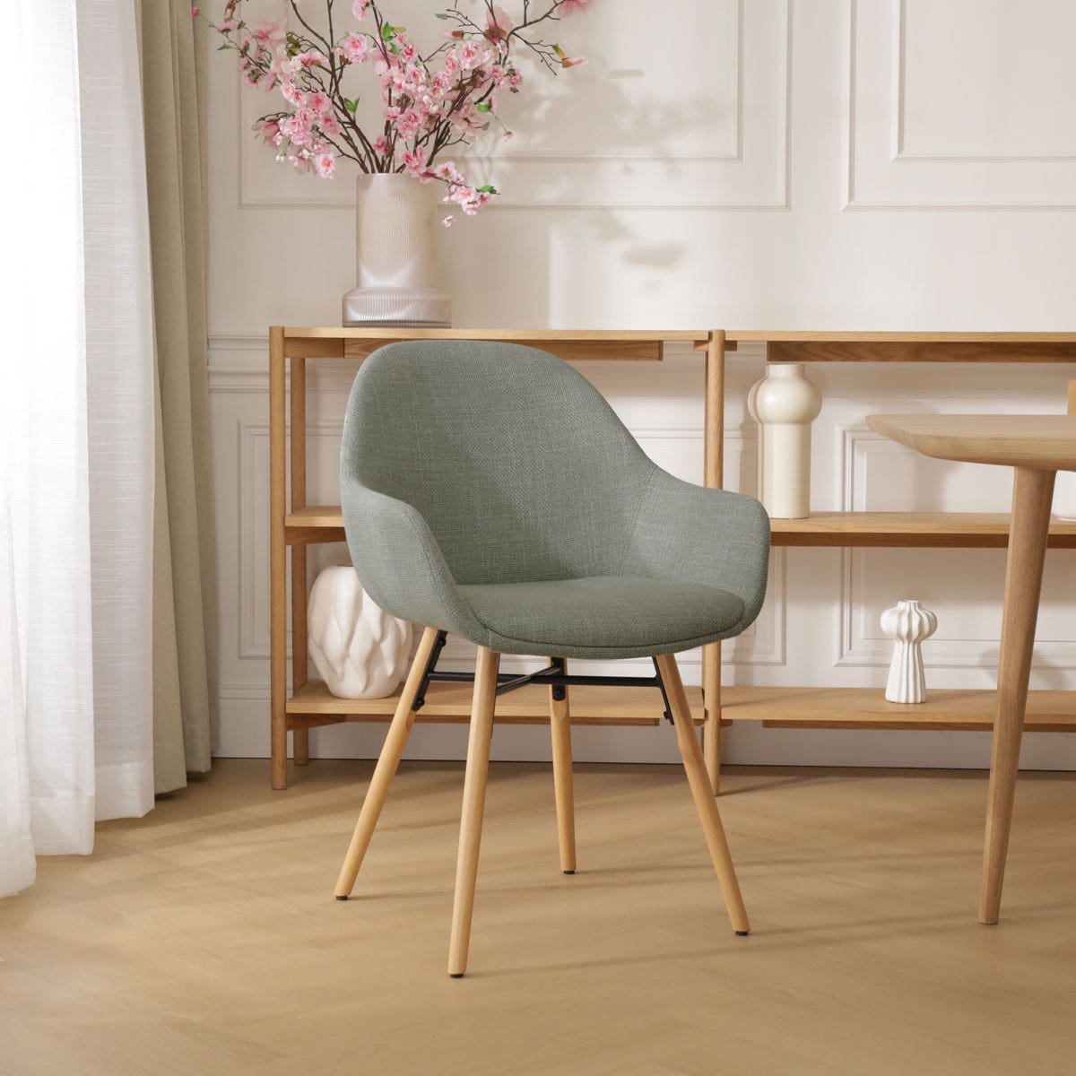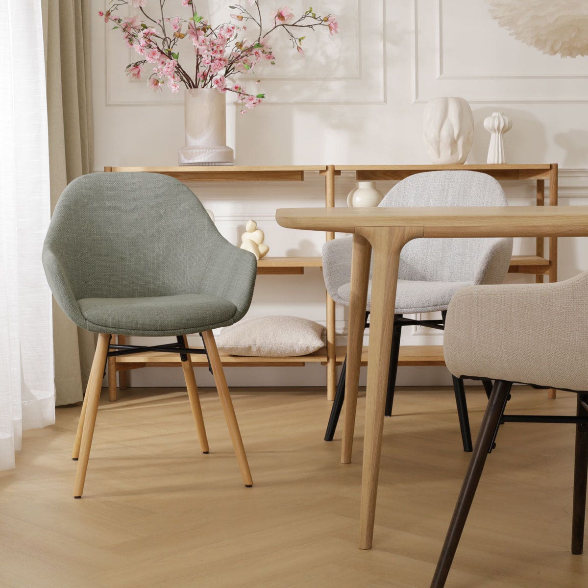 Deze eetkamerstoel met stoffen zitting biedt maximaal comfort met een zachte, goed gevulde zitting en ondersteunende armleuningen. Dit maakt het mogelijk om ontspannen aan tafel te zitten, zelfs tijdens lange maaltijden. De stoel is ontworpen voor comfort, zonder in te leveren op stijl. De groene bekleding is gemaakt van hoogwaardig materiaal en geeft naast een zachte uitstraling ook een luxe uitstraling aan deze eettafelstoel met leuning. De houten poten in naturel houtkleur zijn voorzien van een zwarte metalen kruiserbinding voor extra stabiliteit. Groene eettafel stoelen als de Nena-Mae zijn een perfecte aanvulling voor een eethoek in Scandinavische stijl.