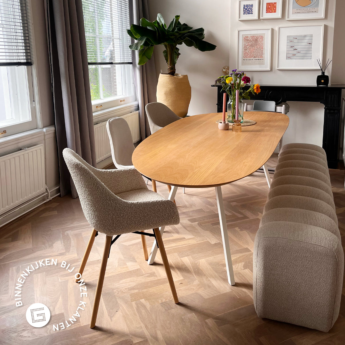 - De combinatie van hout en stof zorgt voor een warme en uitnodigende uitstraling in je eetkamer