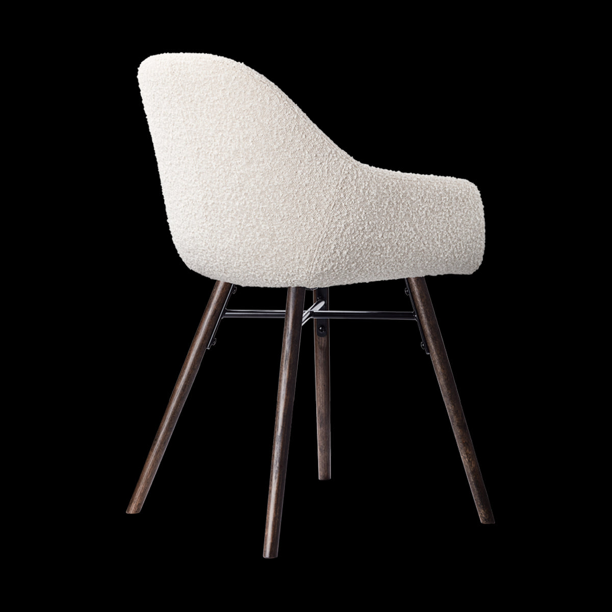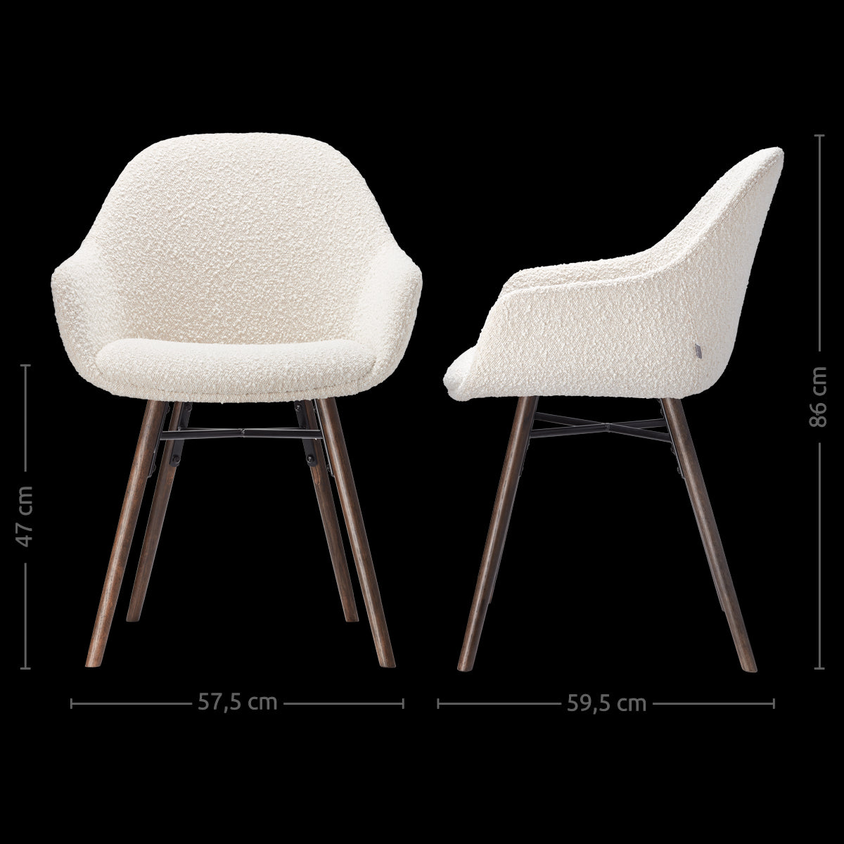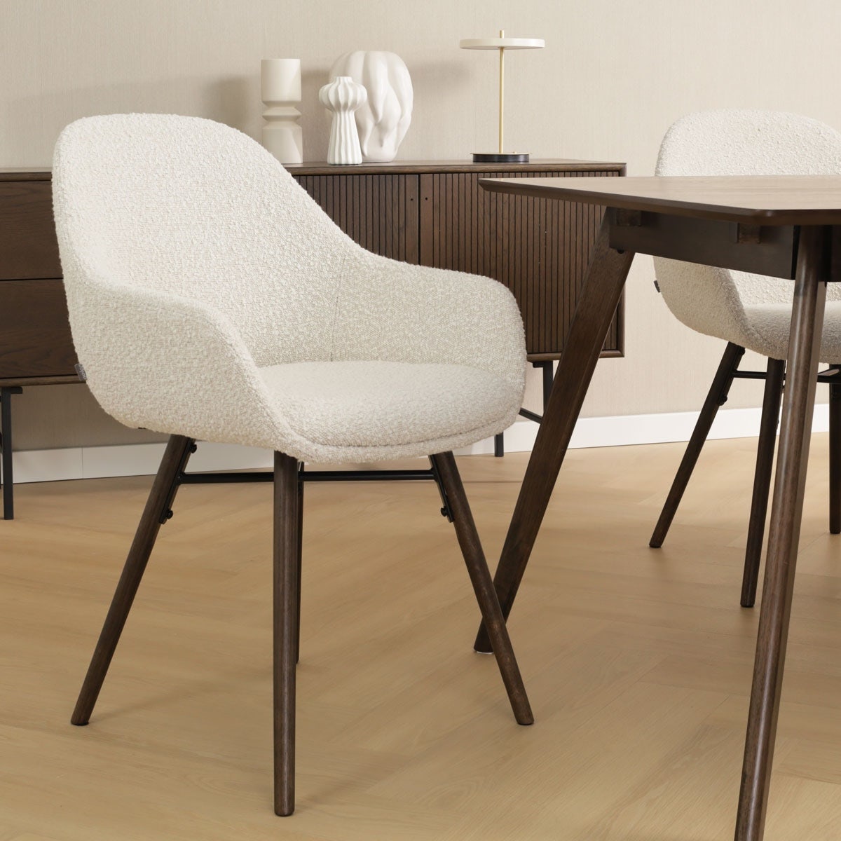 Deze eetkamerstoel is ontworpen met oog voor detail en biedt het perfecte zitcomfort voor lange maaltijden of gezellige borrels. De eetkamerstoel heeft houten poten gemaakt van massief eikenhout, wat duurzaamheid en stabiliteit garandeert. De walnoot kleur van het hout zorgt voor een warme en stijlvolle uitstraling. Naast de luxe beige bekleding is de Nena-Mae eetkamerstoel ook verkrijgbaar in bouclé stof. Een bouclé eetkamerstoel geeft niet alleen een extra luxueus gevoel, maar is ook nog eens duurzaam en gemakkelijk te onderhouden. De armleuningen van deze eetkamerstoel zorgen ervoor dat je urenlang heerlijk aan tafel kan zitten en geven de stoel daarnaast net wat meer body. Maak een keuze uit één van de verschillende bekledingen en voeg een vleugje luxe toe aan je woning met deze armstoel.