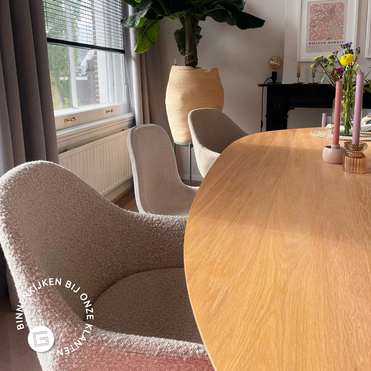 - De combinatie van hout en stof zorgt voor een warme en uitnodigende uitstraling in je eetkamer