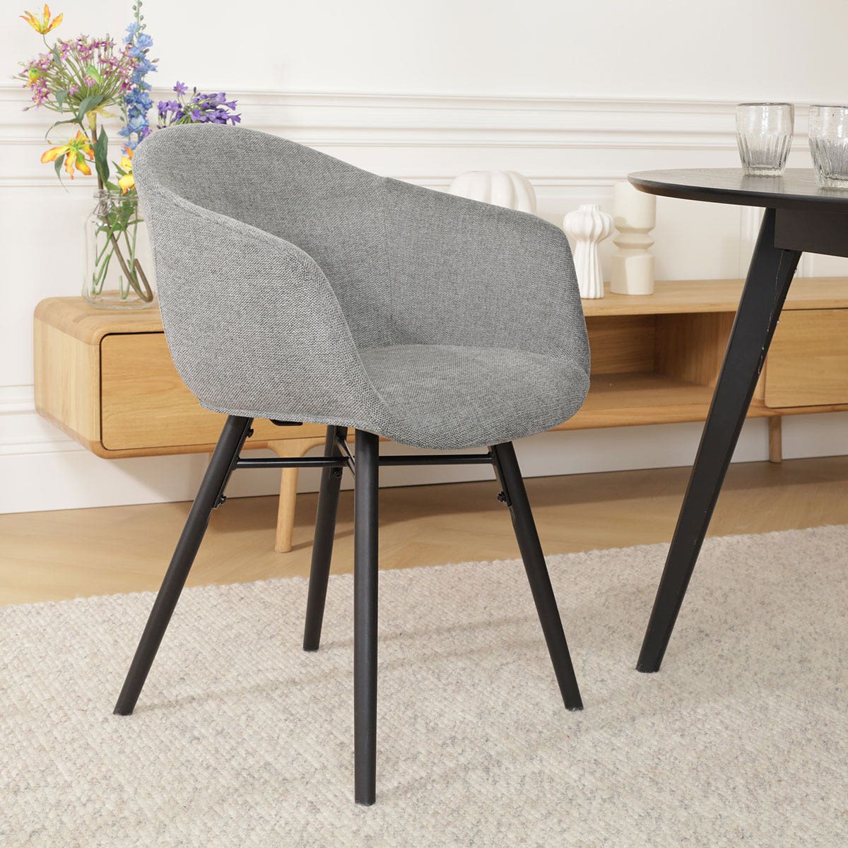 Deze eetkamerstoel is ontworpen met oog voor detail en combineert functionaliteit en stijl op perfecte wijze. De stoel heeft een onderstel van vier beukenhouten poten met een zwarte metalen kruisverbinding. Dit zwarte houten onderstel zorgt voor een warme uitstraling in de eethoek en draagt tevens bij aan de stabiliteit en duurzaamheid van de stoel. De zitting is ontworpen met ergonomische vormen en aflopende armleuningen om het lichaam optimaal te ondersteunen en een hoog zitcomfort te bieden. De kuipzitting is bekleed met hoogwaardige stof voor een zachte zitervaring en is in zes verschillende kleuren verkrijgbaar. Is de Otis zitting met armleuningen precies wat je zoekt maar heb je liever een ander onderstel? Dat kan met de uitgebreide mix en match collectie van Nolon!