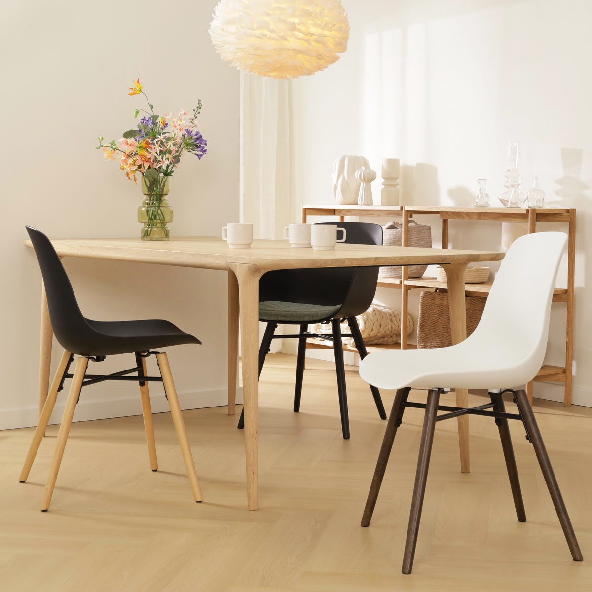 Deze eetkamerstoel combineert een moderne kunststof zitting met een sfeervol houten onderstel. De poten zijn gemaakt van beukenhout en hebben een zwarte metalen kruisverbinding voor extra stevigheid. De naturel kleur van het hout vormt een mooi contrast met de kunststof zitting en brengt warmte in het ontwerp. Deze is gemaakt van door en door gekleurd kunststof, waardoor de stoel niet alleen onderhoudsvriendelijk en duurzaam is, maar ook nog eens bestand is tegen krassen en beschadigingen door intensief gebruik. De kunststof zitting is bovendien ergonomisch ontworpen om ultiem comfort te bieden tijdens lange diners en gezellige avonden met vrienden en familie. Wil je toch iets zachter zitten? Combineer deze kunststof stoel in het wit of zwart dan met één van de losse stoelkussens van Nolon, die speciaal ontworpen zijn om perfect op de eetkamerstoelen van het merk aan te sluiten.