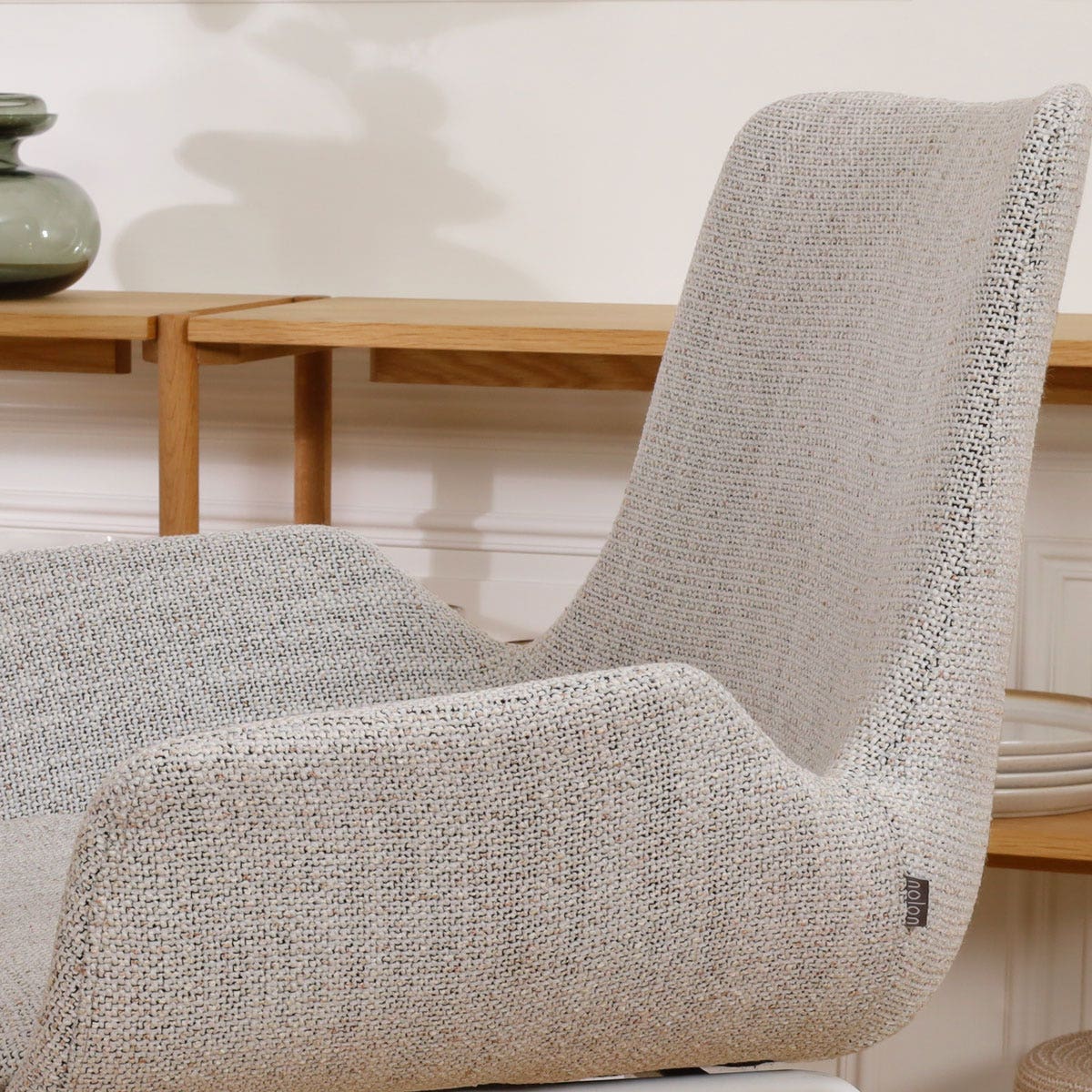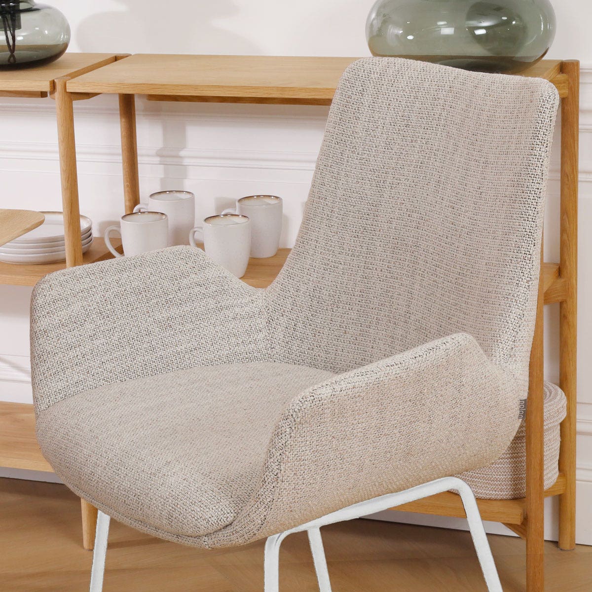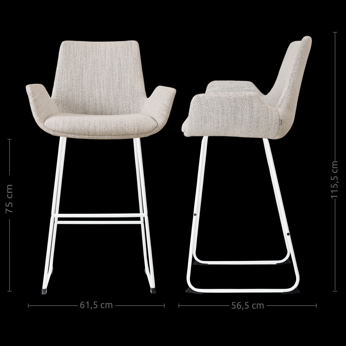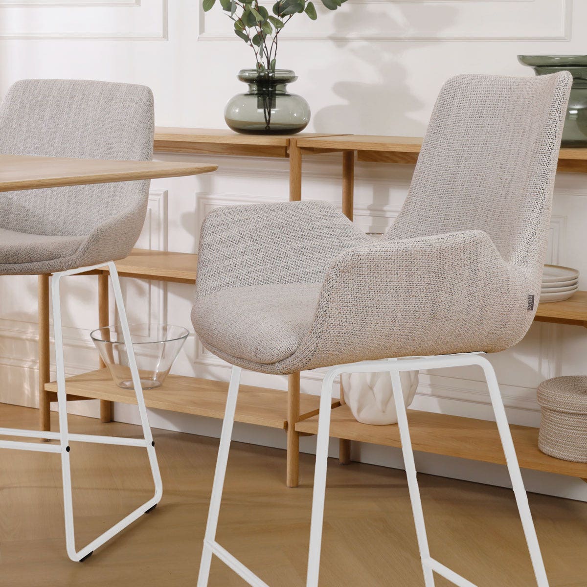 Deze hoge barkruk is ontworpen met zowel comfort als stijl in gedachten. De kruk heeft een wit metalen onderstel, wat zorgt voor een minimalistisch en open design. De comfortabele zitting is bekleed met beige gemêleerde stof en heeft een vast zitkussen, waardoor urenlang dineren aan de bar geen enkel probleem is. De barkruk is ontworpen met armleuningen die iets lager zijn dan normaal, zodat je wel de luxe hebt van het lekker laten rusten van je armen, maar geen gedoe hebt met armleuningen die niet onder het keukenblad passen. Dankzij de zithoogte van 75 centimeter is deze barstoel geschikt om te gebruiken aan een bar of hoge eettafel. Of je nu op zoekt bent naar een barkruk voor een modern, klassiek of Scandinavisch interieur, de Nino-Eef beige gemêleerde barkruk is een uitstekende keuze.