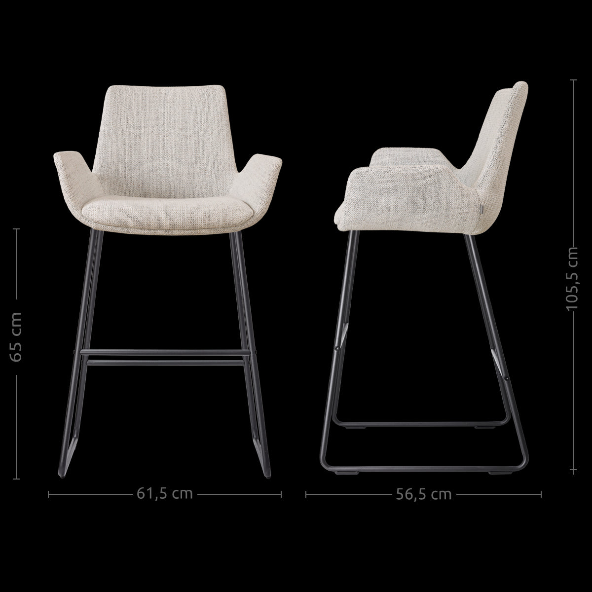 Deze barkruk is ontworpen met zowel functionaliteit als esthetiek in gedachten. Het zwarte metalen onderstel met zithoogte van 65 cm zorgt voor een stabiele zit en laat de barkruk tegelijkertijd modern en luchtig ogen. De comfortabele zitting heeft een stevige rugleuning en is bekleed met luxe stof in beige gemêleerde kleur. Hiermee is de Nino-Eef een sfeervolle toevoeging aan de keuken voor liefhebbers van diverse woonstijlen, waaronder hotel chique en industrieel. Naast de rugleuning is de Nino-Eef bovendien ontworpen met armleuningen voor extra ondersteuning. Deze armleuningen zijn iets lager dan standaard, wat niet ten koste gaat van het zitcomfort maar er wel voor zorgt dat de kruk beter onder het keukenblad past. De voetsteun op het metalen frame maakt de barkruk vervolgens helemaal af.