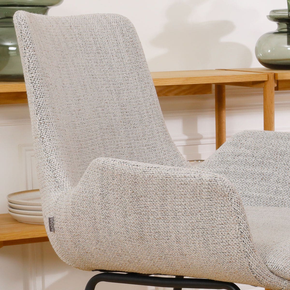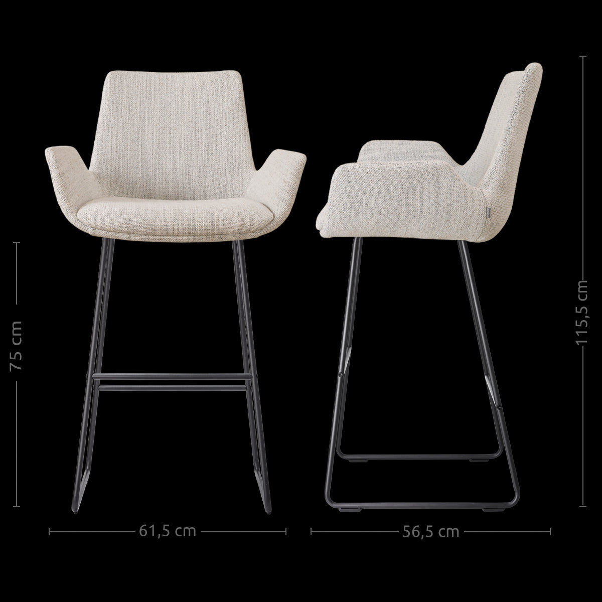 Deze hoge barkruk biedt zowel comfort als een eigentijds design. Het zwarte metalen onderstel voegt een stoere, moderne touch toe, terwijl het open ontwerp zorgt voor een luchtige uitstraling. De comfortabele zitting is bekleed met een luxe beige gemêleerde stof en voorzien van een vast zitkussen, zodat je ook tijdens lange diners aan de bar optimaal zitcomfort ervaart. De armleuningen zijn iets lager geplaatst, wat ideaal is om je armen ontspannen te laten rusten zonder dat de barkruk niet meer onder het keukenblad past. Met een zithoogte van 75 centimeter is de Nino-Eef perfect voor gebruik aan een bar of hoge eettafel. Of je nu kiest voor een modern, industrieel of Scandinavisch interieur, de Nino-Eef barkruk met beige bekleding en zwart onderstel past moeiteloos in elke stijl.