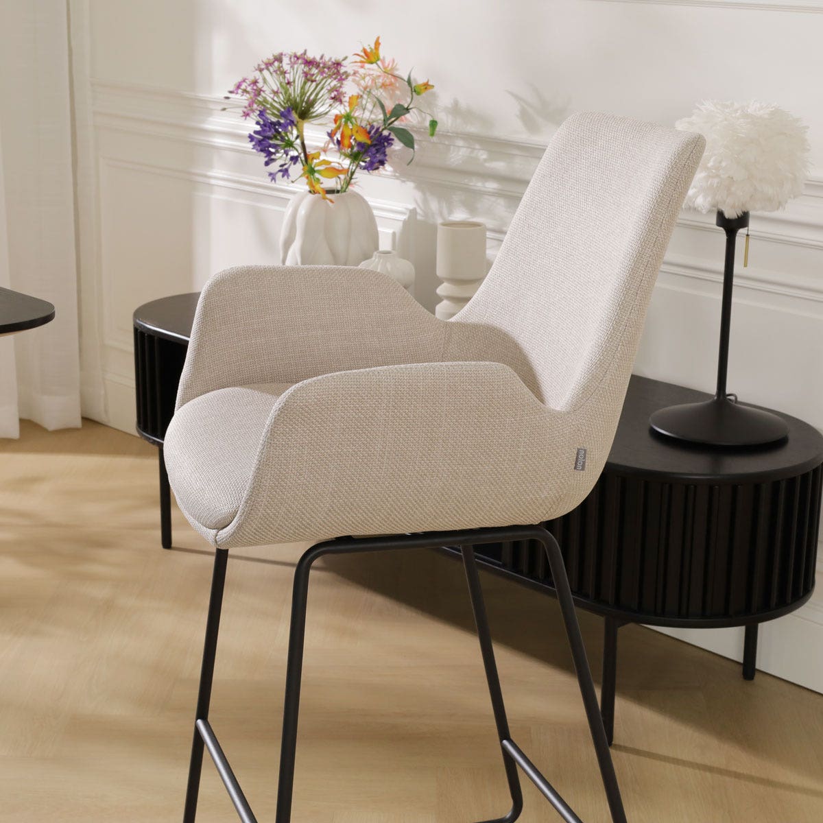 De barkruk is ontworpen met zowel comfort als stijl in gedachten. Het metalen frame van de barkruk heeft een moderne en minimalistische uitstraling, en zorgt voor stevigheid en stabiliteit. De zitting is bekleed met luxe stof in de kleur beige of warm grijs, of met bouclé stof in de kleur beige. Dankzij deze stoffen zitting heeft de barkruk een chique uitstraling en creëer je een sfeervolle plek om te eten. Met een zithoogte van 75 centimeter is deze kruk geschikt om aan een bar of hoge eettafel te gebruiken. Wil je de kruk aan een kookeiland gebruiken? Dan is de Nino-Eef met een zithoogte van 65 cm beter geschikt voor jou.