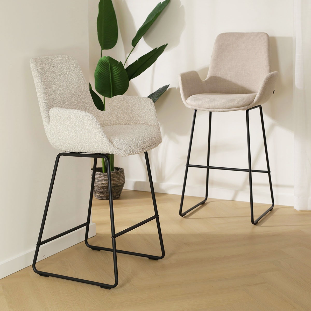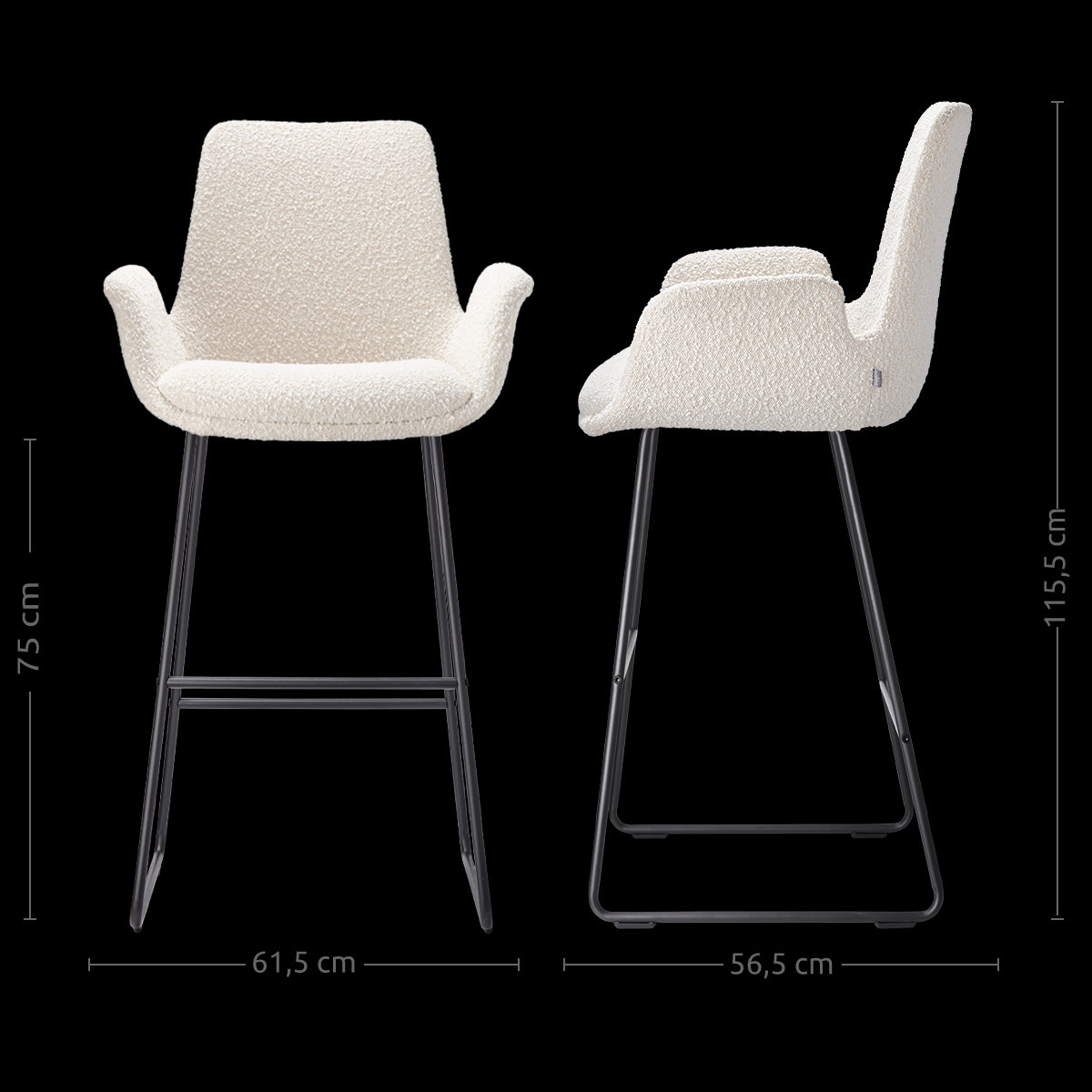 De barkruk is ontworpen met zowel comfort als stijl in gedachten. Het metalen frame van de barkruk heeft een moderne en minimalistische uitstraling, en zorgt voor stevigheid en stabiliteit. De zitting is bekleed met luxe stof in de kleur beige of warm grijs, of met bouclé stof in de kleur beige. Dankzij deze stoffen zitting heeft de barkruk een chique uitstraling en creëer je een sfeervolle plek om te eten. Met een zithoogte van 75 centimeter is deze kruk geschikt om aan een bar of hoge eettafel te gebruiken. Wil je de kruk aan een kookeiland gebruiken? Dan is de Nino-Eef met een zithoogte van 65 cm beter geschikt voor jou.