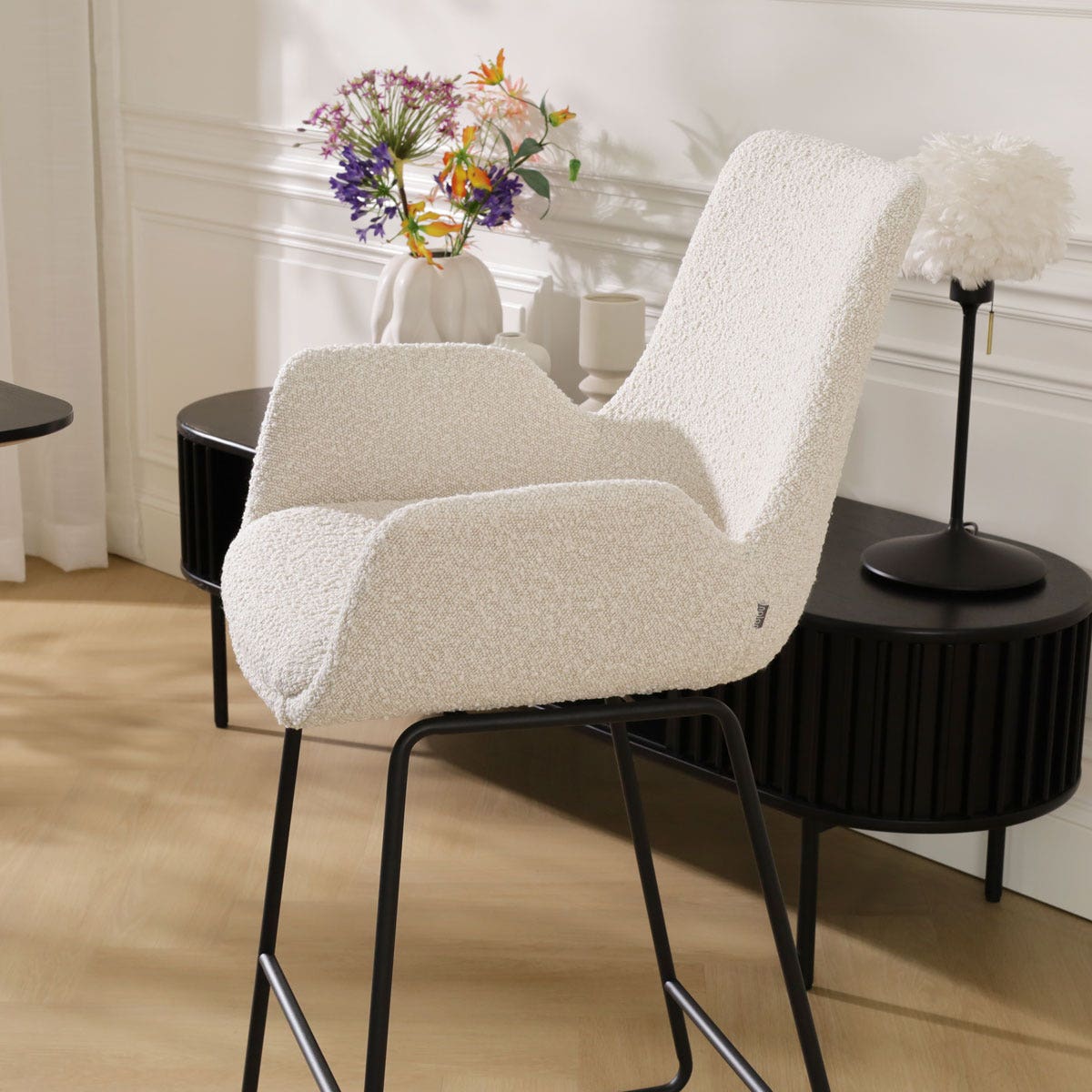 - De rijke bouclé stof oogt luxe en straalt warmte uit