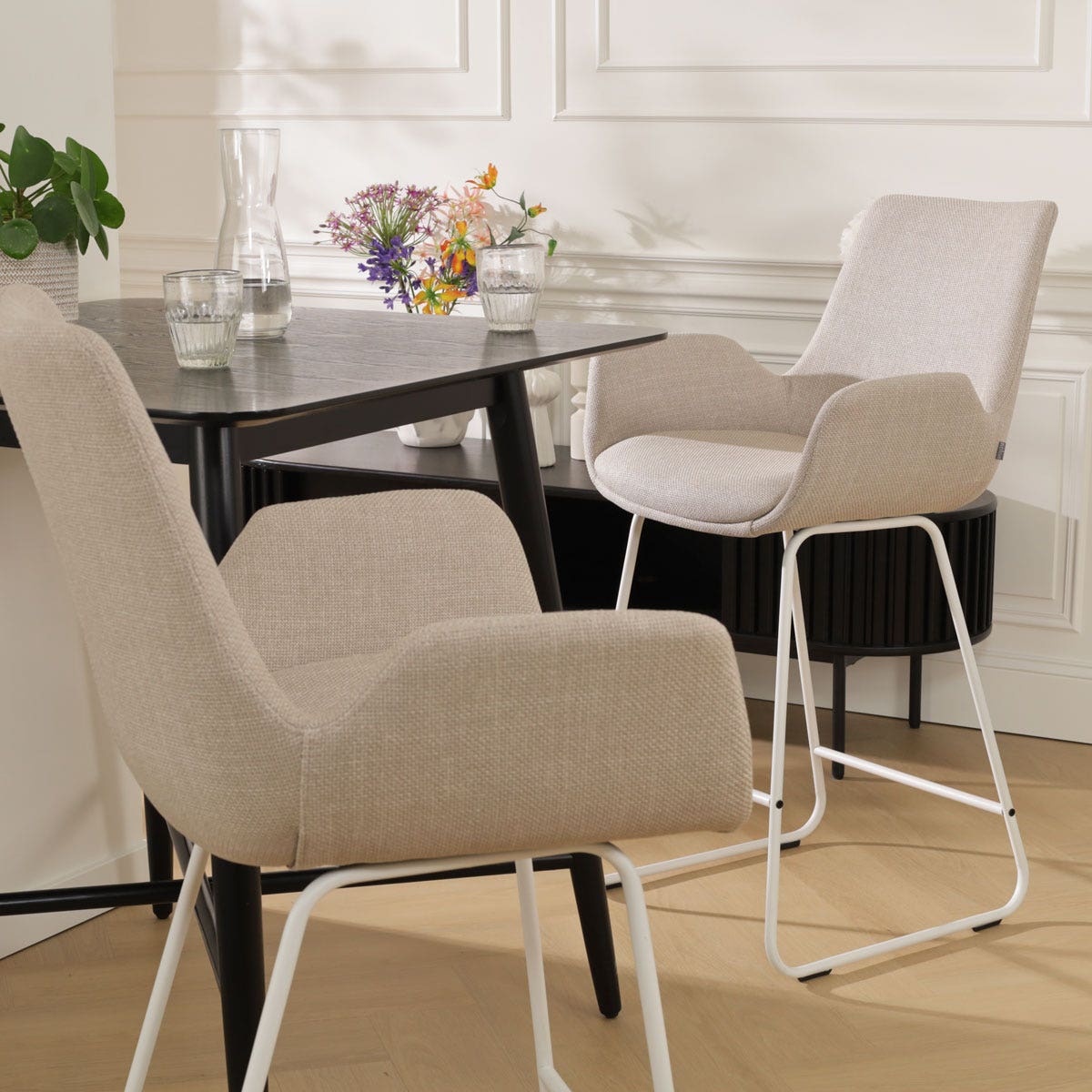 Deze barkruk is ontworpen met zowel functionaliteit als esthetiek in gedachten. Het slanke metalen onderstel zorgt voor een stabiele zit en laat de barkruk tegelijkertijd modern en luchtig ogen. De comfortabele zitting heeft een stevige rugleuning en is verkrijgbaar met luxe stoffen bekleding of bouclé stof. Hiermee is de Nino-Eef een sfeervolle toevoeging aan de keuken. Naast de rugleuning is de Nino-Eef bovendien ontworpen met armleuningen voor extra ondersteuning. Deze armleuningen zijn iets lager dan standaard, wat niet ten koste gaat van het zitcomfort maar er wel voor zorgt dat de kruk beter onder het keukenblad past. De voetsteun op het metalen frame maakt de barkruk vervolgens helemaal af. Maak een keuze uit de verschillende materialen en kleuren van de zitting en geniet van ultieme stijl en comfort aan je kookeiland.
