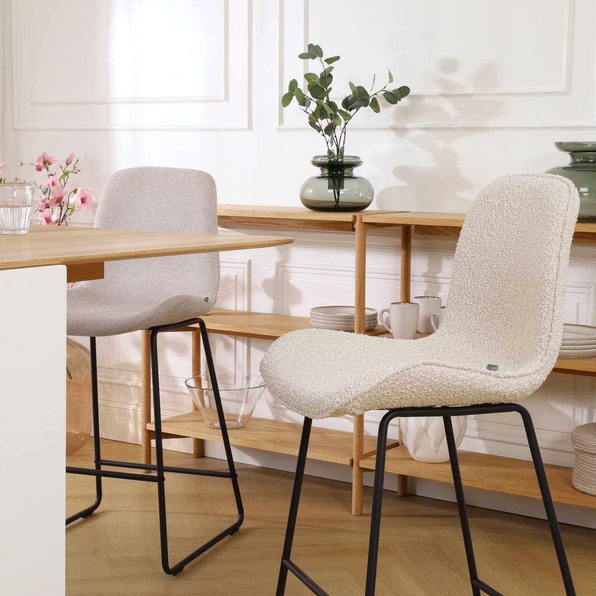 Deze moderne barkruk combineert namelijk een strak metalen onderstel met een zachte gestoffeerde zitting, en is tegelijkertijd ook nog eens erg comfortabel. De zitting van deze kruk is ontworpen met subtiele rondingen en een gevleugeld zitvlak om ervoor te zorgen dat je urenlang comfortabel kan zitten. De zachte bekleding draagt bij aan het zitcomfort en zorgt bovendien voor een warme sfeer in de eethoek. Met diverse kleuren en materialen om uit te kiezen kan je deze barkruk helemaal aan jouw interieur aanpassen. Kies uit het witte of zwarte onderstel en combineer deze met de zitting in bijvoorbeeld ribstof of teddystof voor een ware blikvanger in huis. Met een zithoogte van 74,5 cm is deze barkruk geschikt voor aan een hoge eettafel of bar. Heb je een lager model nodig? De Nino-Fé is ook verkrijgbaar in een kookeiland variant.