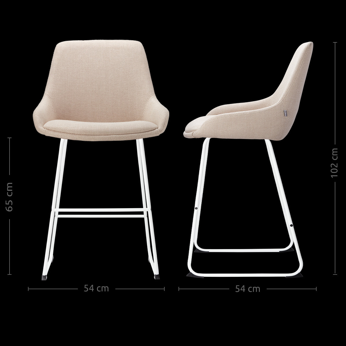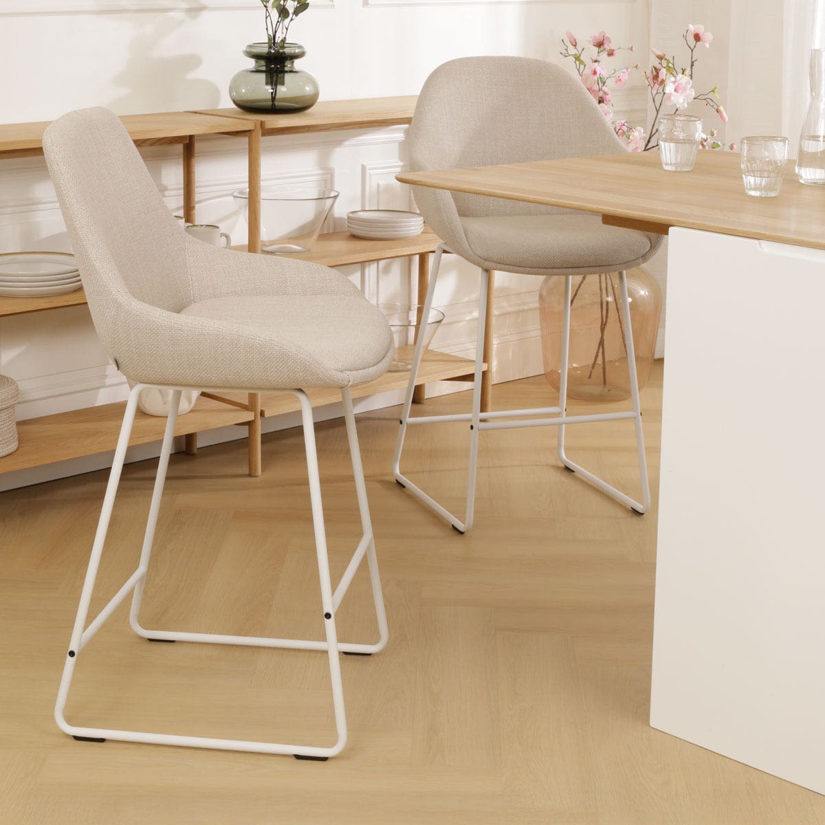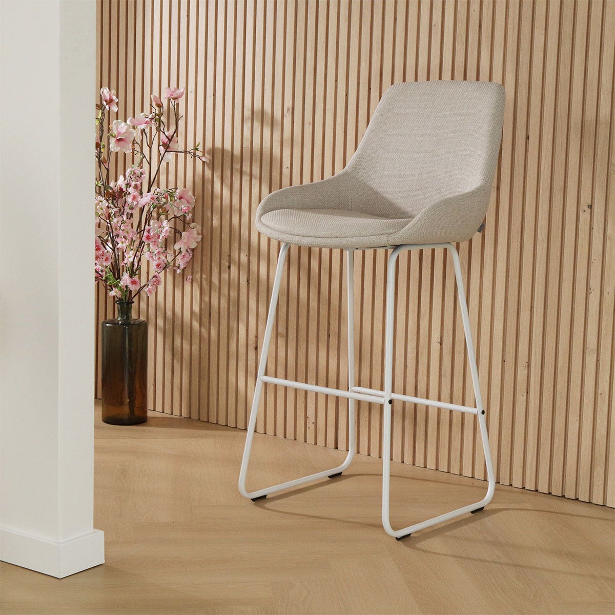 Deze barkruk heeft een zithoogte van 65 cm, ideaal voor een keukenblad of kookeiland met een hoogte van circa 88-95 cm. Het Scandinavische en moderne ontwerp, zonder armleuningen, maakt dat de kruk minder ruimte inneemt en gemakkelijk onder het keukenblad geschoven kan worden. De zitting is volledig gestoffeerd en voorzien van een gevoerd zitvlak, wat zorgt voor extra comfort. De metalen poten zijn wit en geven de barkruk een slanke en stevige uitstraling. De zitdiepte bedraagt 40 cm, en de totale hoogte is 102 cm. Met een voetsteun op het frame biedt deze barkruk een ontspannen zithouding. Verkrijgbaar in verschillende kleuren en materialen, zoals bouclé stof voor een warme uitstraling, is deze barkruk eenvoudig aan te passen aan jouw interieur. Het model is zeer eenvoudig in elkaar te zetten en is geen onderdeel van een set, waardoor je flexibel bent in de keuze van het aantal krukken dat je nodig hebt.