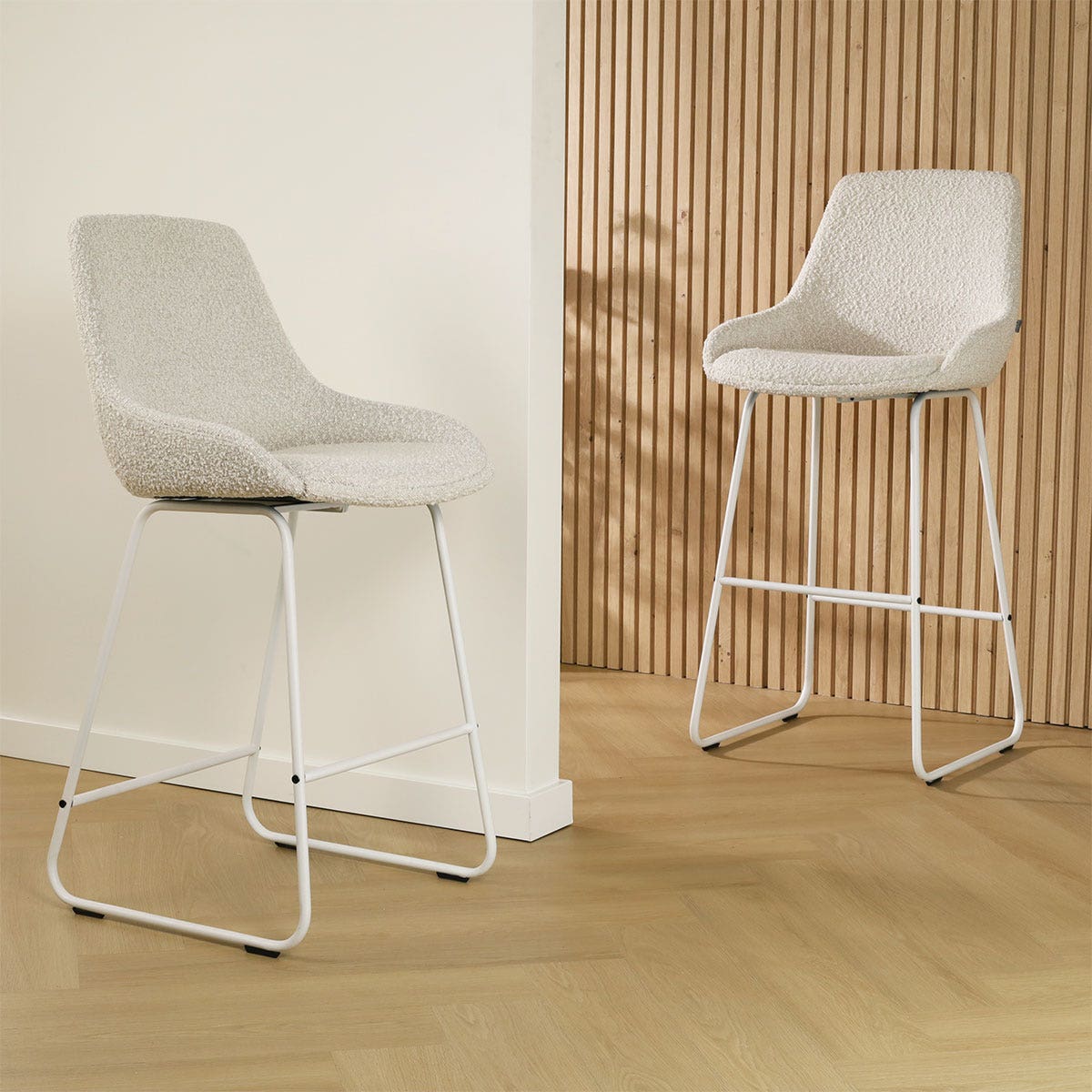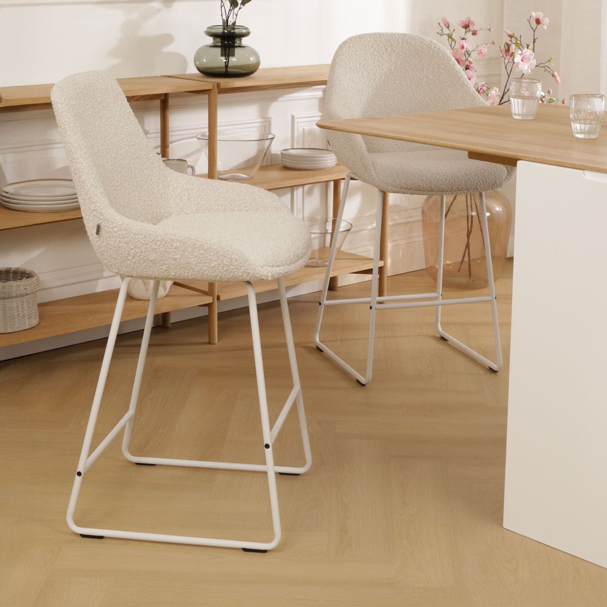 De Nino-Isa barkruk bouclé beige - wit onderstel - 75 cm is onderdeel van een mix en match collectie. Dit betekent dat zowel het onderstel als de zitting van deze stoel in diverse andere combinaties verkrijgbaar zijn. Zo is de stoel met een wit onderstel en een zwart onderstel verkrijgbaar in de kleuren bouclé taupe, beige, warm grijs, bruin, beige gemêleerd en in het groen. Met de verschillende onderstellen in wit of zwart en zithoogtes van 65 cm of 75 cm, kunt u de perfecte combinatie kiezen die bij uw interieur past.