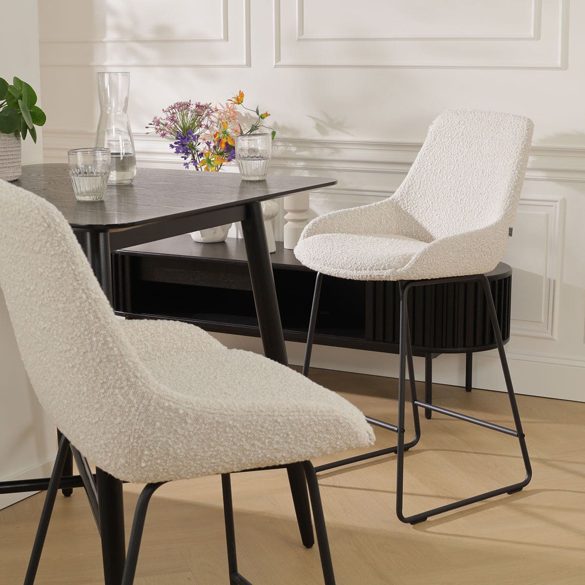 De Nino-Isa barkruk met zijn bouclé beige zitting en zwarte onderstel is een stijlvolle en praktische keuze voor elke keuken of bar. Met een zithoogte van 65 cm is hij ideaal voor standaard keukenbladen. Om de levensduur van je kruk te verlengen, is het verstandig de stoffen zitting voor gebruik te impregneren. Mocht er een ongelukje gebeuren, verwijder dan vlekken snel en voorzichtig om blijvende schade te voorkomen. Vergeet ook niet je vloer te beschermen tegen krassen met de speciale Nino-vloerdoppen.
