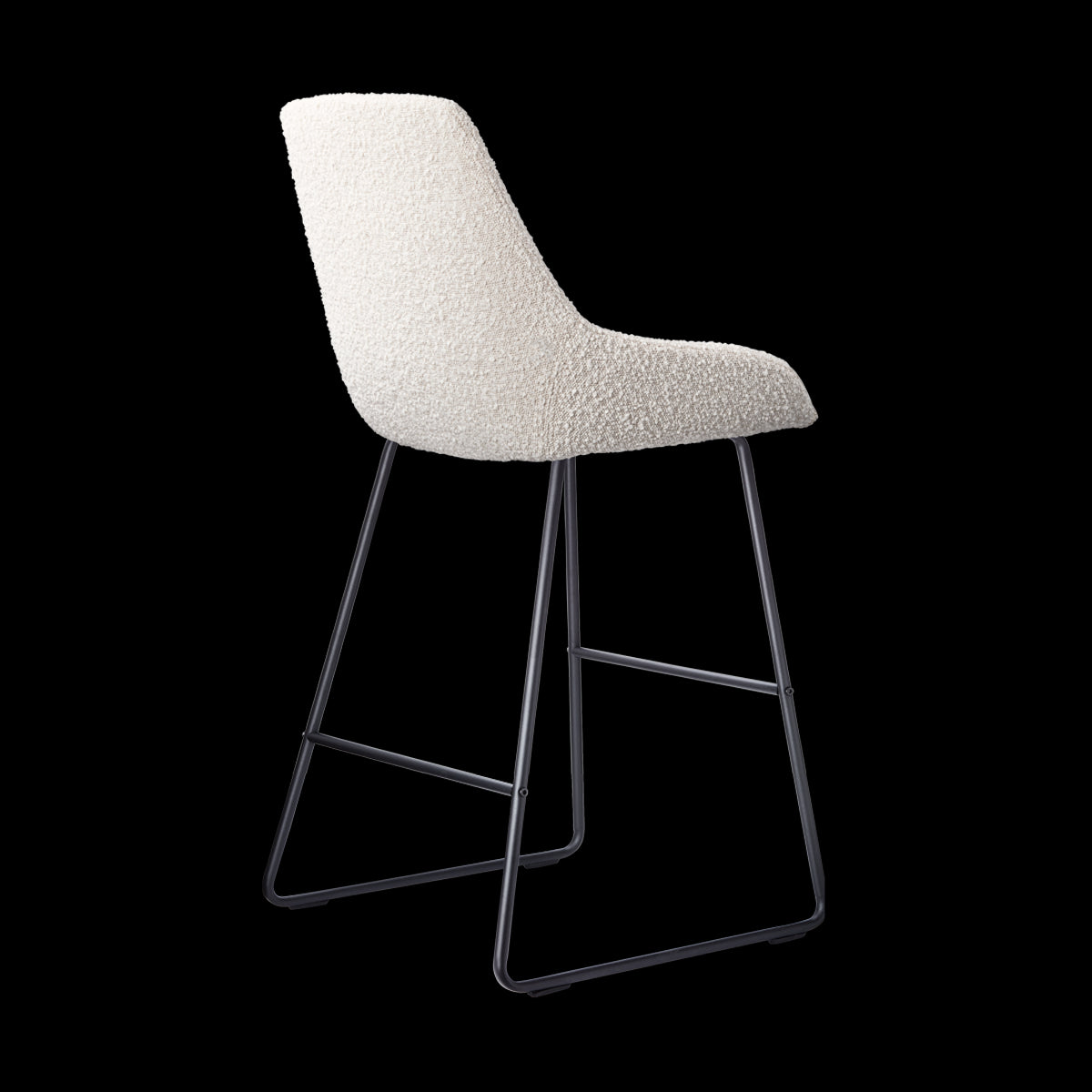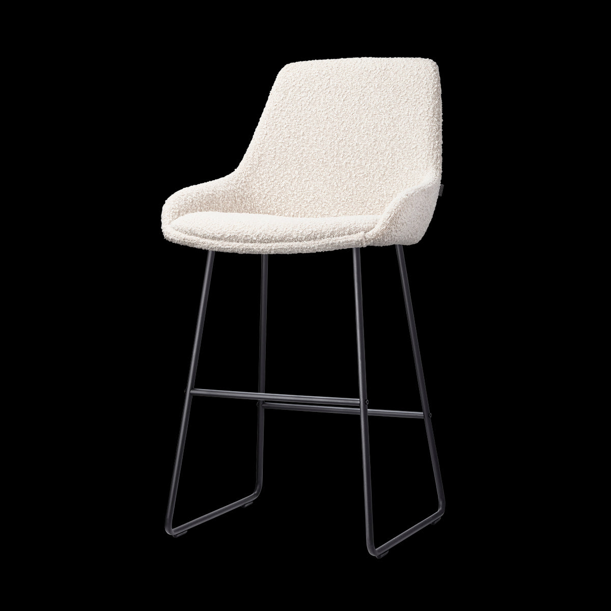 Deze barkruk, met een zithoogte van 65 cm, is perfect voor een gezellige avond tafelen of een uitgebreid ontbijt. De barkruk combineert een slank, stevig metalen frame met een luxe bouclé beige stoffen zitting, wat zorgt voor een moderne uitstraling en een warme, gezellige sfeer. De voetsteun biedt extra comfort, terwijl het ontwerp zonder armleuningen ruimte bespaart en de kruk eenvoudig onder het keukenblad kan worden geschoven. De zitting heeft een ergonomische vorm en is volledig gestoffeerd, met een zitdiepte van 40 cm en een totale hoogte van 102 cm, wat bijdraagt aan het comfort. Het zwarte metalen onderstel versterkt de chique hotel uitstraling, en de kruk is eenvoudig te monteren. Deze barkruk is verkrijgbaar in diverse kleuren en materialen, waardoor hij makkelijk in elk interieur past.