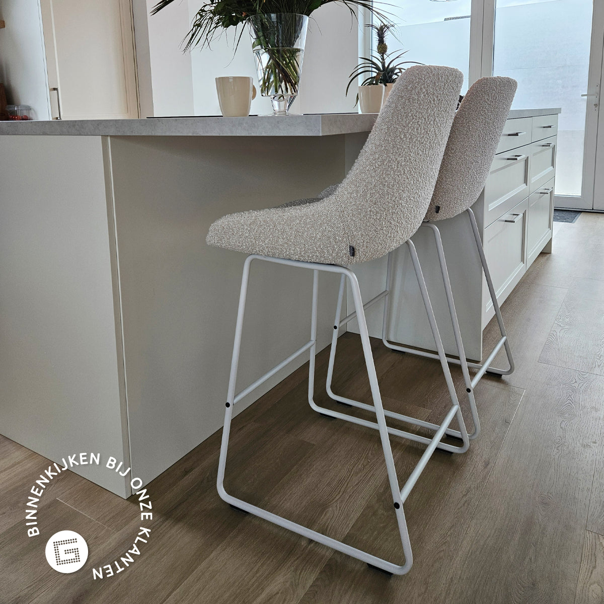 De barkruk heeft een slank frame gemaakt van metaal, wat zorgt voor stevigheid en een moderne uitstraling. De stoffen zitting is voorzien van een gevoerd zitvlak voor extra comfort. De voetsteun op het frame maakt de ontspannen zithouding compleet. De bekleding van deze kookeiland barkruk is verkrijgbaar in twee verschillende kleuren en materialen. De Nino-Isa barkruk met bouclé stof heeft de ultieme warme en gezellige uitstraling, terwijl de luxe stoffen bekleding zorgt voor een meer tijdloze uitstraling. Afhankelijk van jouw smaak kan je deze kruk dus aan jouw interieur aanpassen. Erg handig: deze barkruk heeft geen armleuningen, dus je schuift hem zo onder het keukenblad. Ideaal als je niet veel ruimte hebt in de keuken.