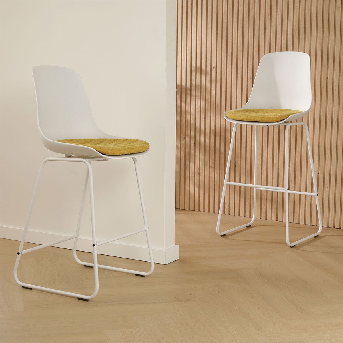 De barkruk heeft een slank en minimalistisch metalen frame dat voor stabiliteit zorgt. Het frame is voorzien van een voetsteun zodat je je benen niet hoeft te laten bungelen. De zitting is gemaakt van kunststof, wat zowel duurzaam als slijtvast is. Bovendien is dit materiaal erg onderhoudsvriendelijk en gemakkelijk schoon te maken, dus de Nino-Liv barkruk is zeer geschikt voor intensief gebruik. Om het comfort van deze moderne barkruk te verhogen, is de zitting voorzien van een vast stoelkussen dat is bekleed met zachte stof. Maak een keuze uit de verschillende kleuren zitting, frame en zitkussen om deze barkruk helemaal aan jouw wensen te laten voldoen. Met een zithoogte van 64,5 cm is deze barkruk geschikt om te gebruiken aan een kookeiland. Heb je een hogere barkruk nodig? Deze barkruk is ook verkrijgbaar met een zithoogte van 74,5 cm.