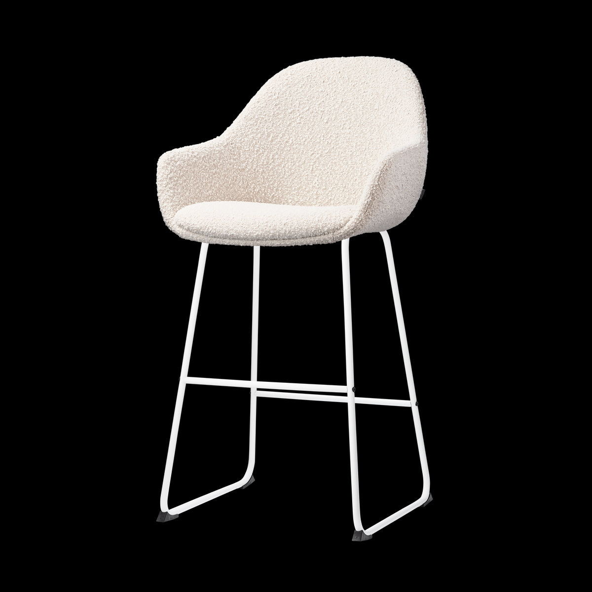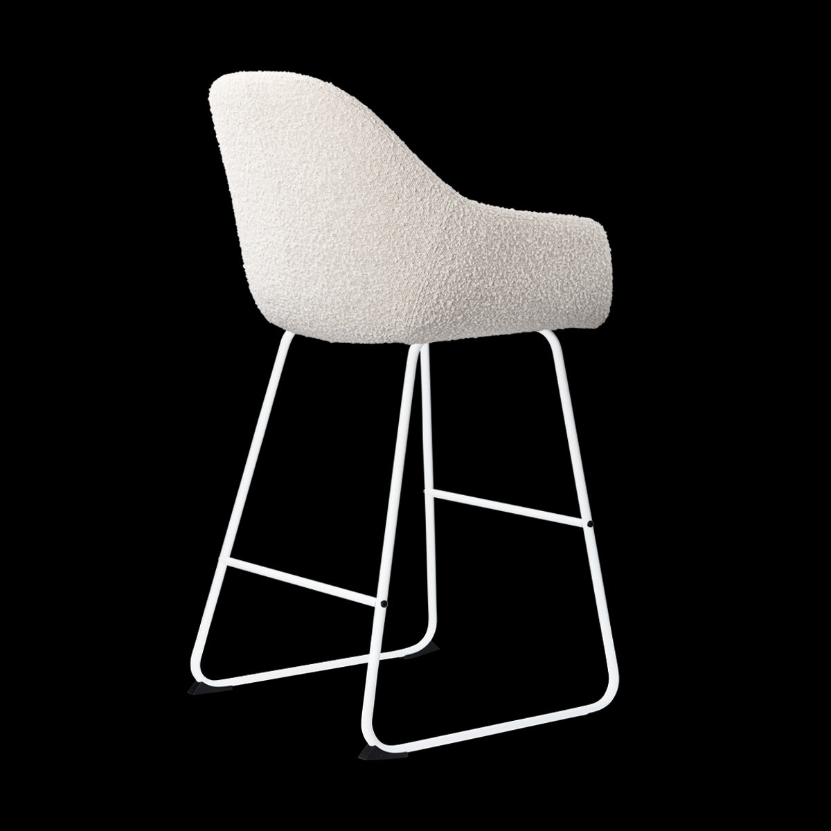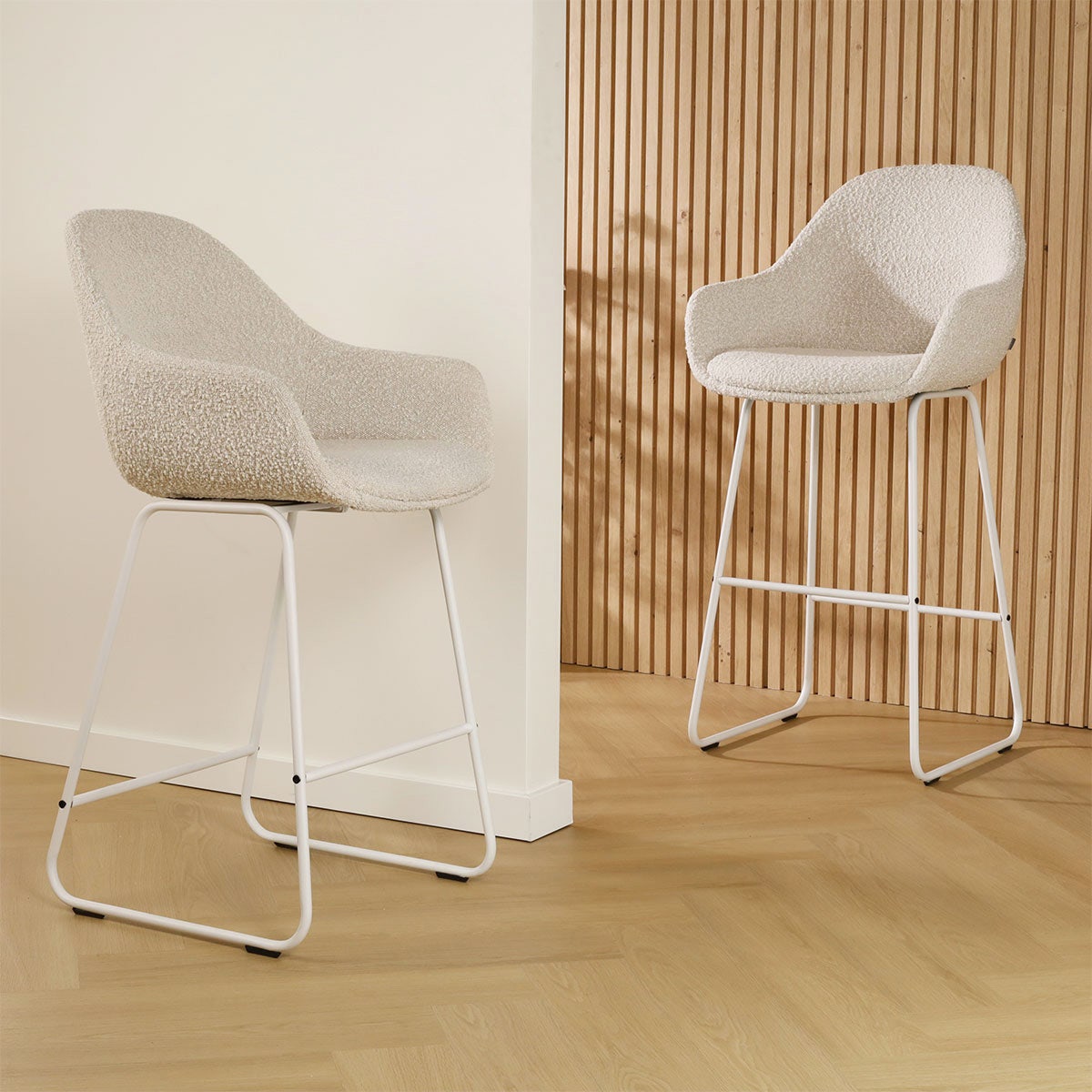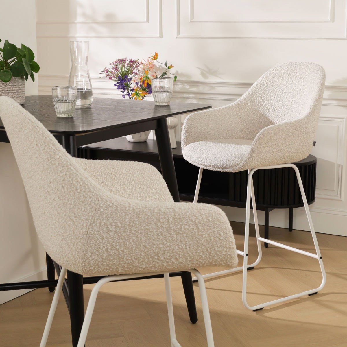 Comfortabele Nino-Mae barkruk in beige bouclé met witte poten.