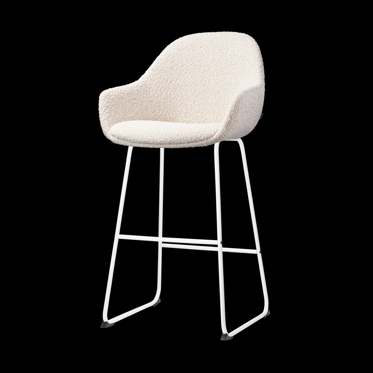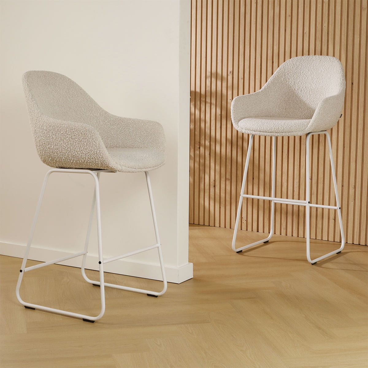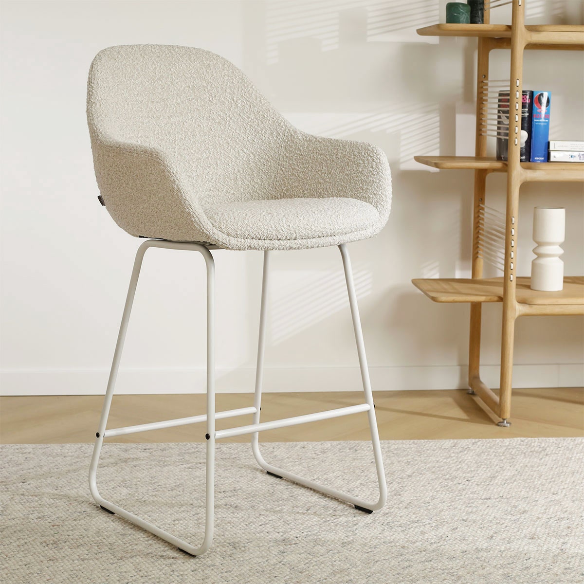 Moderne beige bouclé barkruk met witte poten en armleuning.