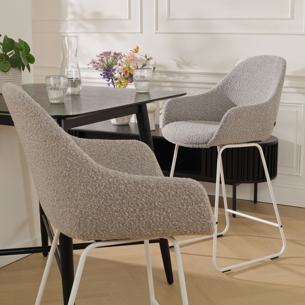 De Nino-Mae barkruk in taupe bouclé met witte metalen poten biedt een perfecte balans tussen stijl en comfort. De volledig gestoffeerde zitting, gecombineerd met zachte armleuningen, zorgt ervoor dat je heerlijk ontspannen zit, of je nu geniet van een kopje koffie of een snelle lunch aan het kookeiland. De moderne uitstraling wordt versterkt door het minimalistische ontwerp en de ronde vormen van de poten, die stabiliteit en een lichte, luchtige look combineren. Met een zithoogte van 65 cm is deze barkruk ideaal voor gebruik aan een keukenblad of kookeiland van 88 tot 95 cm hoog. Het stevige metalen onderstel en de ergonomische vorm van de zitting maken dit een duurzame en comfortabele keuze voor dagelijks gebruik. Of je nu een Scandinavische, moderne of meer klassieke interieurstijl hebt, de taupe bouclé zitting voegt een subtiele luxe toe aan je keuken. Het beste van alles? Deze barkruk is zeer eenvoudig in elkaar te zetten, zodat je hem snel in gebruik kunt nemen.