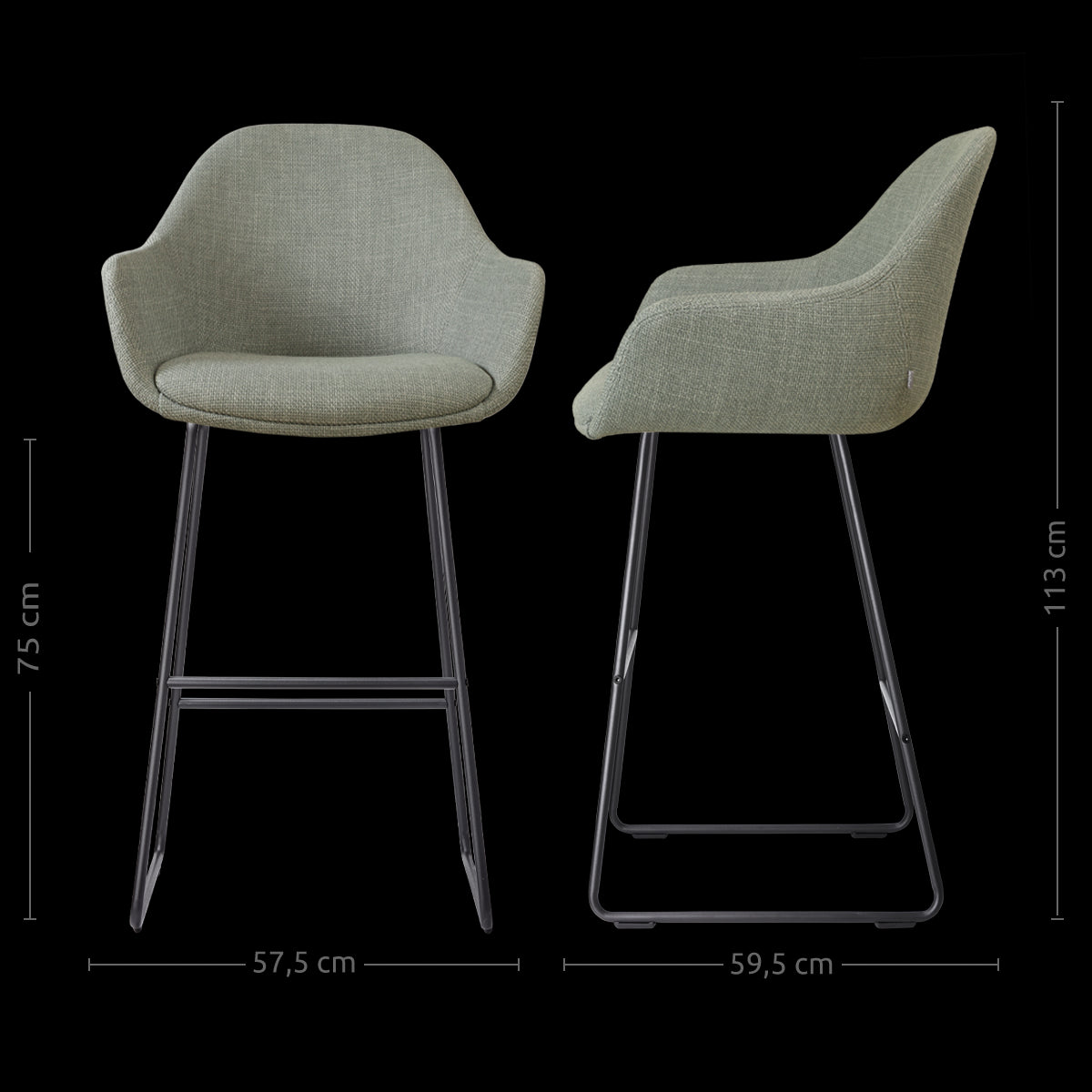 De barkruk heeft een comfortabele ronde zitting met armleuningen en het onderstel is voorzien van een voetsteun. Hierdoor worden je armen en rug goed ondersteund, zodat je urenlang aan de bar kan hangen. De saliegroene stoffen bekleding zorgt ervoor dat je extra zacht zit. De barkruk heeft een zwart onderstel gemaakt van metaal, wat stabiliteit biedt en de kruk een moderne uitstraling geeft. Dankzij de zithoogte van 75 centimeter is de Noa-Mae barkruk geschikt om te gebruiken aan een hoge eettafel of bar. Of je nu gaat voor een industriële look of een eigentijdse stijl in huis, met een paar barkrukken in het saliegroen zoals deze Nino-Mae til je jouw interieur naar een hoger niveau.