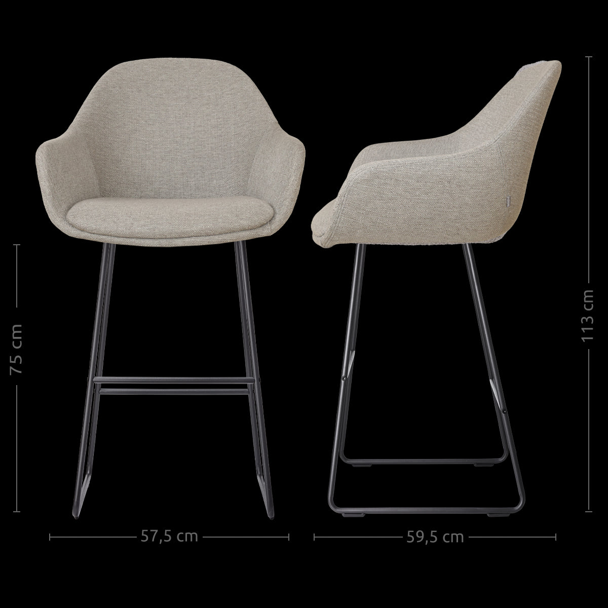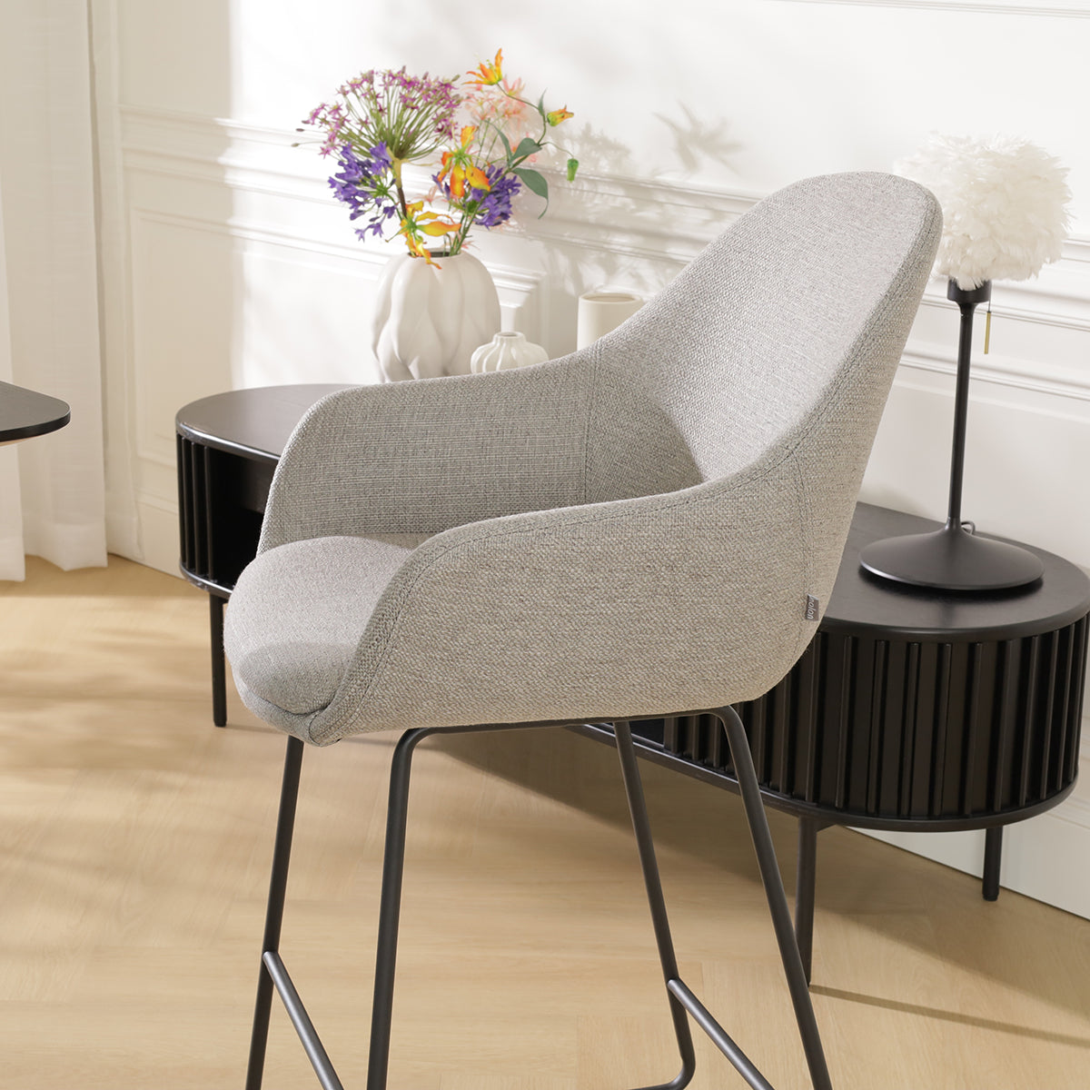 De Nino-Mae barkruk is de perfecte combinatie van comfort en stijl. Met een warme grijze stoffen zitting en stevige zwarte metalen poten past deze barkruk in elke moderne of Scandinavische inrichting. De ergonomische kuipzitting met armleuningen biedt uitstekende ondersteuning voor zowel je rug als armen, zodat je comfortabel kunt zitten, zelfs voor langere tijd. De zithoogte van 75 cm maakt de Nino-Mae ideaal voor gebruik aan een bar of hoge eettafel van circa 98-105 cm. De hoogwaardige stoffen bekleding geeft de barkruk een luxe uitstraling en voelt zacht aan. Dankzij de ronde lijnen en minimalistische afwerking zorgt de Nino-Mae voor een luchtige en elegante toevoeging aan je interieur. De metalen poten bieden stabiliteit en maken de barkruk stevig genoeg voor dagelijks gebruik, terwijl de geïntegreerde voetensteun bijdraagt aan het zitcomfort.