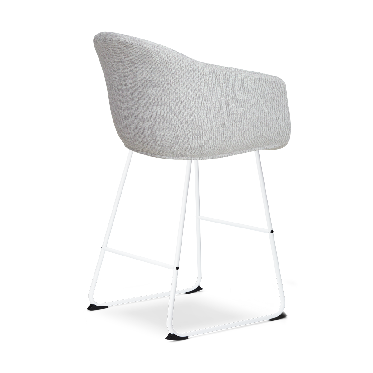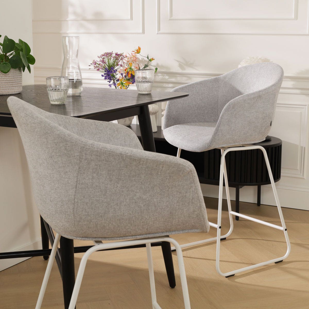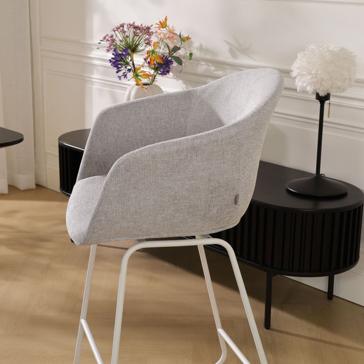 Deze kookeiland barkruk combineert een zachte stoffen zitting met een modern metalen onderstel en is daarmee een stijlvolle blikvanger in de keuken. Het metalen frame heeft een minimalistische en luchtige uitstraling. Dankzij de voetsteun op het frame heb je de keuze om je benen losjes te laten hangen of stevig neer te zetten. De ronde kuipzitting is ontworpen met armleuningen en een zachte stoffen bekleding om extra comfort te bieden terwijl je aan de bar zit. Met de zes verschillende kleuren stof kan je deze stijlvolle barkruk helemaal aan jouw interieur aanpassen, en ook het onderstel is in twee kleuren verkrijgbaar. Met een zithoogte van 65 cm is deze barkruk met armleuning geschikt voor aan een kookeiland. Zie jij jezelf al zitten met een kopje koffie?