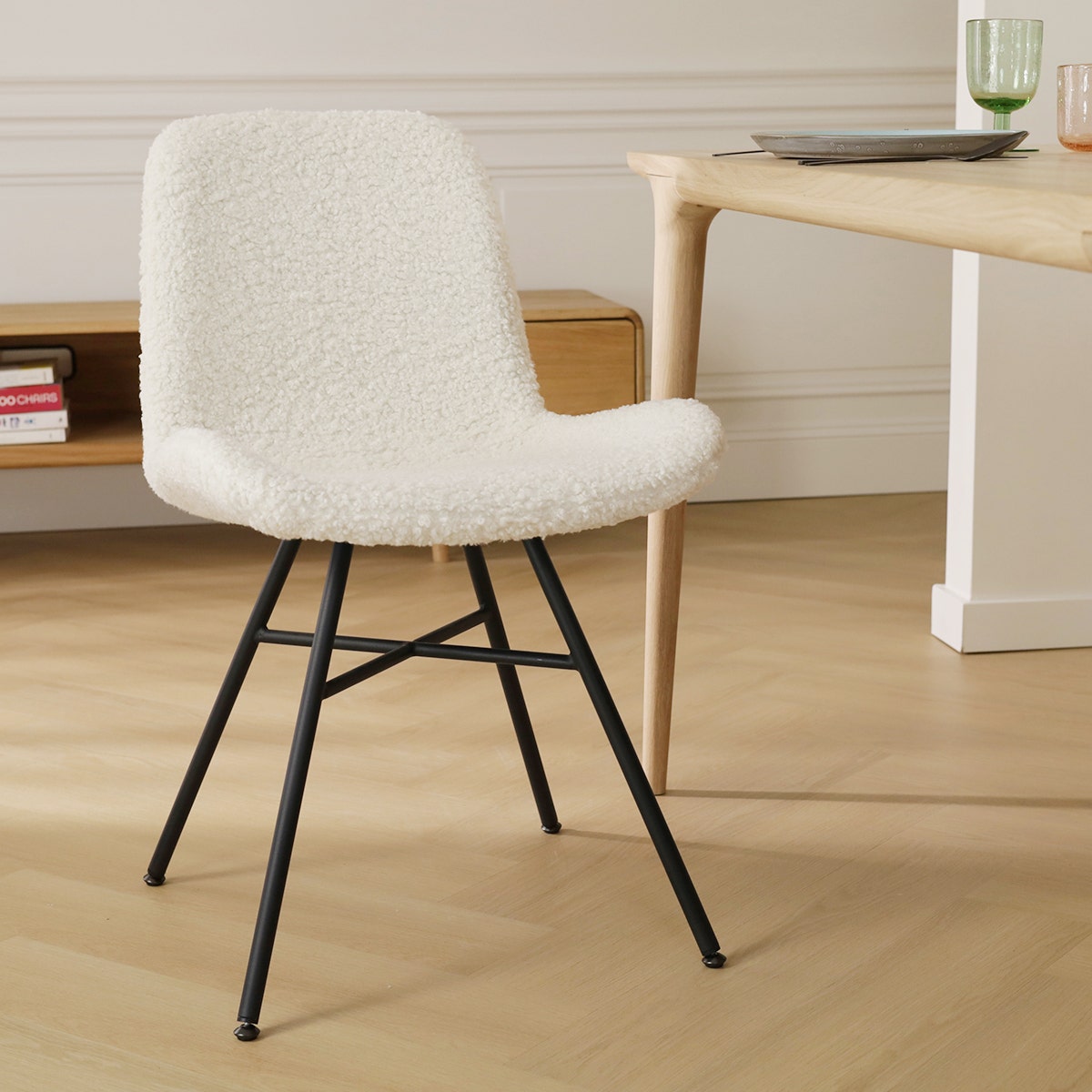 De gestoffeerde zitting is verkrijgbaar in een hoogwaardige kwaliteit stoffen. Bovendien heeft de zitting comfortabele rondingen en korte opstaande leuningen, voor nog meer comfort. De eetkamerstoel is afgewerkt met een zwart metalen onderstel en een leuk detail is het kruis in het midden. Kortom, zoek je een comfortabele eetkamerstoel waar je niet meer uit wilt? Dan is deze stoel wellicht iets voor jou!