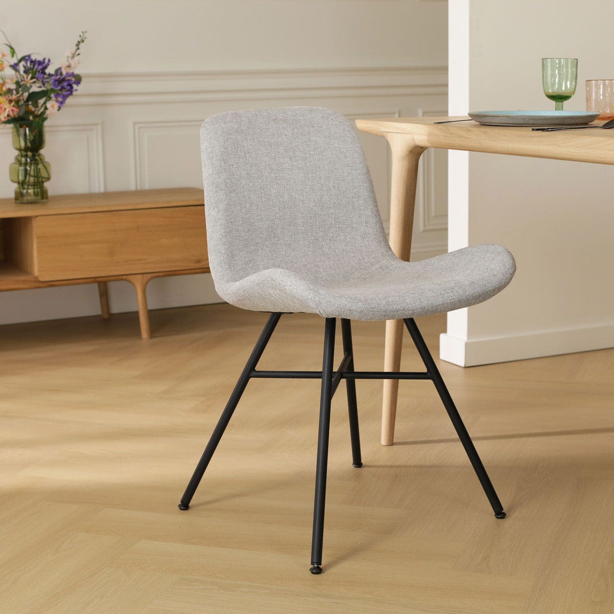 De zitting van deze eetkamerstoelen heeft comfortabele rondingen en een gevleugeld zitvlak voor extra comfort. Het sterke houten binnenwerk zorgt voor een stevige zit en een actieve zithouding aan de eettafel. Het strakke, moderne onderstel is gemaakt van metaal en heeft een kruisverbinding tussen de poten. De voetpootjes aan het einde van de poten zijn verstelbaar zodat de stoel op elke ondergrond stevig staat. De Noa-Fé eetkamerstoel is bekleed met zachte, hoogwaardige stof en is verkrijgbaar in maar liefst zeven verschillende kleuren en materialen. Of je nu op zoek bent naar een tijdloze beige eetkamerstoel of een trendy exemplaar met ribstof of teddystof, de Noa-Fé stoel is altijd een goede keuze.