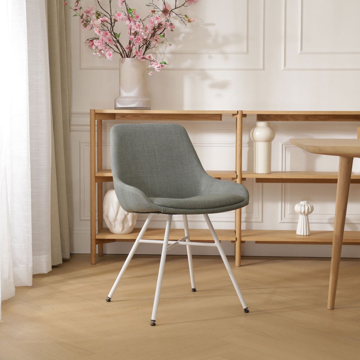 Met zijn volledig gestoffeerde zitting biedt deze stoel ultiem comfort, terwijl het stoere Scandinavische ontwerp met metalen poten en een kruisverbinding zorgt voor stabiliteit en duurzaamheid. De stoel heeft een zithoogte van 47 cm en een zitdiepte van 40 cm, waardoor hij ideaal is voor een comfortabele zithouding. De witte poten geven de stoel een frisse uitstraling die gemakkelijk te combineren is met verschillende interieurstijlen. Zonder armleuningen is de Noa-Isa ruimtebesparend en eenvoudig onder iedere eettafel te schuiven. Deze stoel is zeer eenvoudig in elkaar te zetten, wat bijdraagt aan het gebruiksgemak. Met een hoogte van 85,5 cm past hij perfect in de meeste eetruimtes. De Noa-Isa is verkrijgbaar in diverse kleuren en materialen, maar deze saliegroene variant met witte poten is een bijzondere eyecatcher voor wie een vleugje kleur in huis wil brengen.