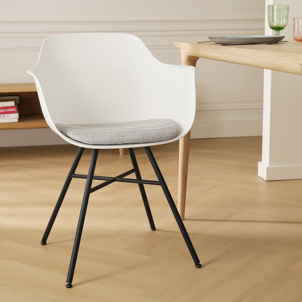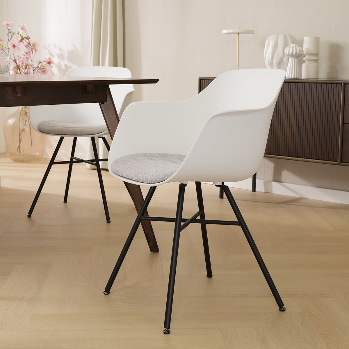Het leuke is dat je deze stoel zelf kunt samenstellen. Je kunt namelijk kiezen uit meerdere kleuren vaste zitkussens om jouw perfecte kuipstoel samen te stellen. Hierdoor creëer je een frisse uitstraling in je interieur. Bovendien heeft de zitting armleuningen die jouw extra comfort bieden. De eetkamerstoel is afgewerkt met een metalen onderstel met een kruis in het midden als leuk detail. Zie jij jezelf al genieten in deze comfortabele eetkamerstoel?