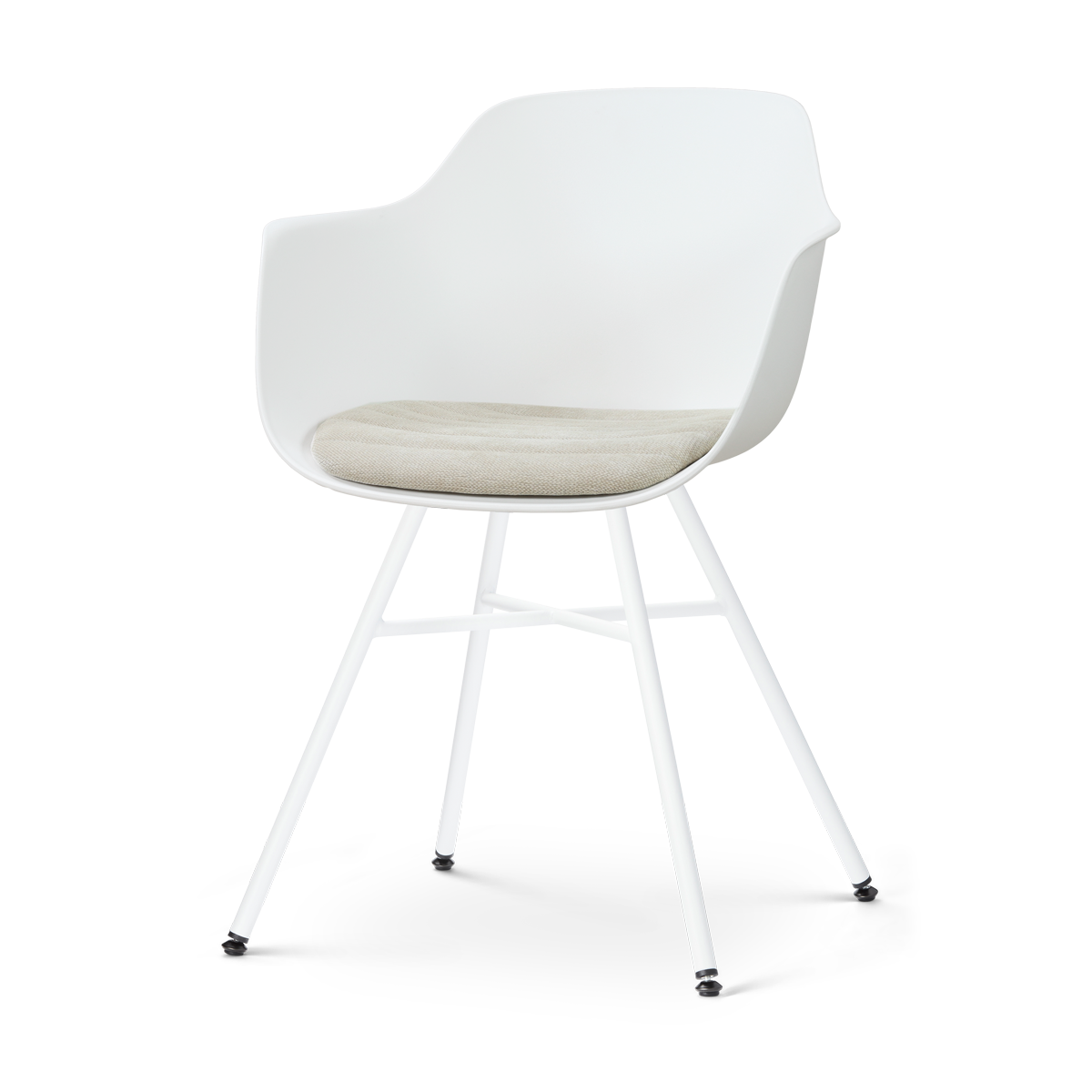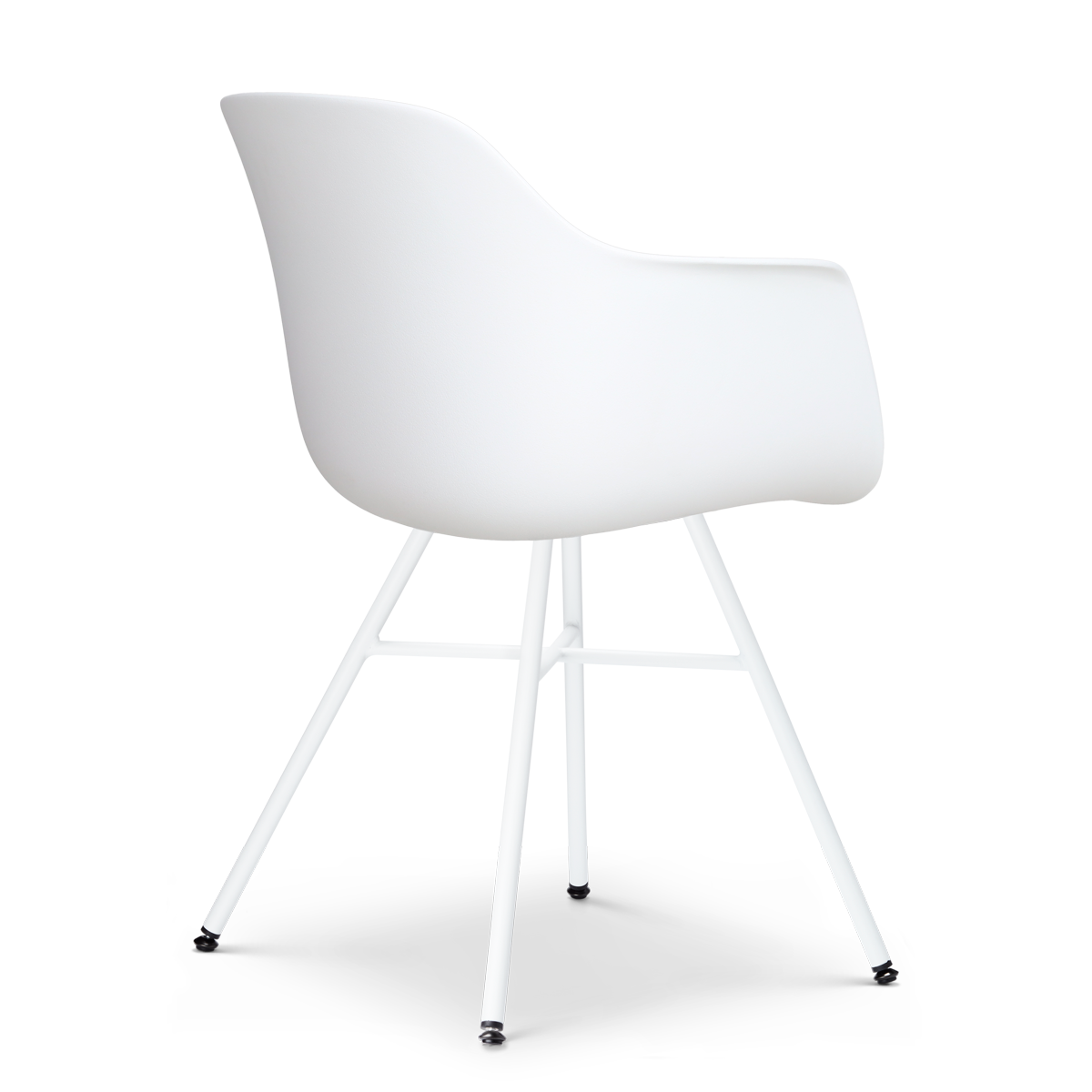 - De stoel is afgewerkt met een wit metalen onderstel met een kruis als detail