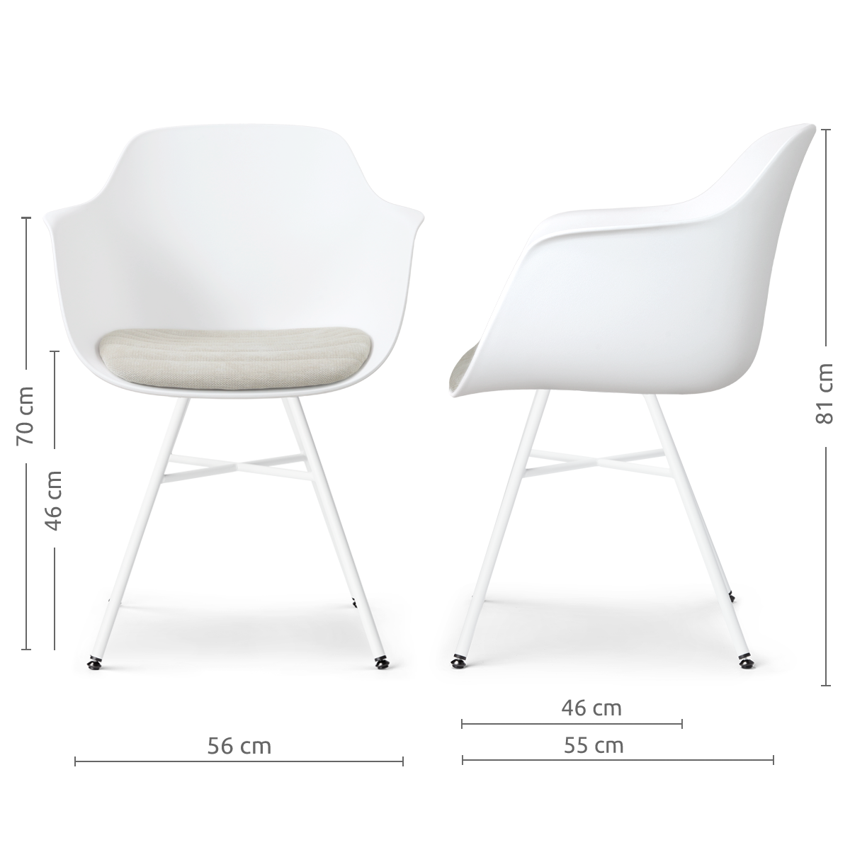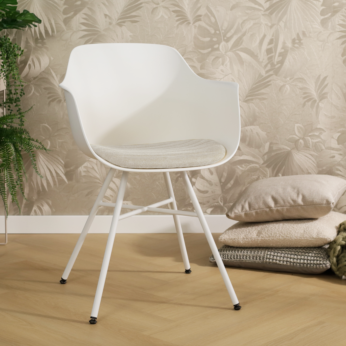 Het leuke is dat je deze stoel zelf kunt samenstellen. Je kunt namelijk kiezen uit meerdere kleuren vaste zitkussens om jouw perfecte kuipstoel samen te stellen. Hierdoor Creëer je een frisse uitstraling in je interieur. Bovendien heeft de zitting armleuningen die jouw extra comfort bieden. De eetkamerstoel is afgewerkt met een metalen onderstel met een kruis in het midden als leuk detail. Zie jij jezelf al genieten in deze comfortabele eetkamerstoel?