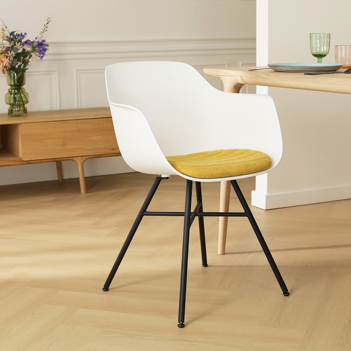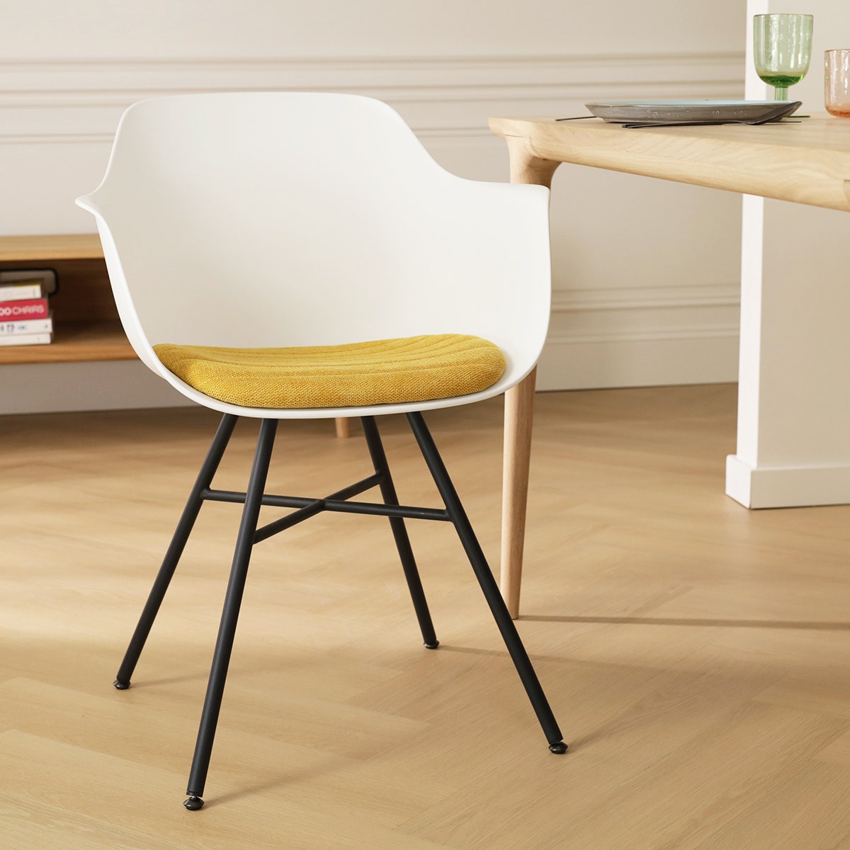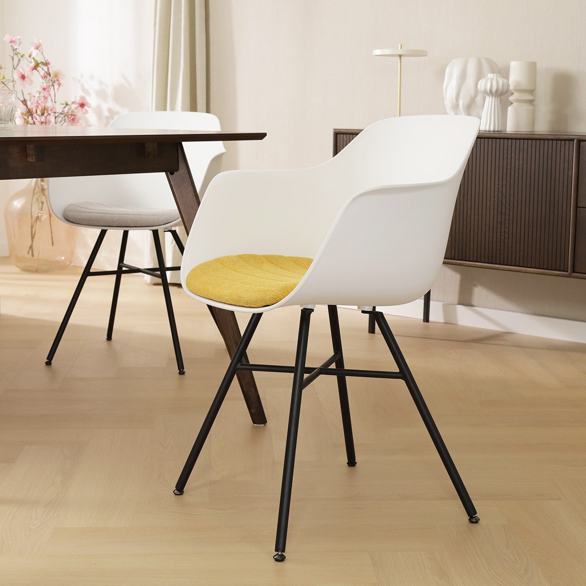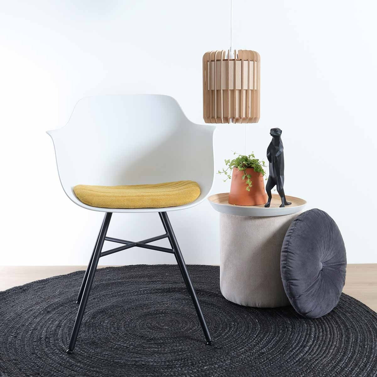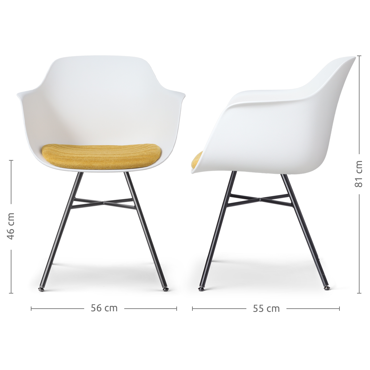 Het leuke is dat je deze stoel zelf kunt samenstellen. Je kunt namelijk kiezen uit meerdere kleuren vaste zitkussens om jouw perfecte kuipstoel samen te stellen. Hierdoor creëer je een frisse uitstraling in je interieur. Bovendien heeft de zitting armleuningen die jouw extra comfort bieden. De eetkamerstoel is afgewerkt met een metalen onderstel met een kruis in het midden als leuk detail. Zie jij jezelf al genieten in deze comfortabele eetkamerstoel?